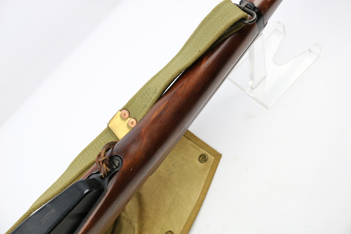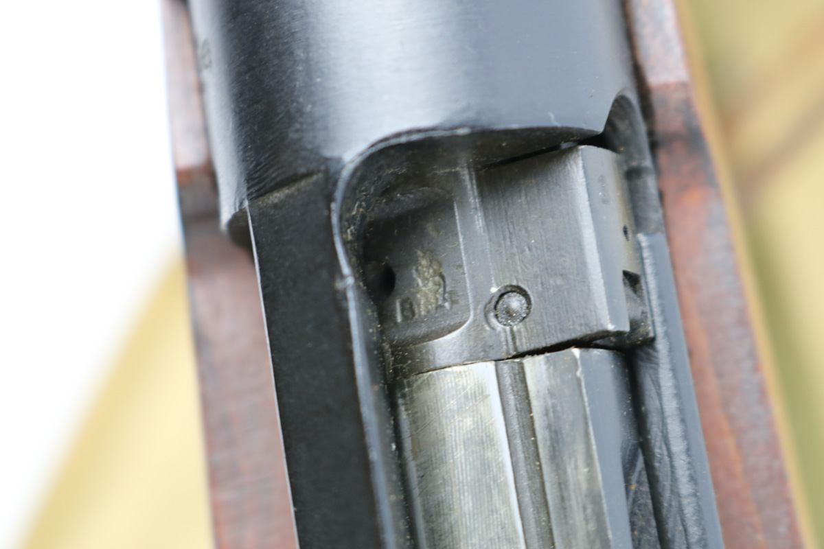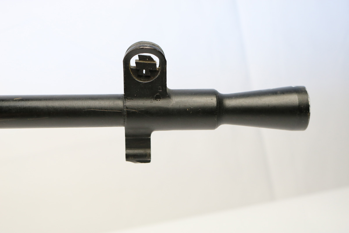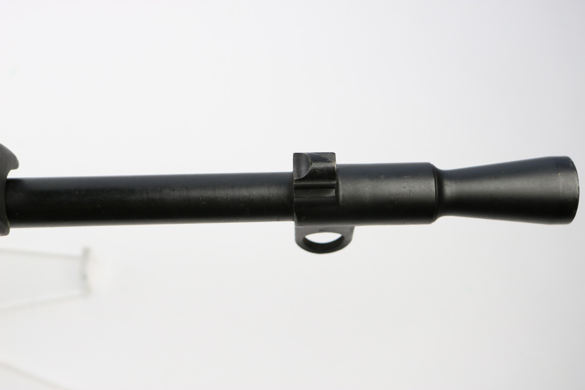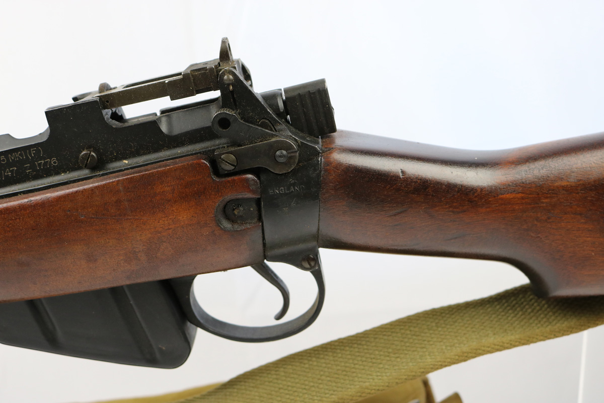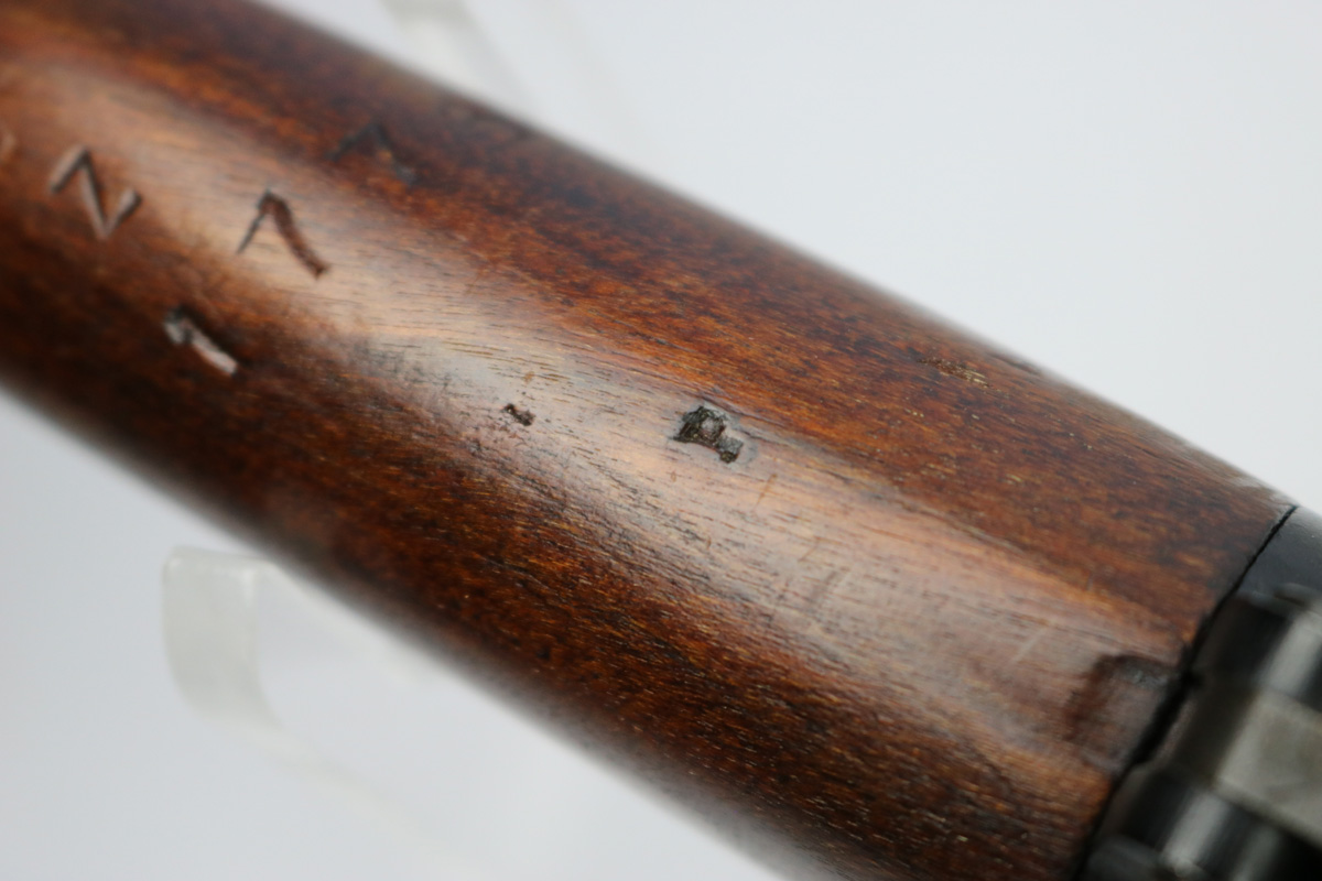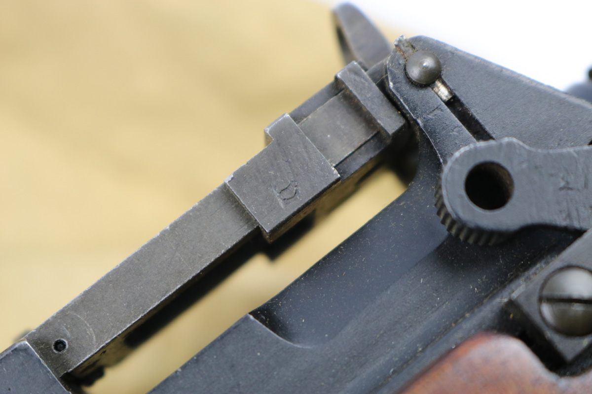 6/14/18 – This is an original 1947 production Enfield No. 5 MK I Jungle Carbine. Comes complete with an original bayonet with scabbard & leather frog. Also has a sling and canvas bag (see photos). The receiver is stamped “F” for the Royal Ordnance Factory, and dated 7/47 (1947). This is the shorter and lighter version of the No.4 MK I. with a shortened forend and handguard. The finish on this rifle is excellent. The stock has no notable flaws, besides a few small indents on the underside of the stock. Some speculate this is a “kill count”. The action is smooth and the black finish is excellent. The bore has strong rifling and very clean with minimal signs of use.