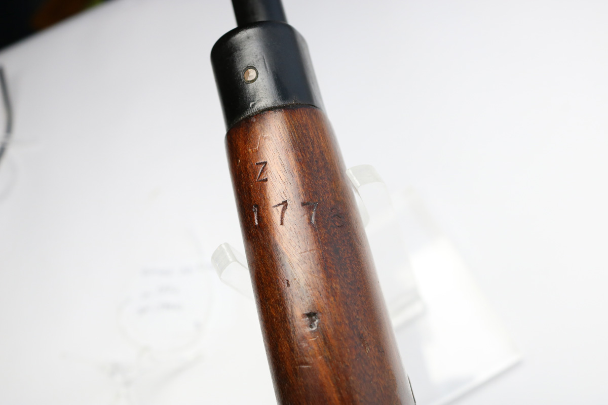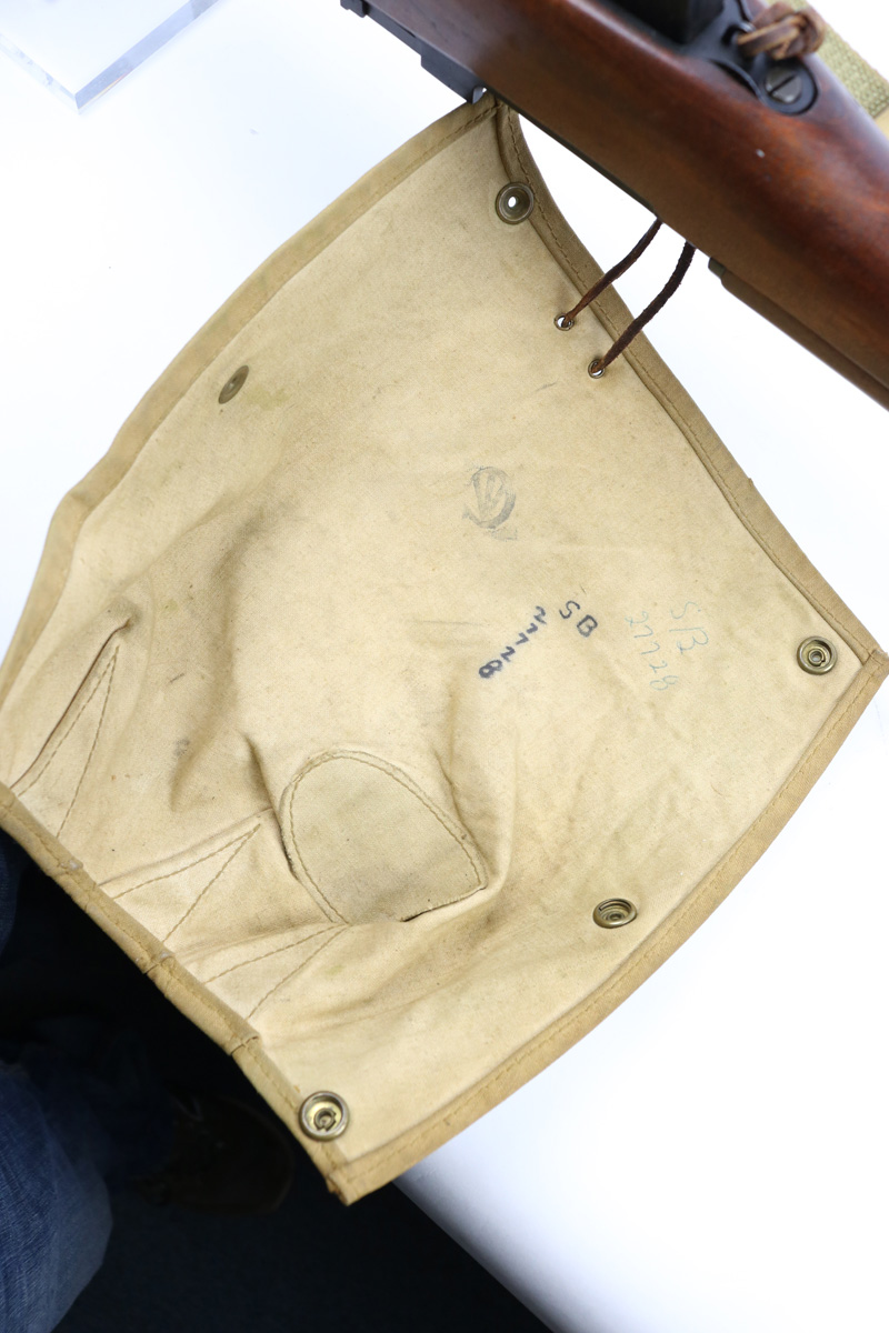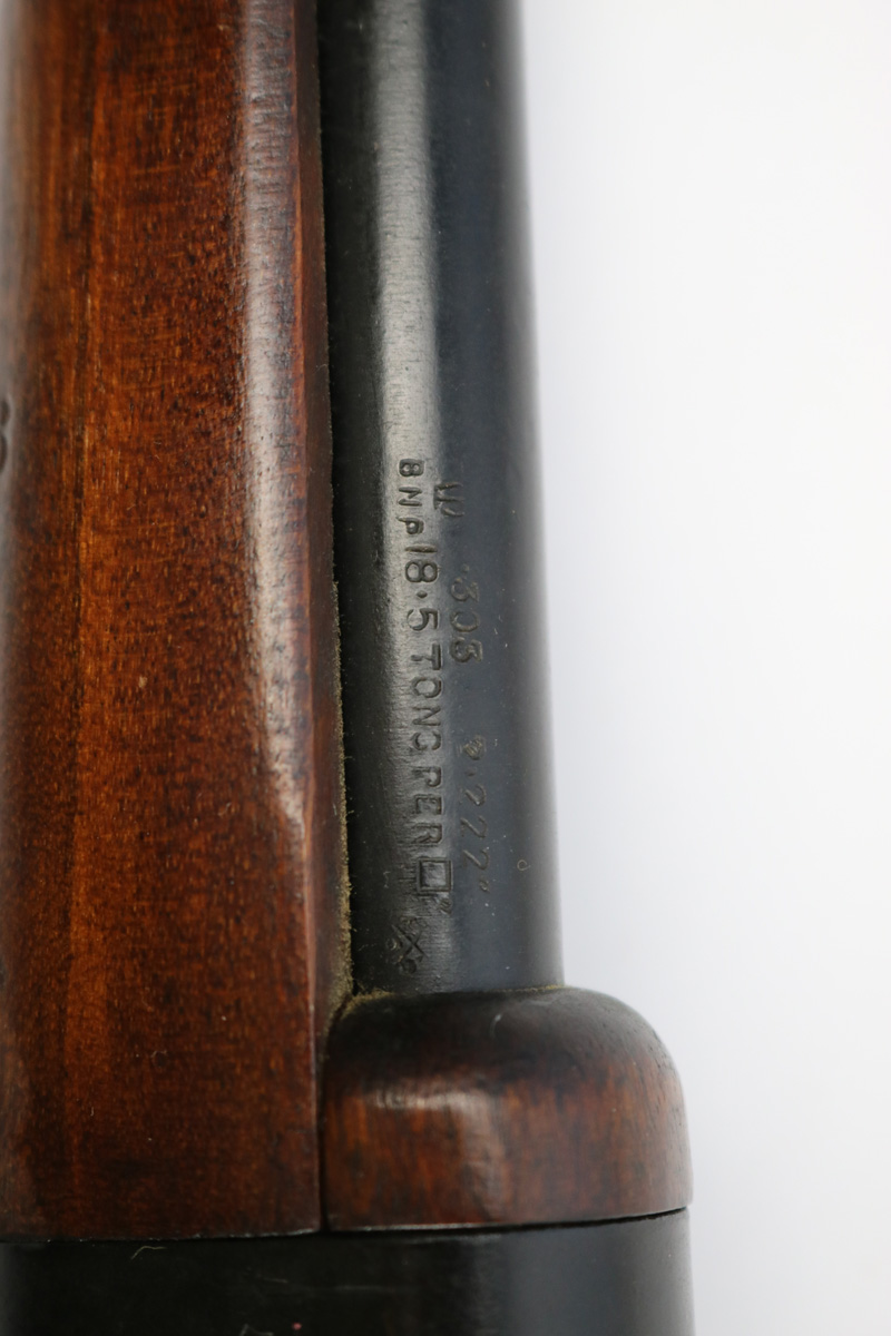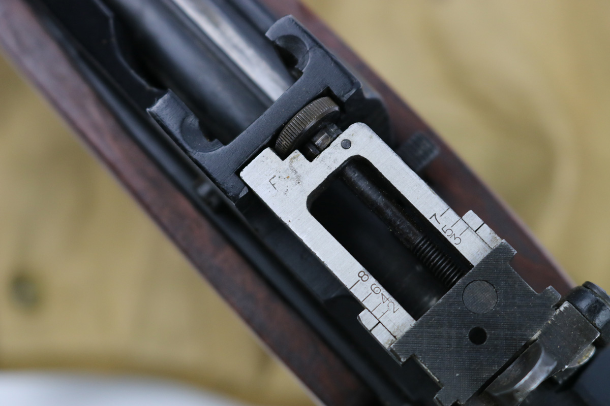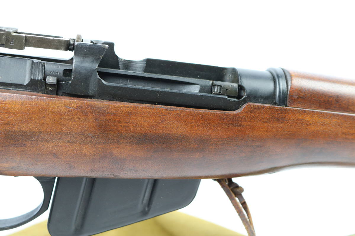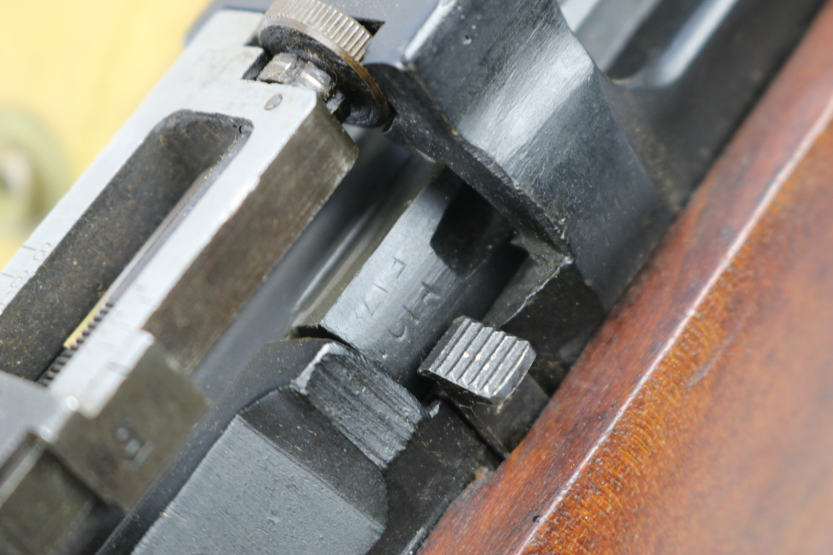 6/14/18 – This is an original 1947 production Enfield No. 5 MK I Jungle Carbine. Comes complete with an original bayonet with scabbard & leather frog. Also has a sling and canvas bag (see photos). The receiver is stamped “F” for the Royal Ordnance Factory, and dated 7/47 (1947). This is the shorter and lighter version of the No.4 MK I. with a shortened forend and handguard. The finish on this rifle is excellent. The stock has no notable flaws, besides a few small indents on the underside of the stock. Some speculate this is a “kill count”. The action is smooth and the black finish is excellent. The bore has strong rifling and very clean with minimal signs of use.