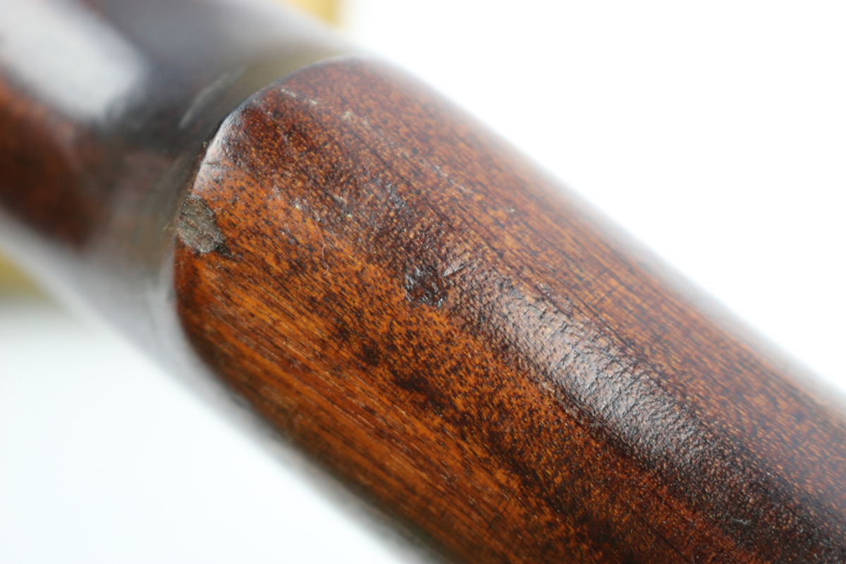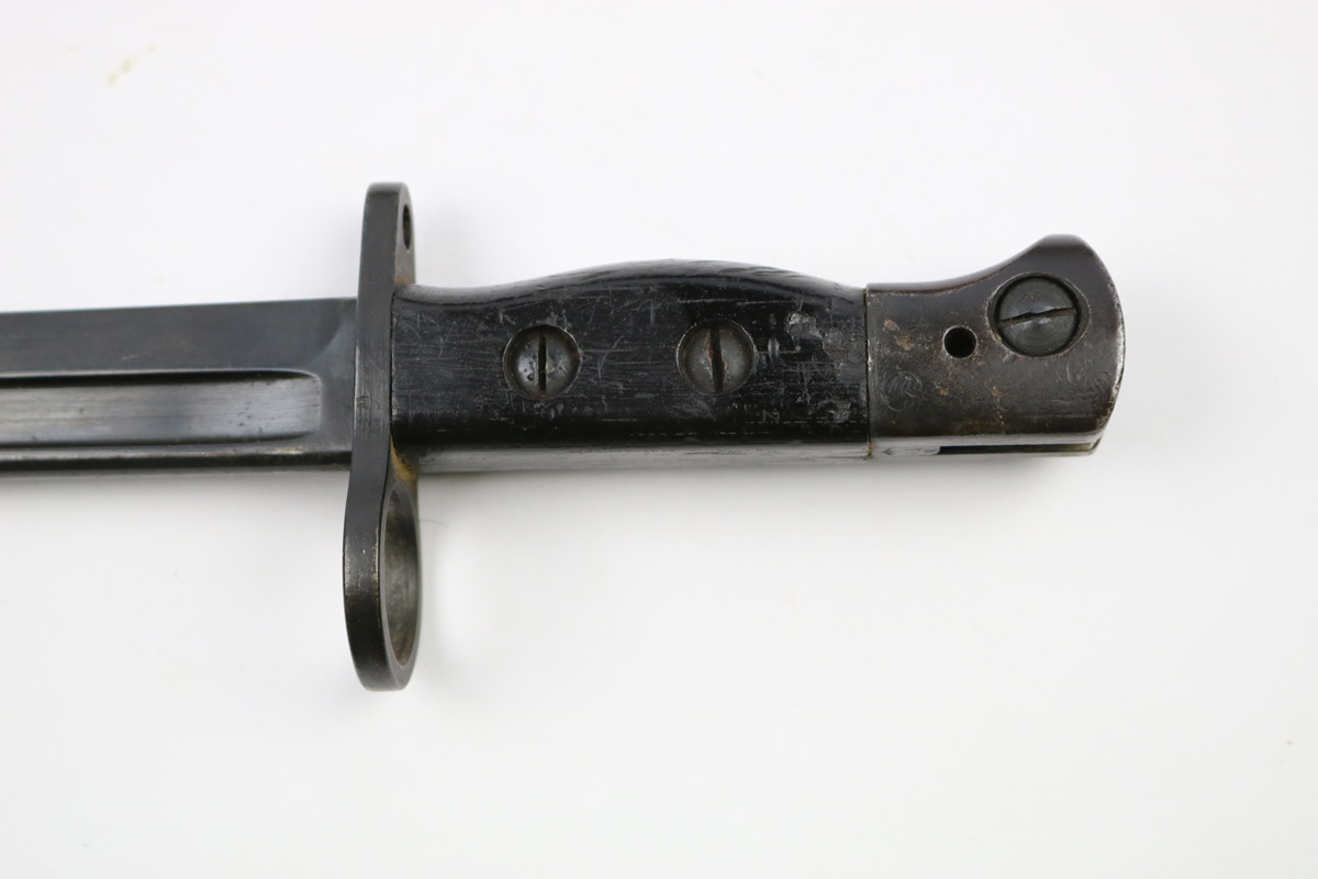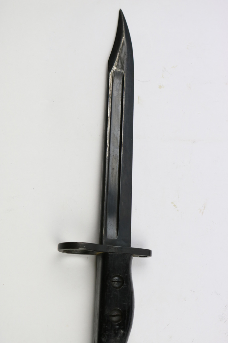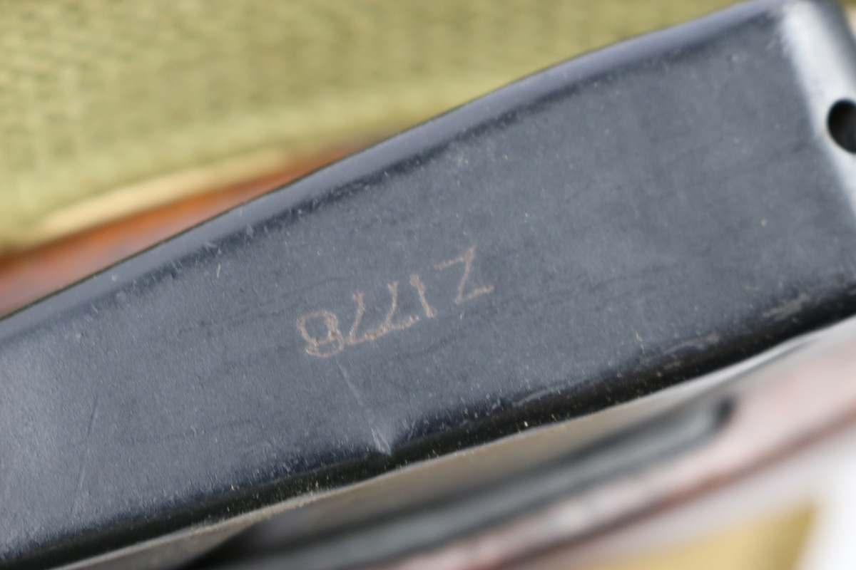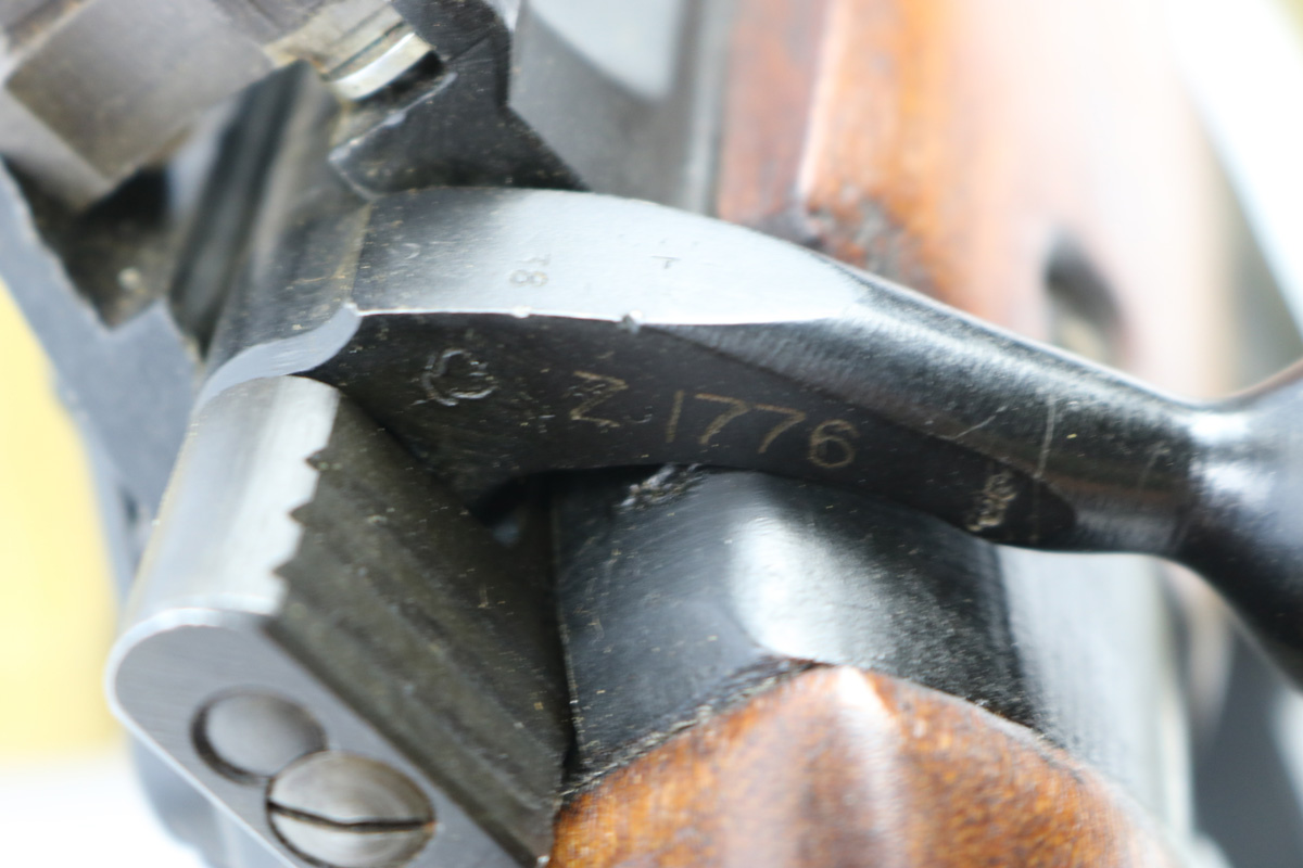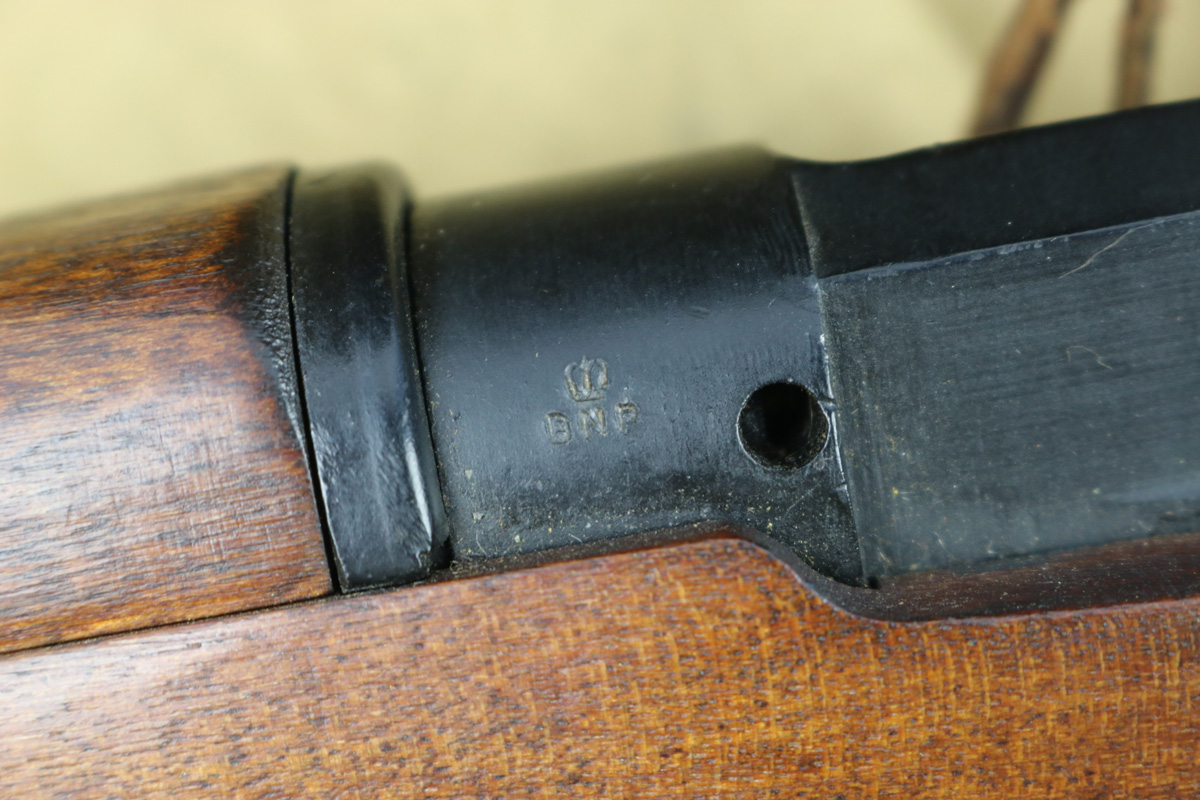 6/14/18 – This is an original 1947 production Enfield No. 5 MK I Jungle Carbine. Comes complete with an original bayonet with scabbard & leather frog. Also has a sling and canvas bag (see photos). The receiver is stamped “F” for the Royal Ordnance Factory, and dated 7/47 (1947). This is the shorter and lighter version of the No.4 MK I. with a shortened forend and handguard. The finish on this rifle is excellent. The stock has no notable flaws, besides a few small indents on the underside of the stock. Some speculate this is a “kill count”. The action is smooth and the black finish is excellent. The bore has strong rifling and very clean with minimal signs of use.