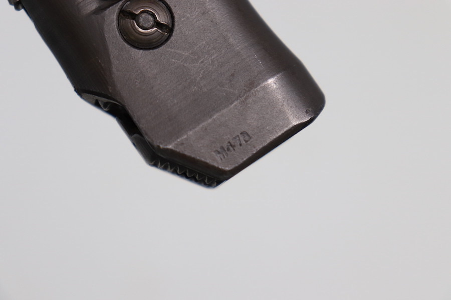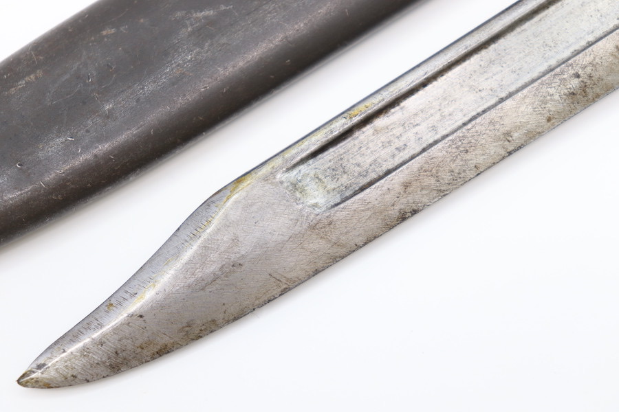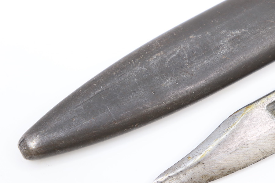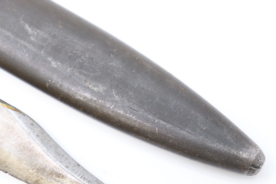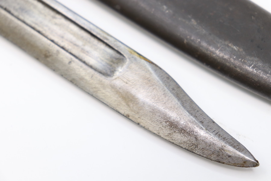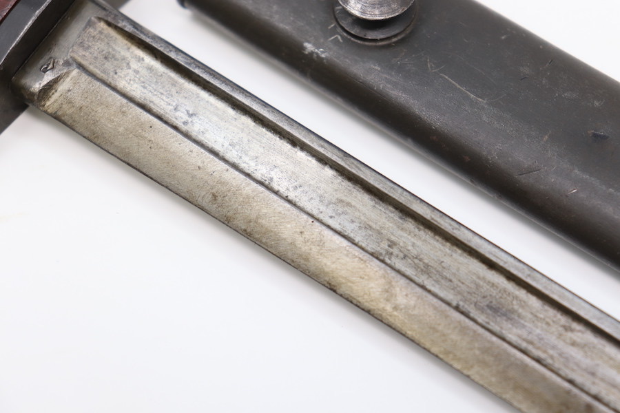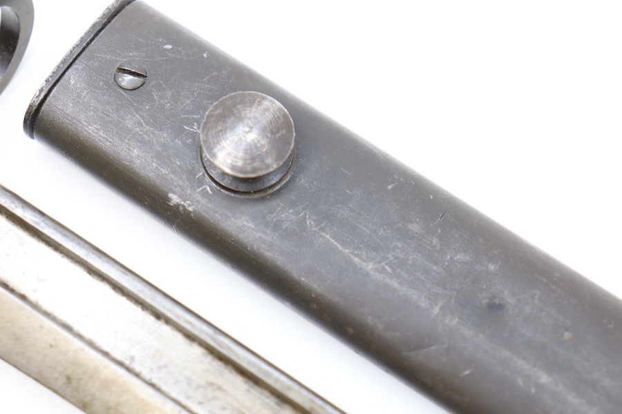 9/22/23 – This is a British No7 Mk1 Land Service Bayonet. The blade has an honest wear patina along both sides. The edge has minor sharpening. Ricasso is stamped No7 Mk2/L. Cross guard and pommel have light wear scratches with no major issues. The scabbard has minor finish loss on both sides but as well as small dents but with no rust or pitting. Overall great condition.