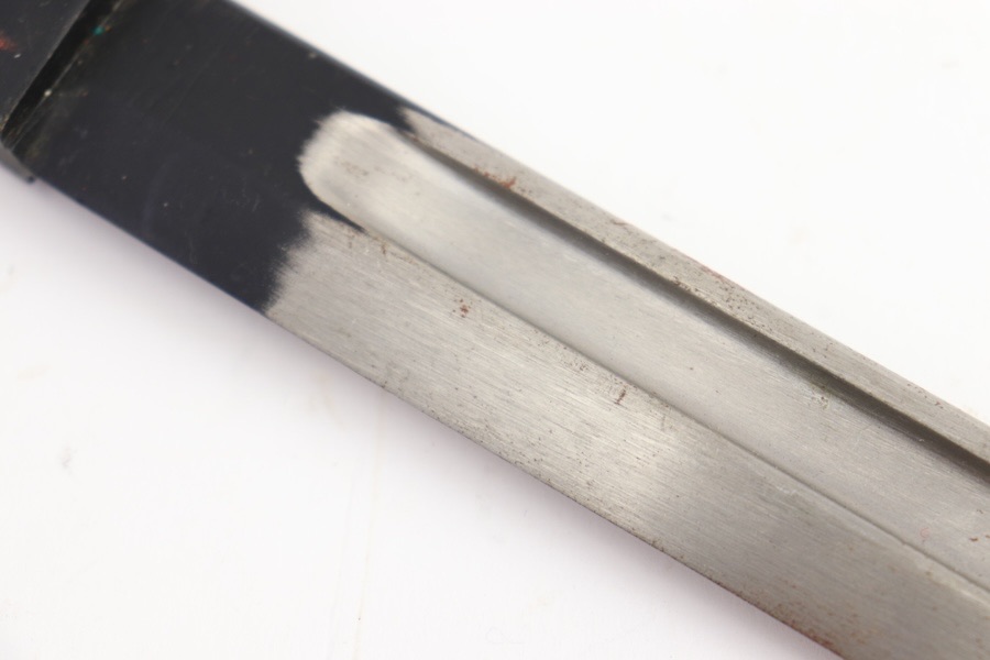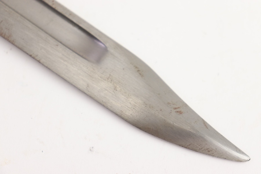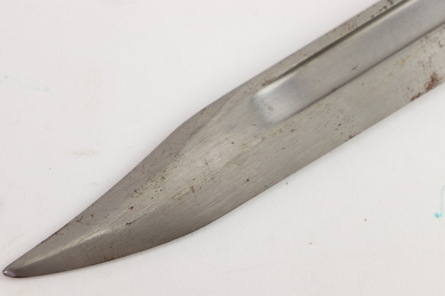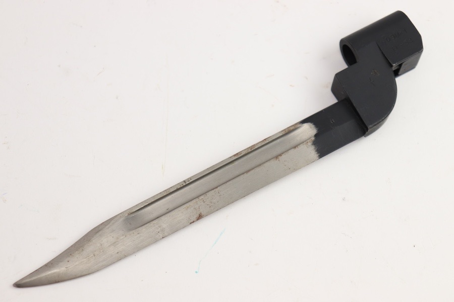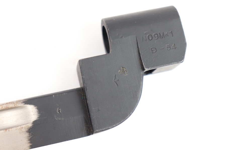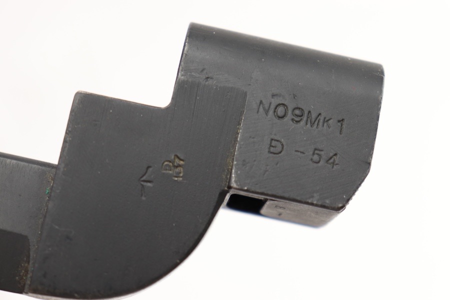 9/29/23 – This is an original and great condition No9 Mk1 Bayonet. Overall no major issues Just spots of surface patina along the blade. Socket is stamped No9 Mk1 D-54.