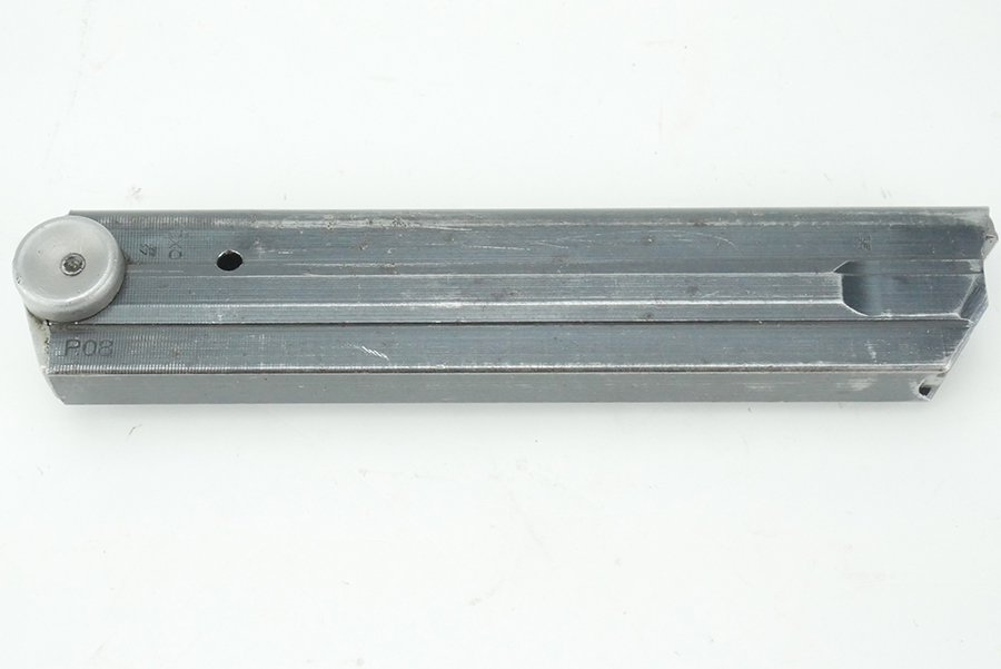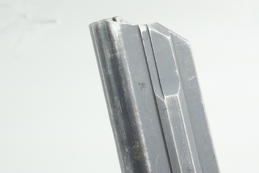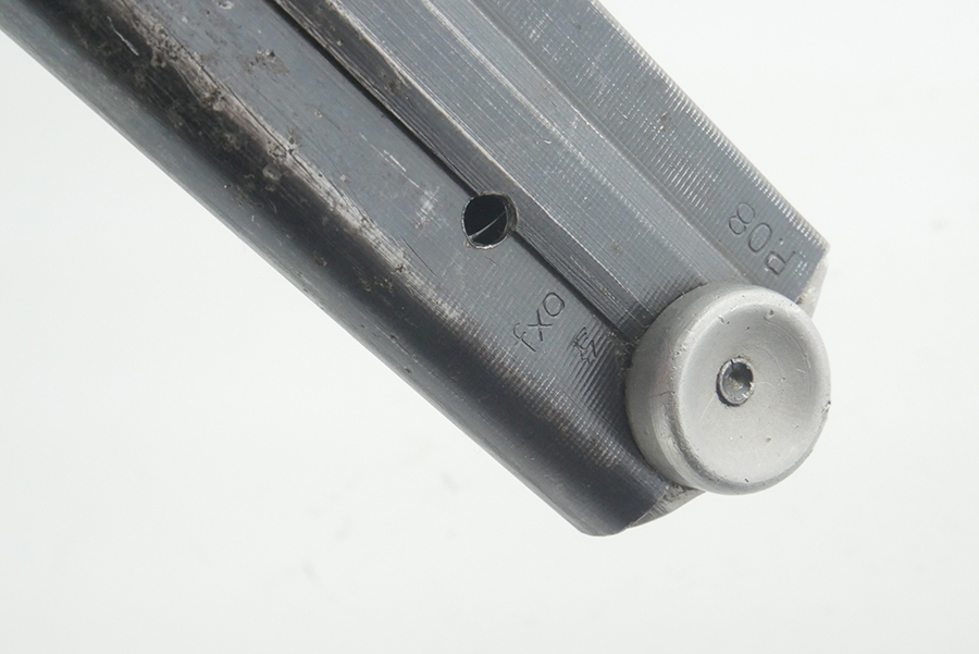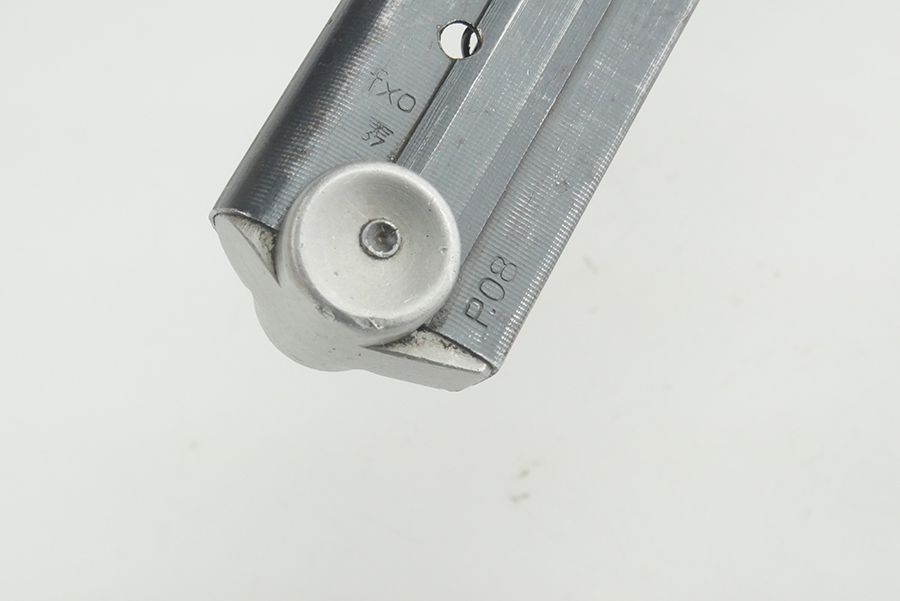8/26/24 – This is an original WW2 production luger magazine with an aluminum base that has no serial number. The magazine is in very nice condition overall, with wear consistent with that of standard use. There is a small amount of light pitting along the right side. This however is not impacting the functionality of this mag, as the spring is still strong. The side of the tube is “fxo” “P.08”. FXO is a code for Haenel, who made high quality magazines during WW2.