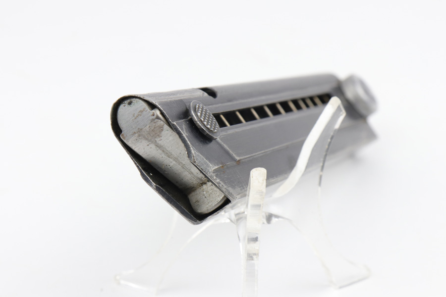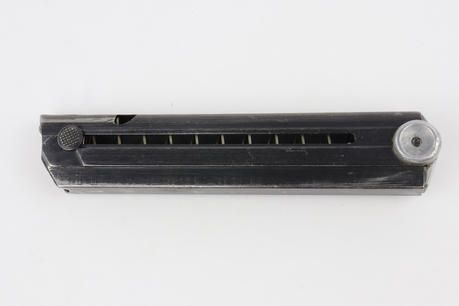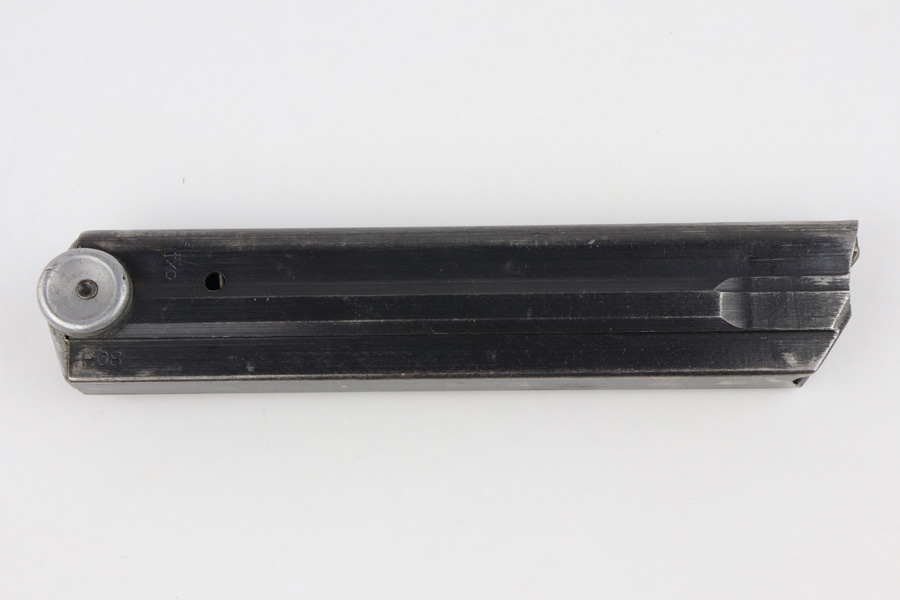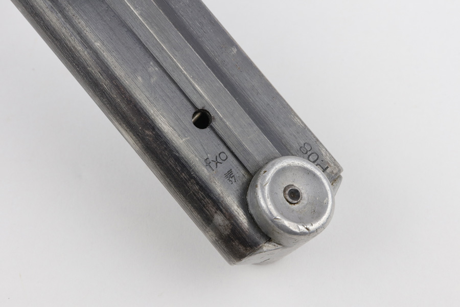 6/21/19 – This is an original FXO (Haenel) luger magazine from WWII. The magazine has an aluminum base with no serial numbers or proof stamps. The blued tube is “fxo” stamped with two eagle/37 proof stamps on the left side. The spring is strong and fully functional. No rust or pitting, only light bluing loss on the tube.