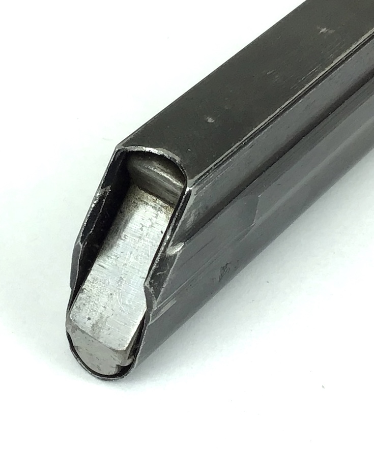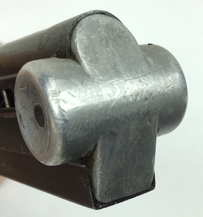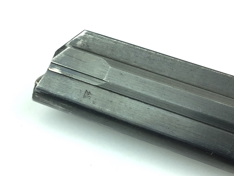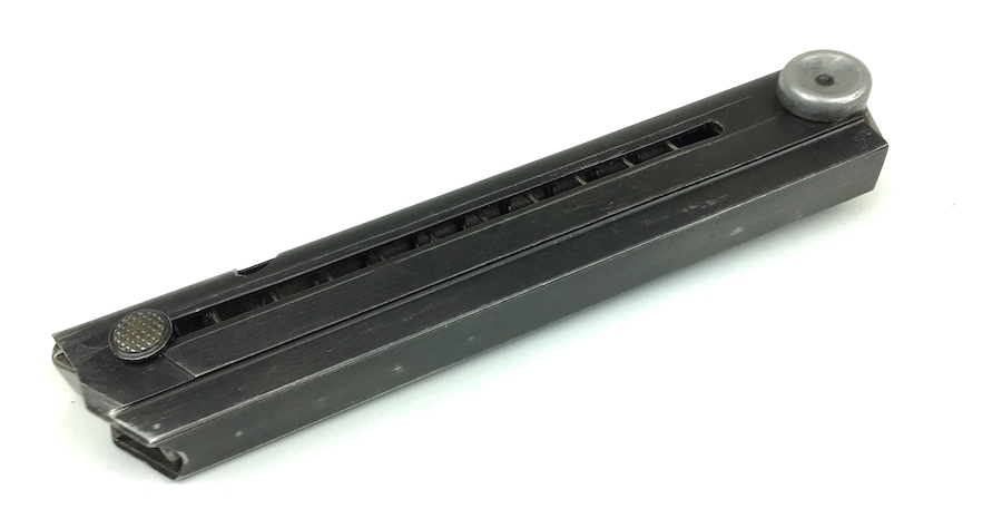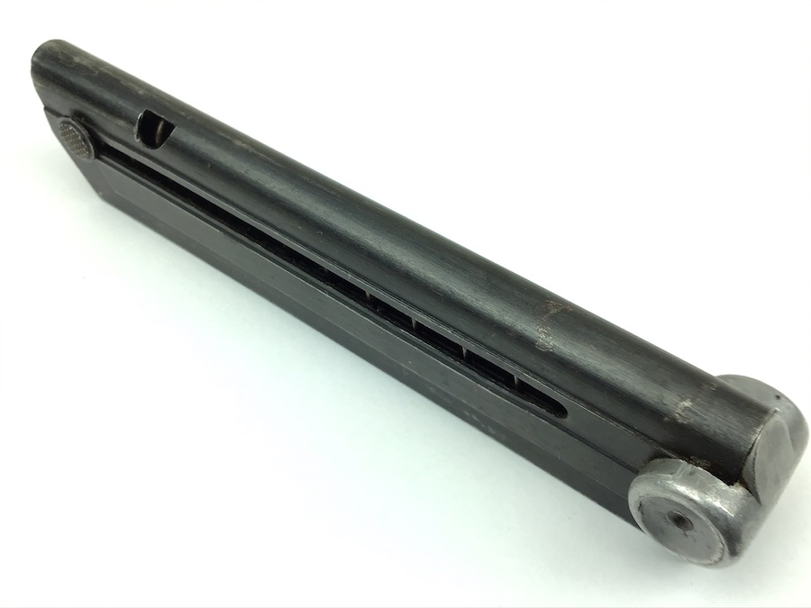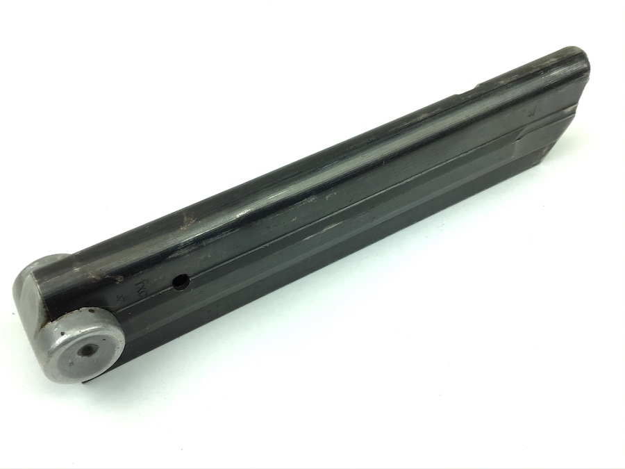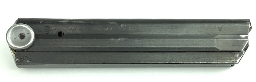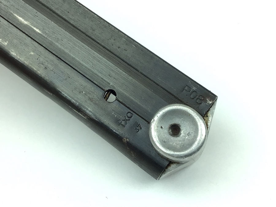 7/7/20 – This is an original WW2 production luger magazine with an aluminum base that has no serial number. The magazine is in very nice condition overall with no major flaws, rust , or pitting. The side of the tube is “fxo” “P.08” as well as two Eagle 37 proof stamps. FXO is a code for Haenel, who made high quality magazines during WW2. All original and fully functional.