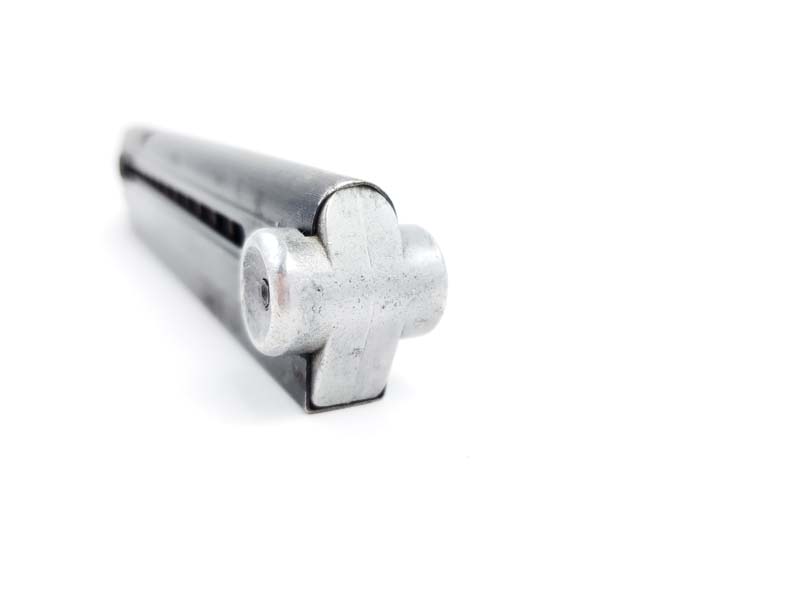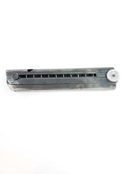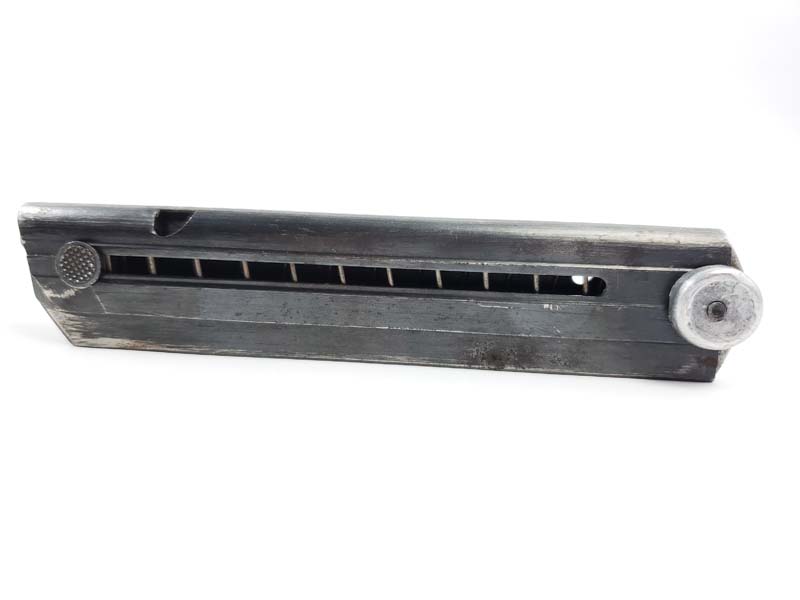 3/23/20 – This is an original WW2 production FXO Luger magazine. The magazine has a blued frame and an aluminum base. The base is non-numbered, which is very desirable. The base does not appear to be altered. FXO stamped with two eagle/37 proofs. The spring is strong and fully functional. Only one small areas of pitting on the right side of the blued tube. Priced accordingly.