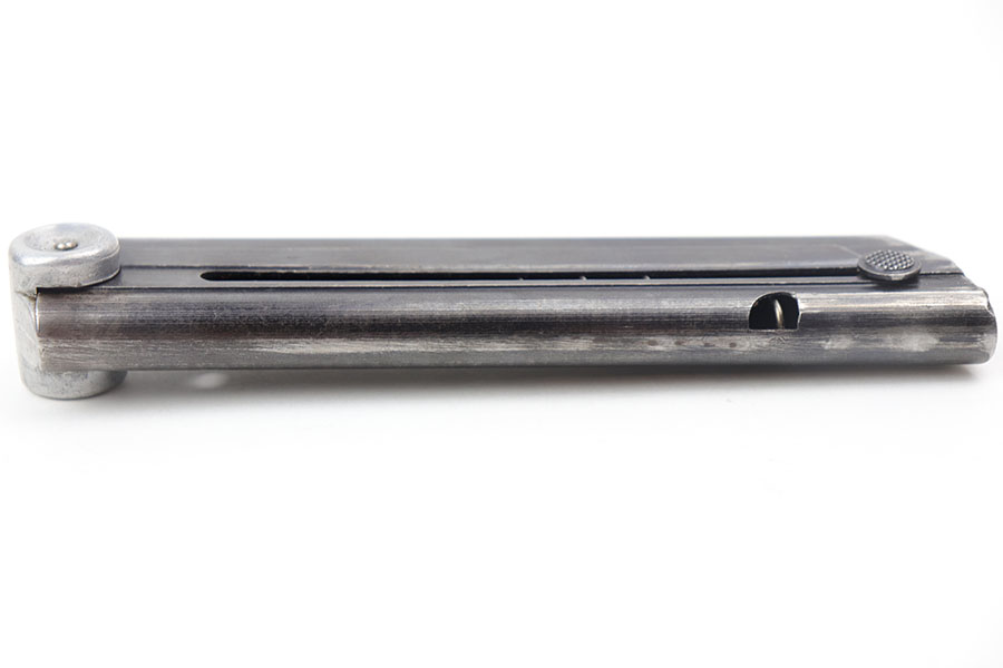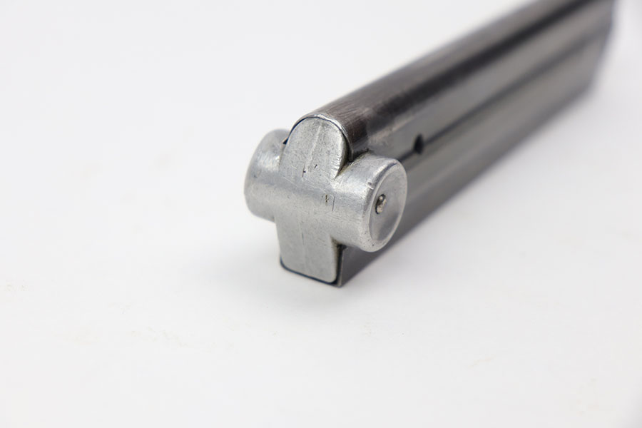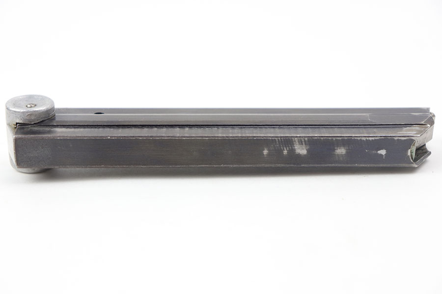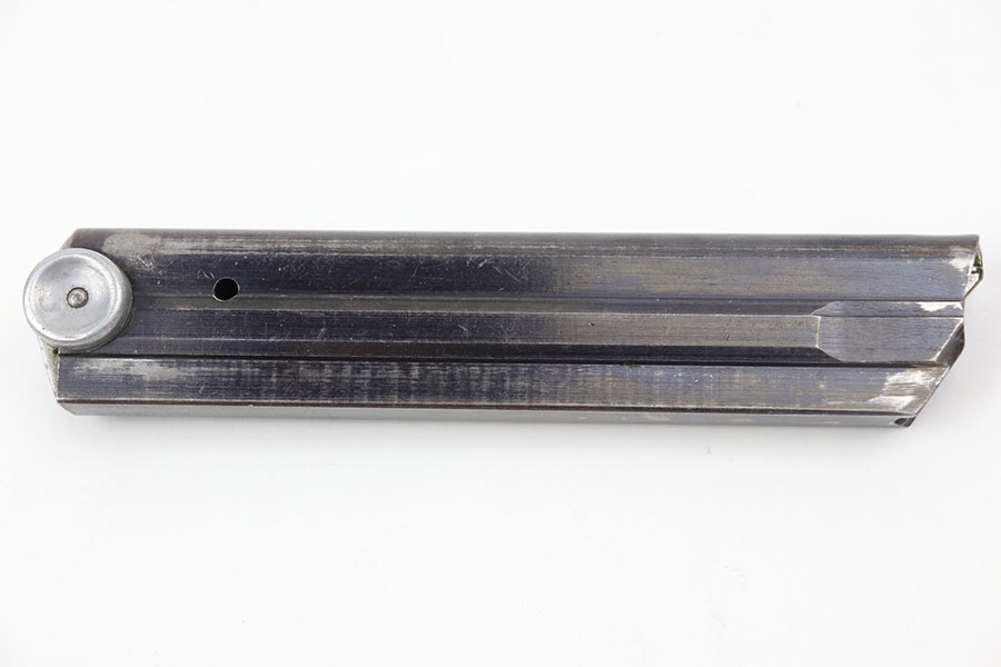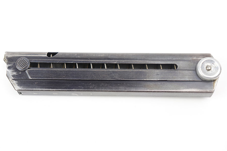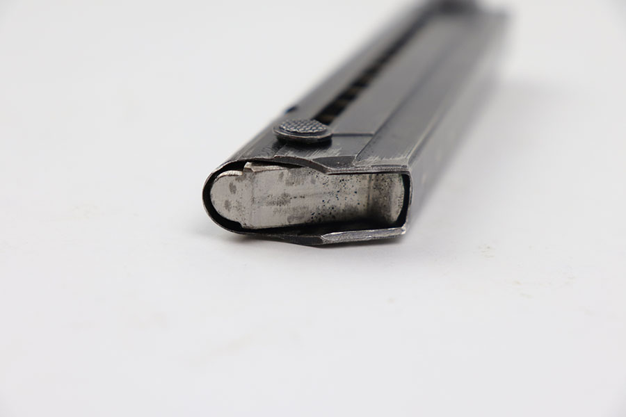 8/18/20 – This is a fairly rare and desirable Police luger magazine from WW2. The magazine has a nice blued frame with minimal wear. No rust or pitting. The aluminum base is completely blank, and shows no signs of ever being stamped. The concave pin through the middle of the base indicates police issue. Strong fully functional spring.