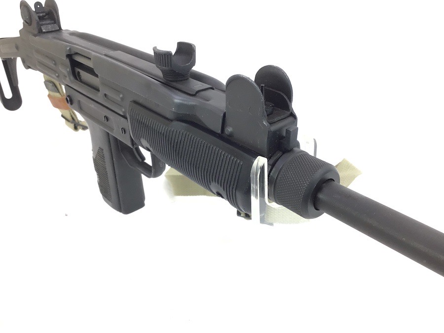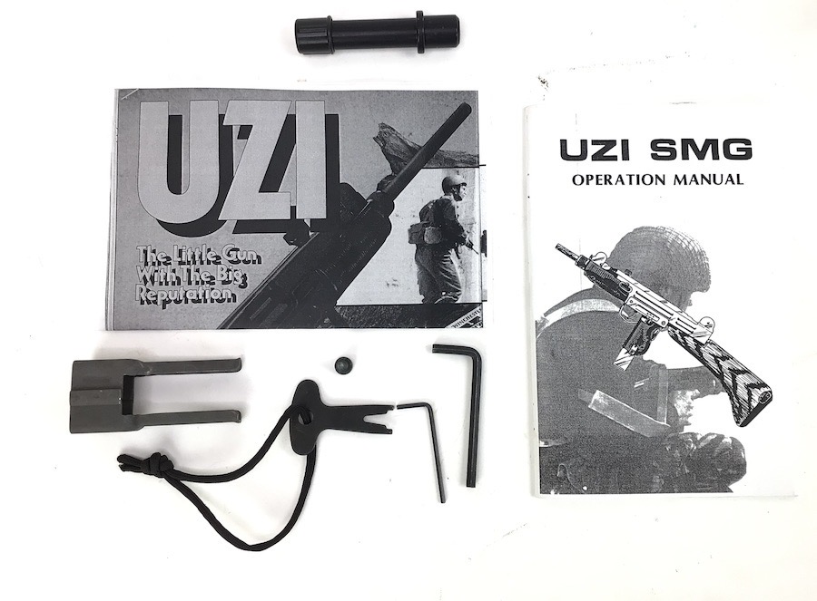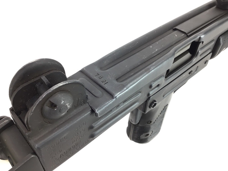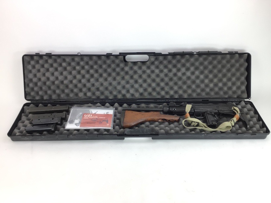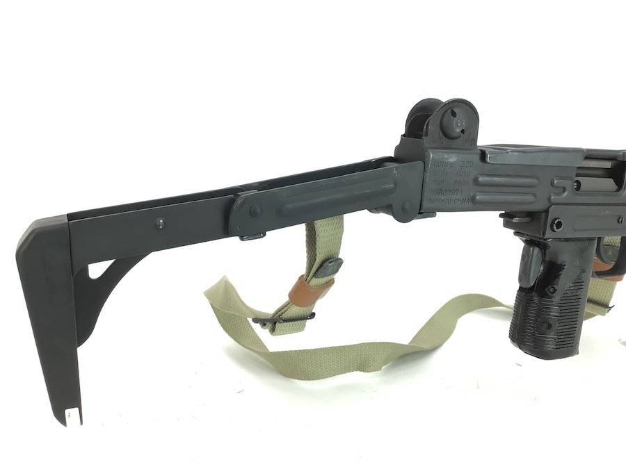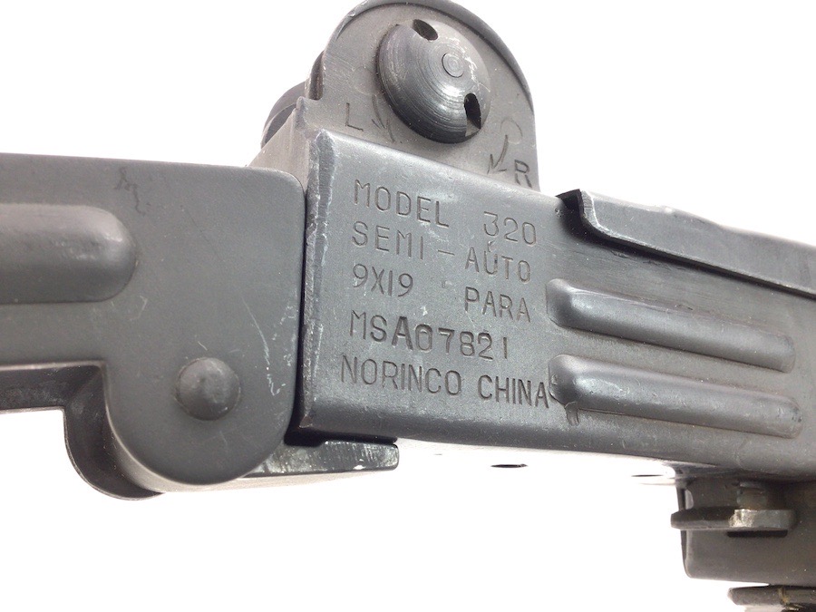 3/15/24 – This is an excellent example of a Norinco Model 320 UZI Carbine in all original condition. This firearm qualifies as a rifle with its 16in barrel, and also features a retractable stock. Includes matching, original wood stock, tools, manual, 4, stick magazines and a dummy stub barrel for display. It has minor handling wear and a little bit of finish loss on the barrel, but in great shape overall. Great bore, would be a fun shooter. Also includes a Bushmaster carry case.