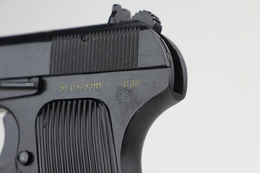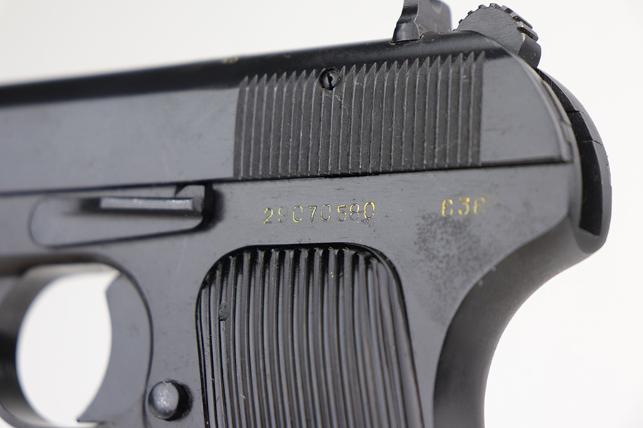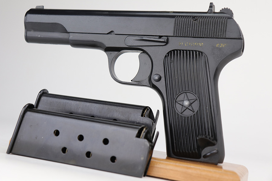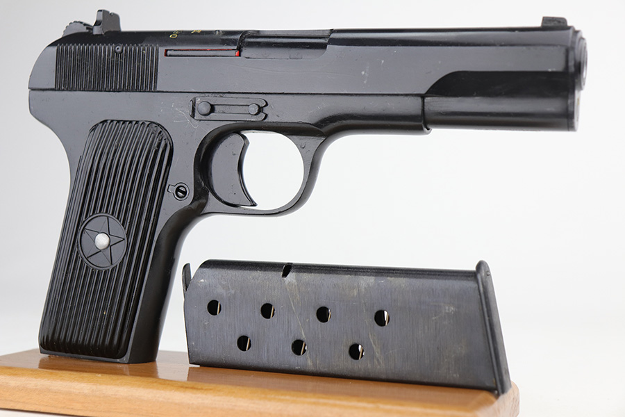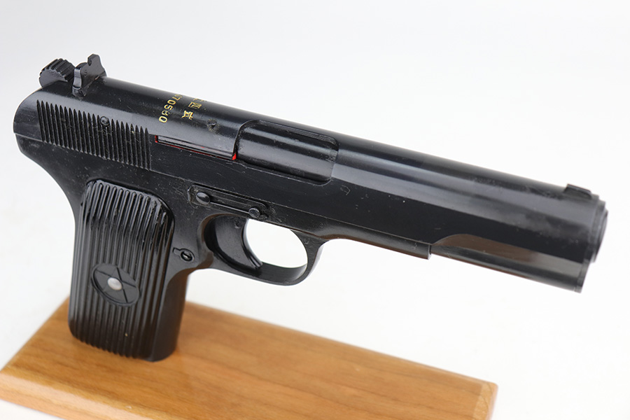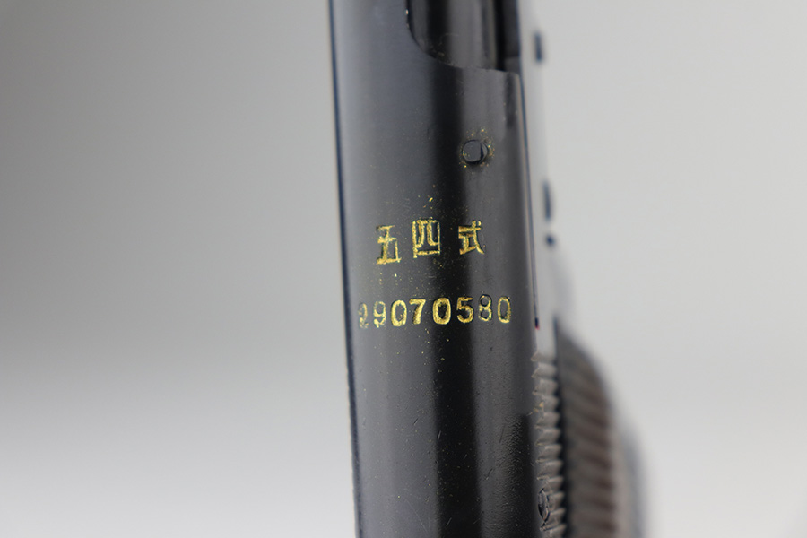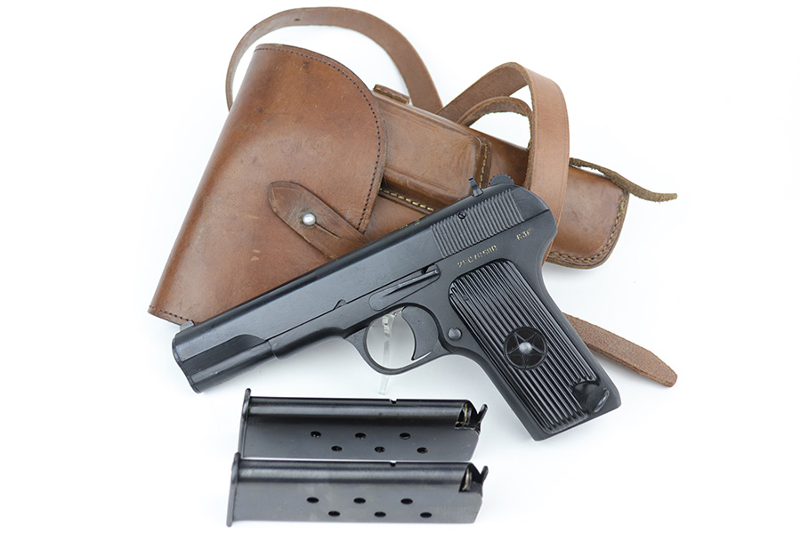 9/28//21 – This is an excellent example of a Norinco Type 54, a Chinese copy of the Tokarev TT-33. Made in the 636 factory. It is all matching and comes with two matching magazines. Import mark on the underside of the slide. It has retained about 99% of its bluing, but we believe it is an arsenal refinish. The markings have been filled in with a gold wash. Small amount of red paint above the extractor. There are areas of freckling here and there throughout. Comes with excellent Chinese black bakelite grips. Mint bore. Comes with holster, mag pouch and shoulder strap.