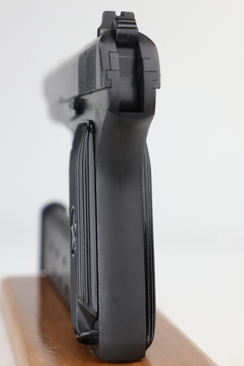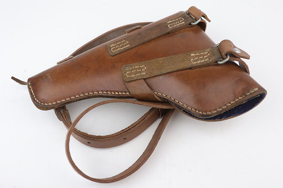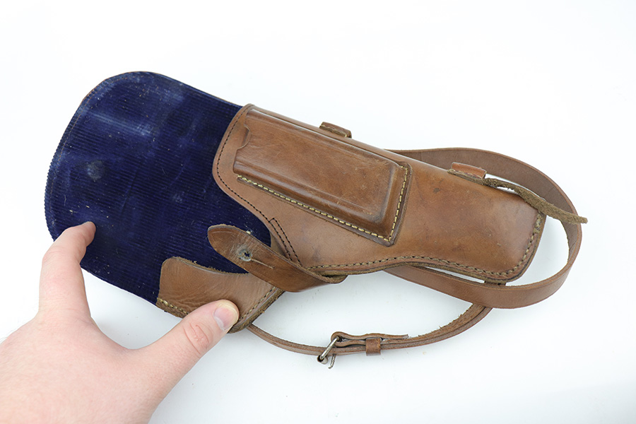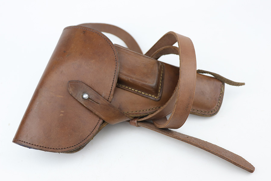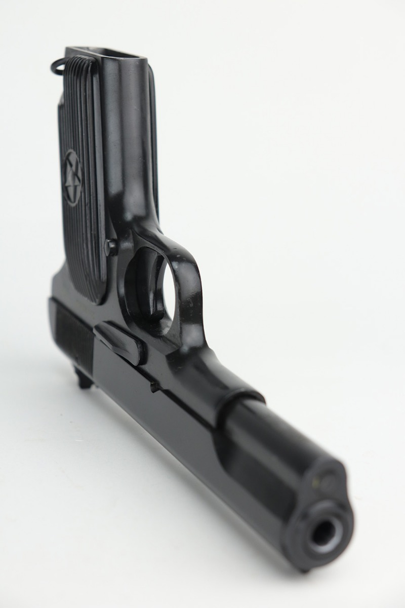 9/28//21 – This is an excellent example of a Norinco Type 54, a Chinese copy of the Tokarev TT-33. Made in the 636 factory. It is all matching and comes with two matching magazines. Import mark on the underside of the slide. It has retained about 99% of its bluing, but we believe it is an arsenal refinish. The markings have been filled in with a gold wash. Small amount of red paint above the extractor. There are areas of freckling here and there throughout. Comes with excellent Chinese black bakelite grips. Mint bore. Comes with holster, mag pouch and shoulder strap.