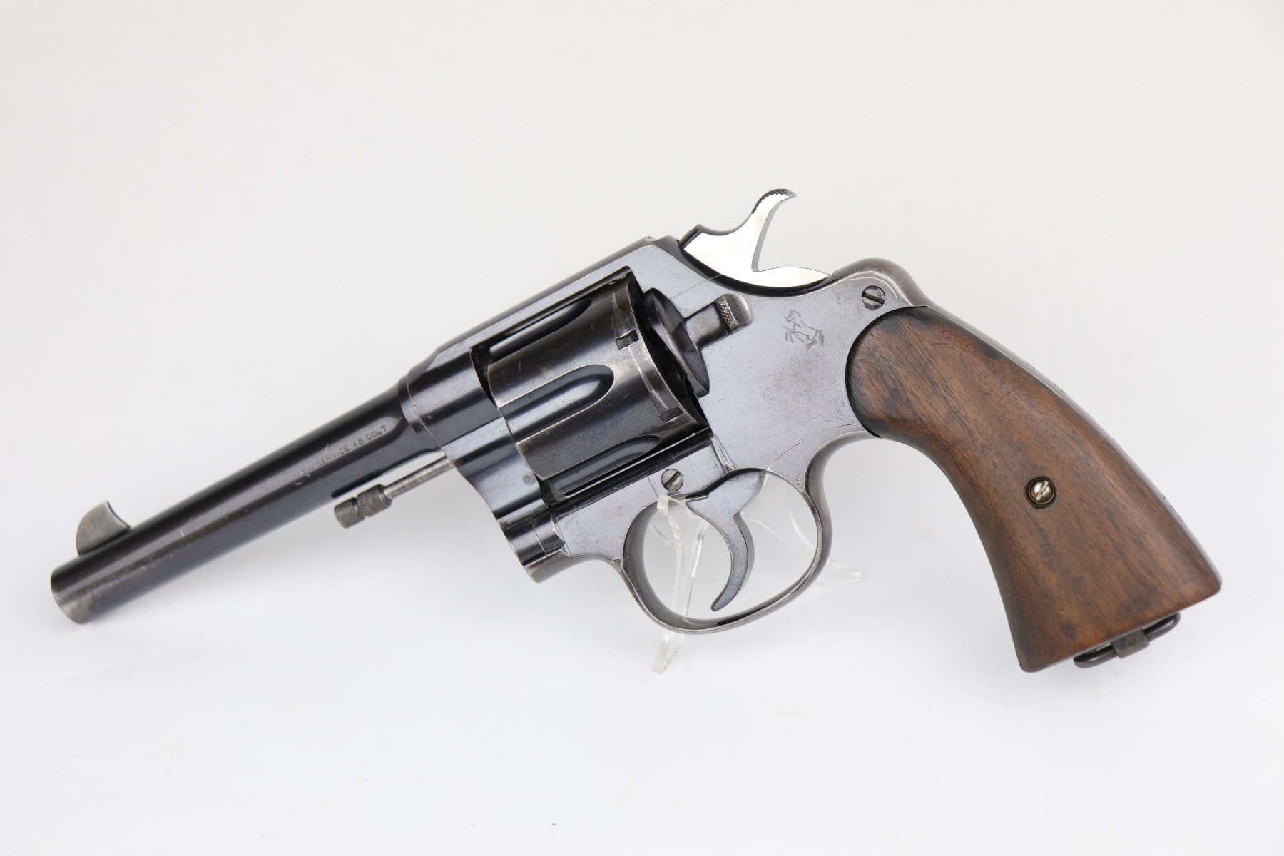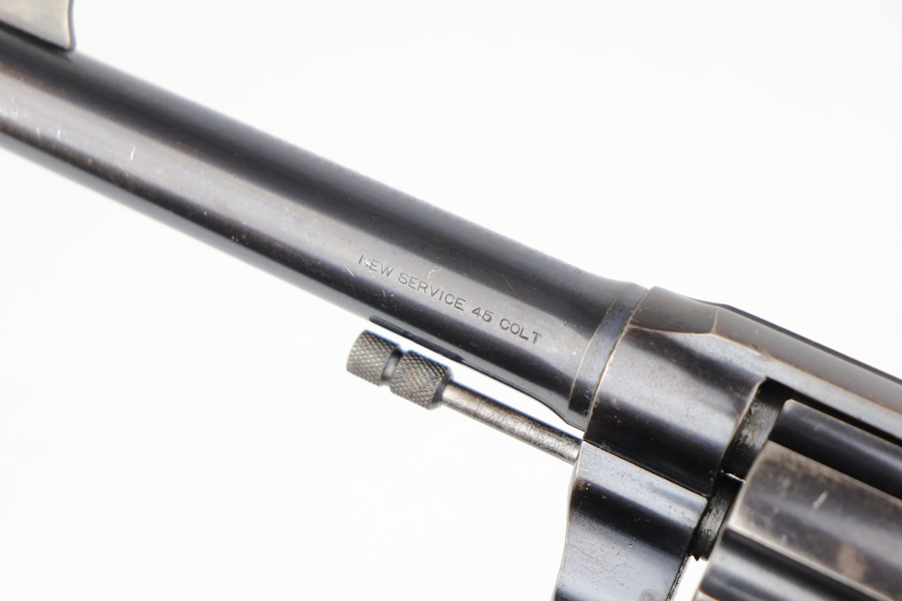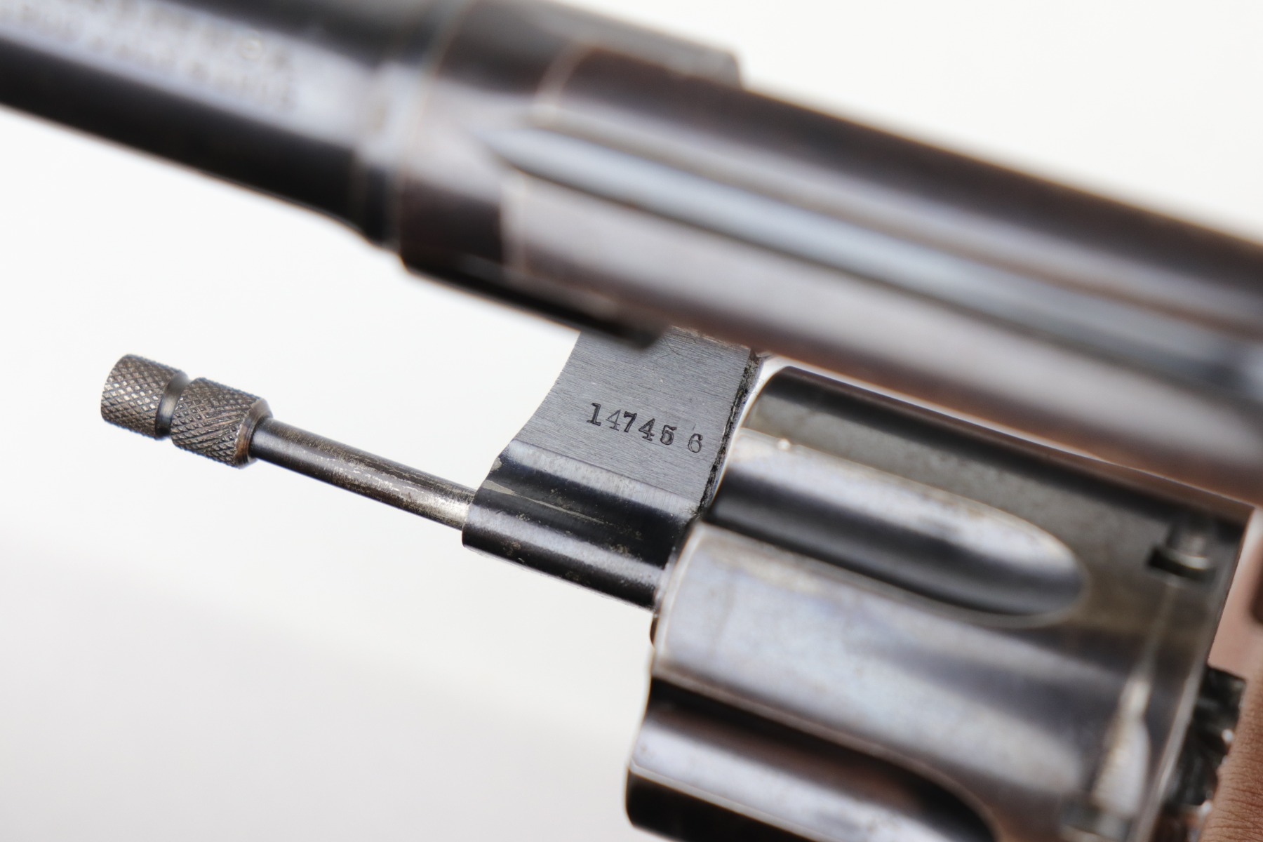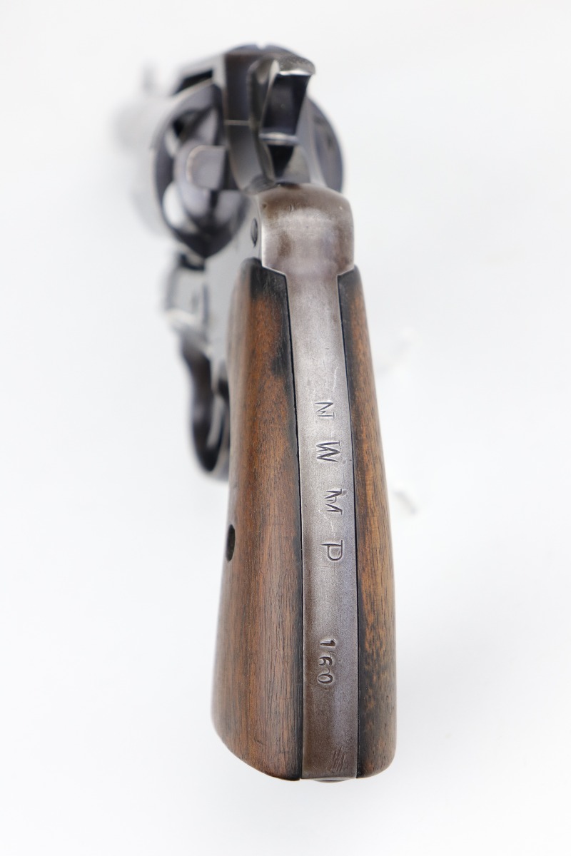6/18/20 – This is a Colt New Service Revolver issued to the North-West Mountain Police in 1918. Prime Minister Sir John A. Macdonald first began planning a permanent force to patrol the North-West Territories after the Dominion of Canada purchased the territory from the Hudson’s Bay Company. Reports from army officers surveying the territory led to the recommendation that a mounted force of between 100 to 150 mounted riflemen could maintain law and order. The Prime Minister first announced the force as the “North West Mounted Rifles”. However, officials in the United States raised concerns that an armed force along the border was a prelude to a military buildup. Macdonald then renamed the force the North-West Mounted Police (NWMP) when formed in 1873. This particular example is marked “NWMP 160” on the back strap. That is a police unit marking. This gun has retained roughly 70-75% of its original finish. Most of the finish loss in on the straps and at the base of the frame near the trigger guard. There is also wear around the muzzle and on the front sight. There are very small dings on the gun throughout. There is wear on the high edges of the cylinder and a roll mark. The original grips are excellent. All matching. The cylinder is tight and the action is smooth. Mint bore.
