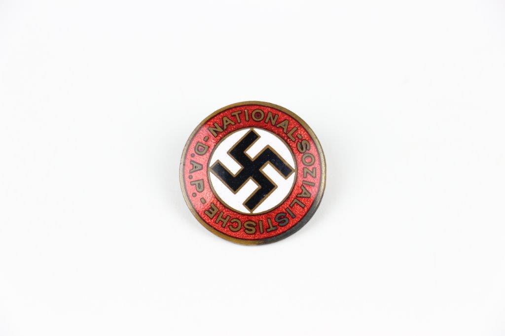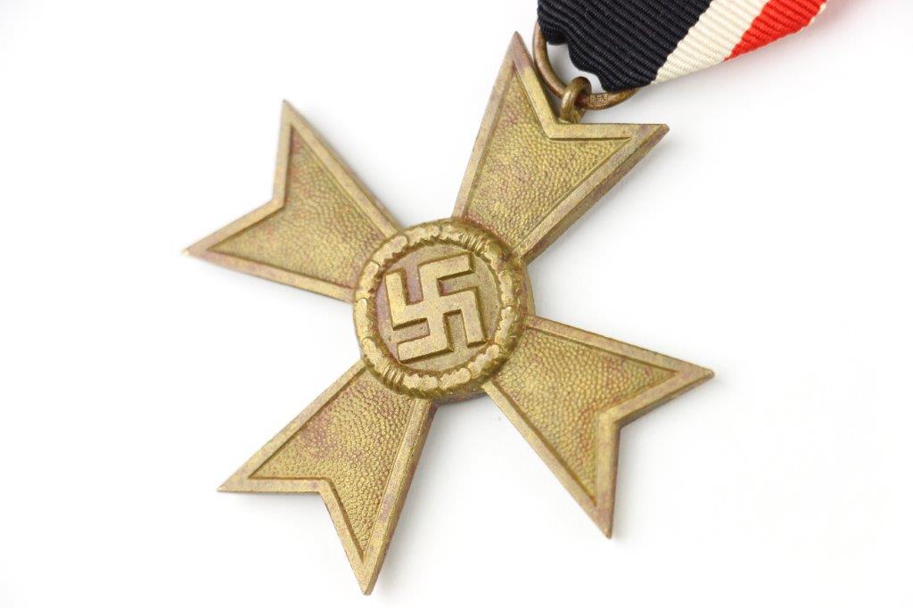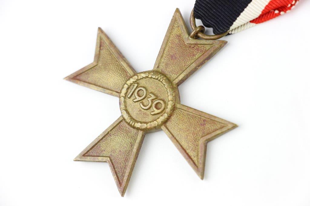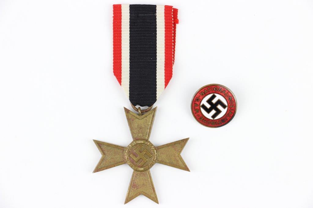 2/19/24 – This is an original NSDAP Party Pin, paired with an original German Merit Cross. The party pin is 2.2cm in diameter. Great condition with intact finish throughout. The reverse has a functional clasp and is marked “GES GESCH”. The merit cross has mild discoloration and surface patina throughout but no major issues. Original ribbon is attached but no clasp or pin. Great overall condition.