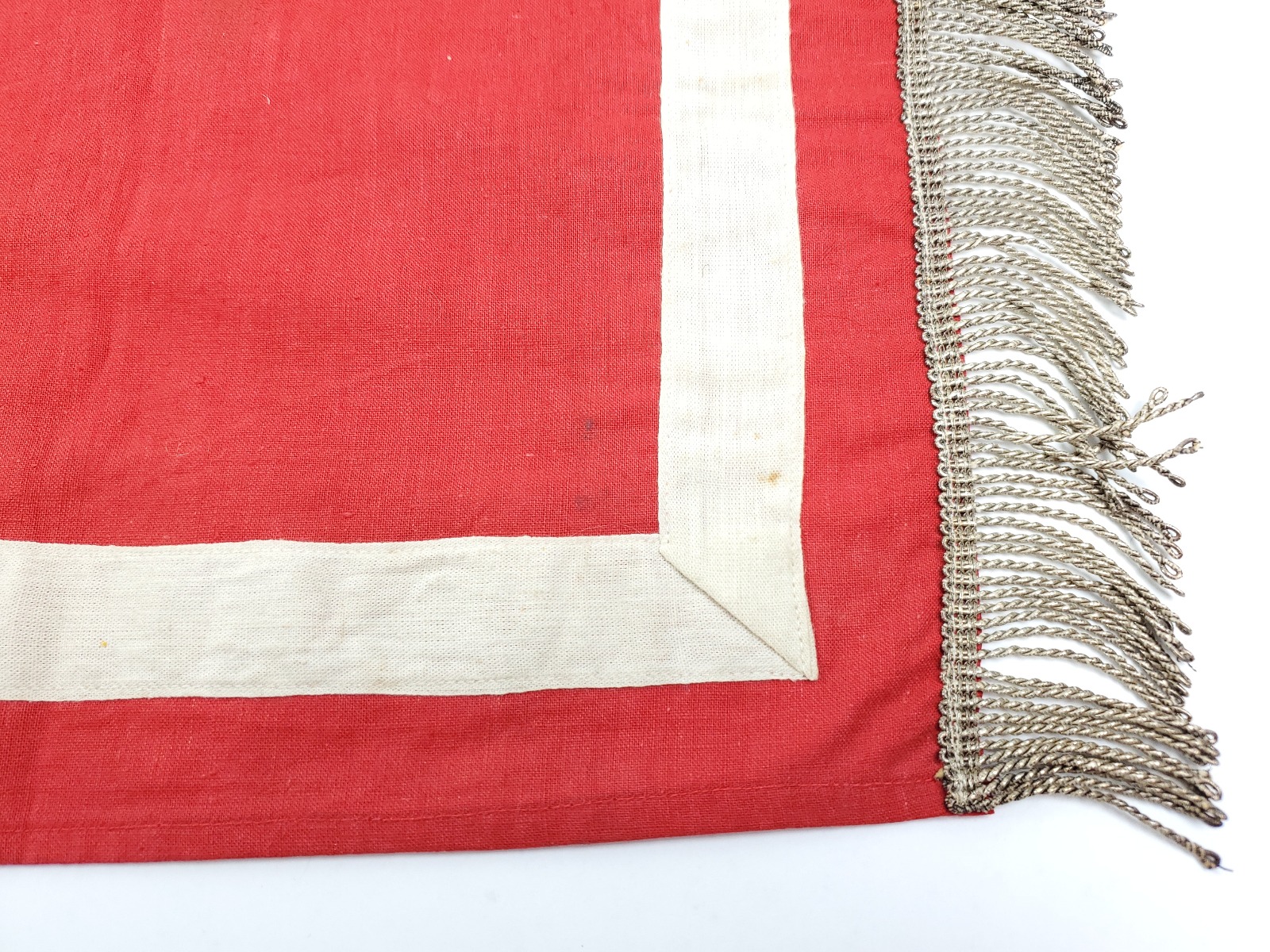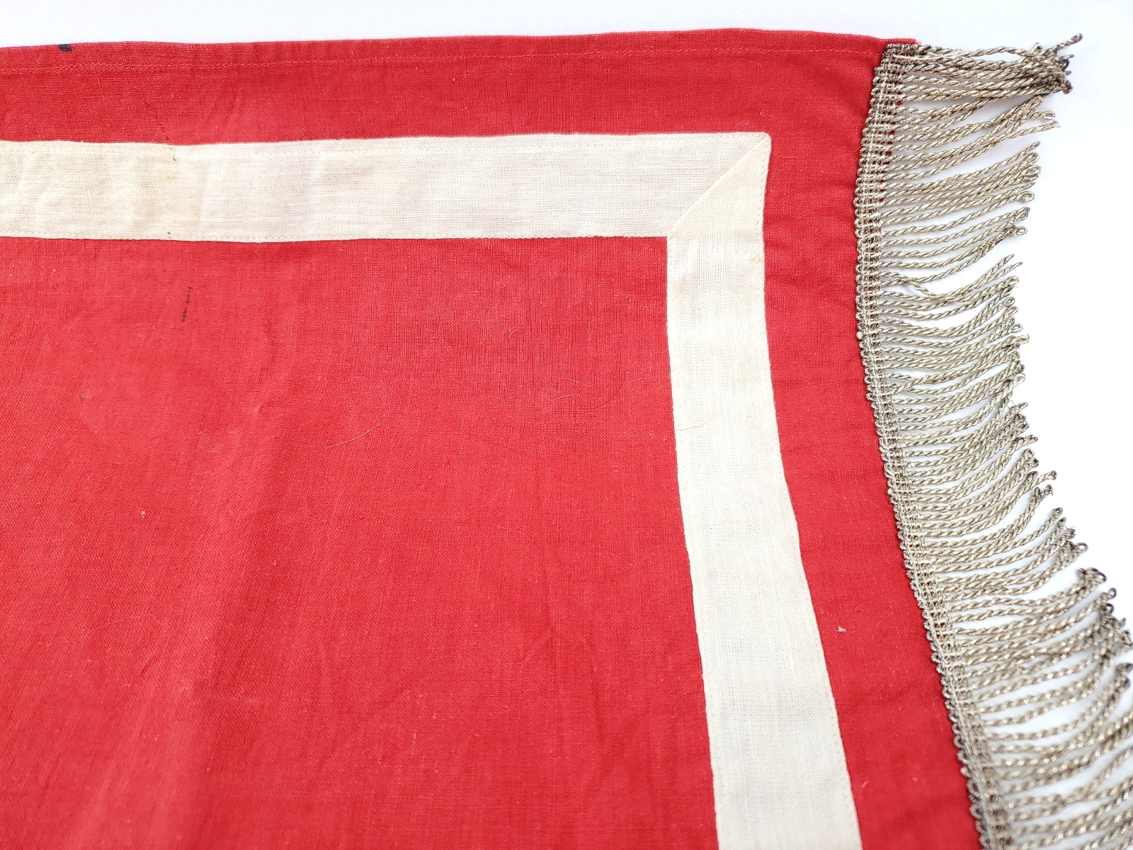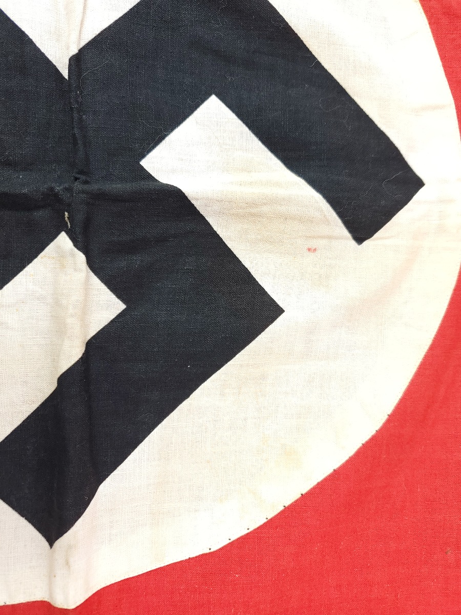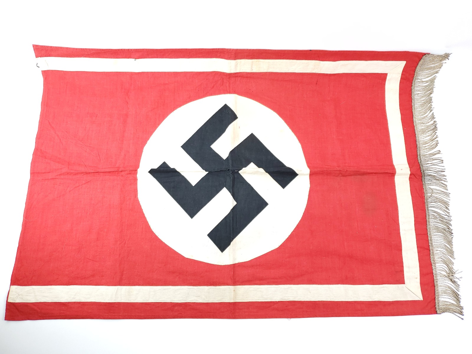 8/18/20 – This is an original nazi podium banner flag. 30″ x 21″. A cotton blend with a sewn on swastika. Has a 1 inch white border near the edge. 2 inch gilded fringe on the bottom. One of the original two mounting rings is still attached. some normal discoloration and some small stains but overall in excellent condition.