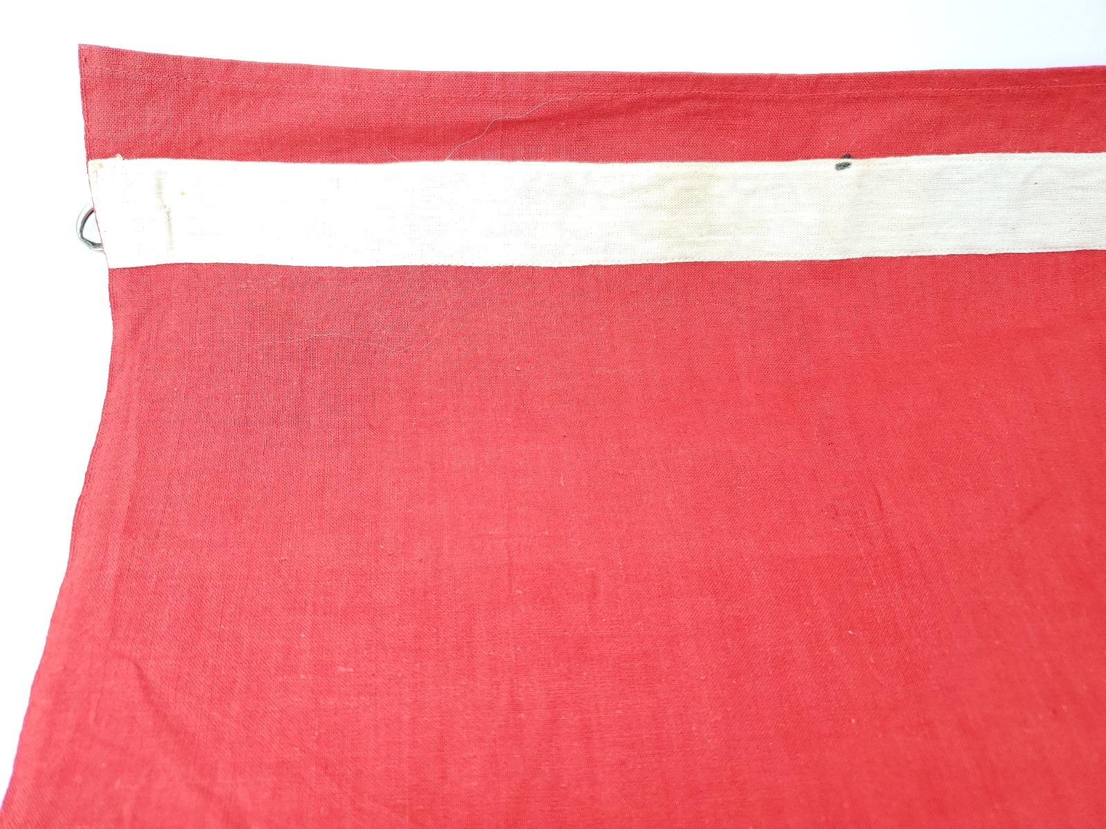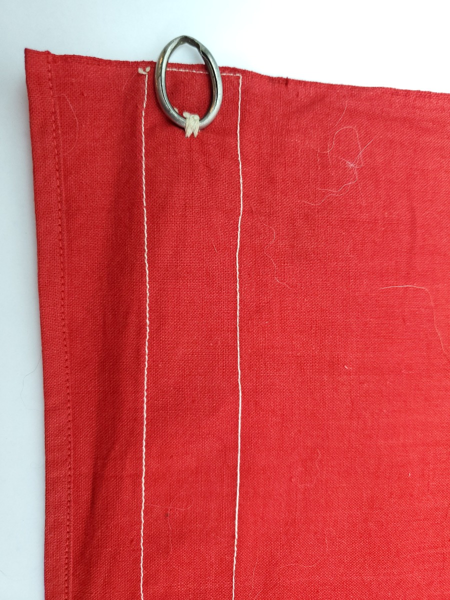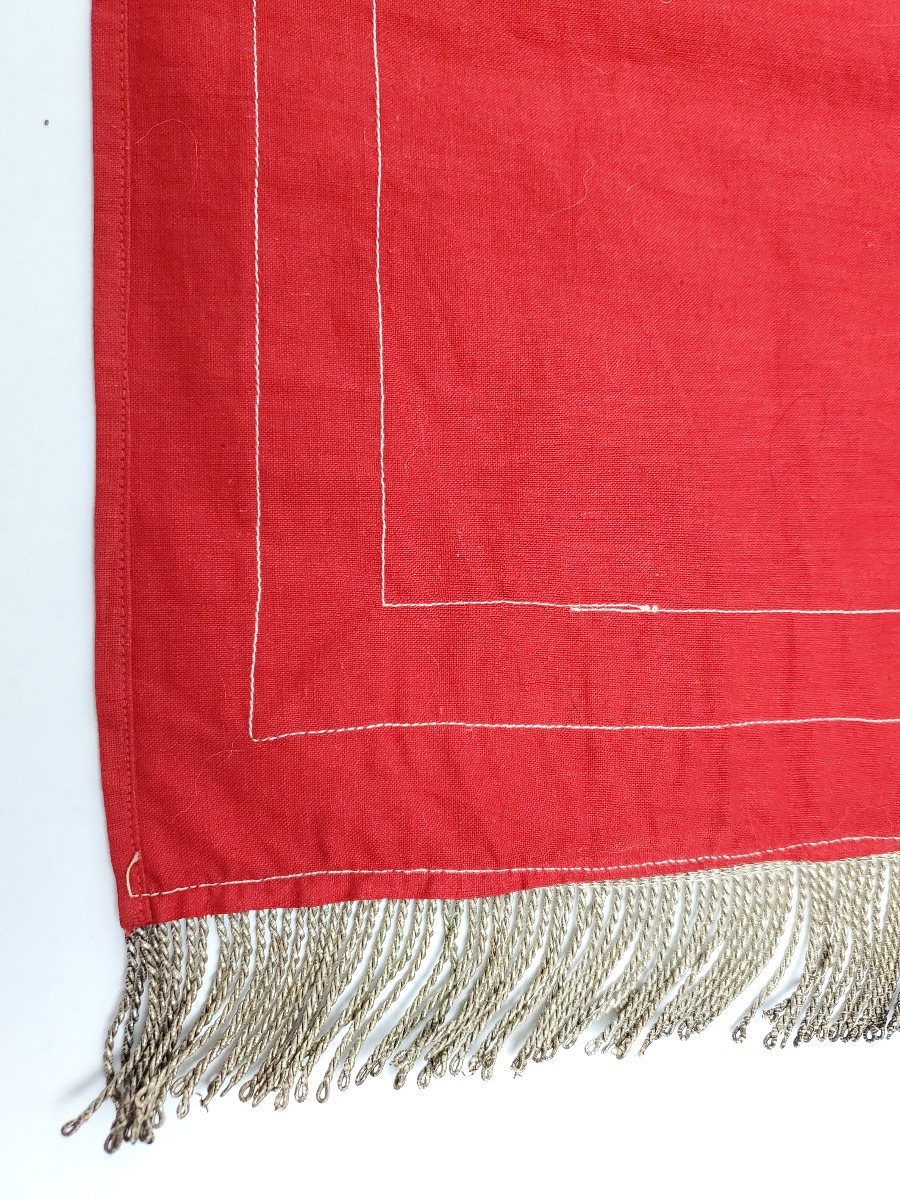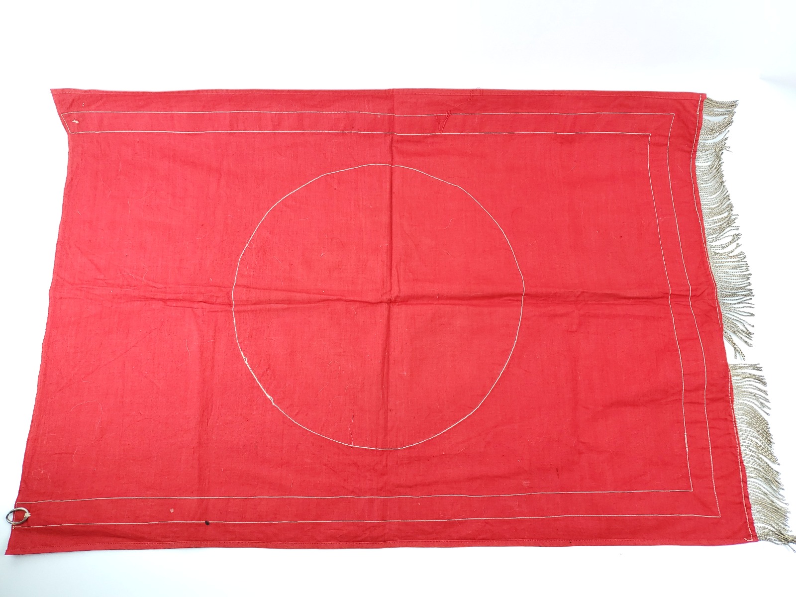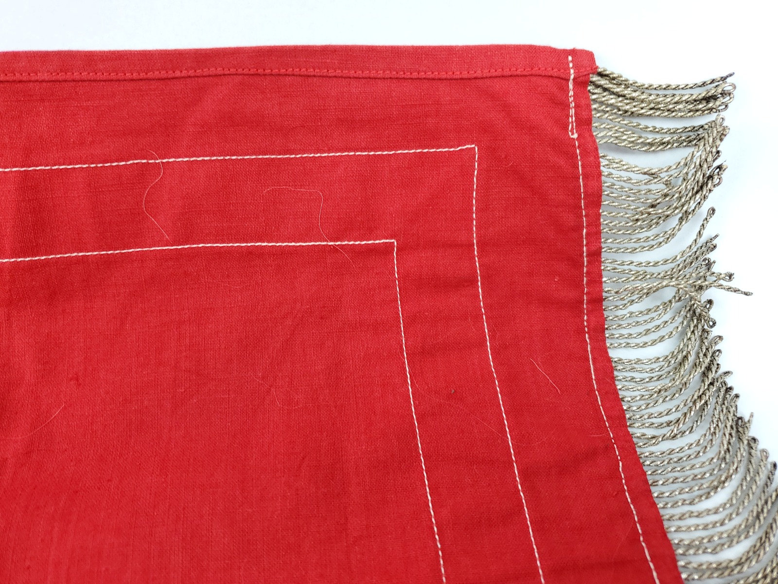 8/18/20 – This is an original nazi podium banner flag. 30″ x 21″. A cotton blend with a sewn on swastika. Has a 1 inch white border near the edge. 2 inch gilded fringe on the bottom. One of the original two mounting rings is still attached. some normal discoloration and some small stains but overall in excellent condition.