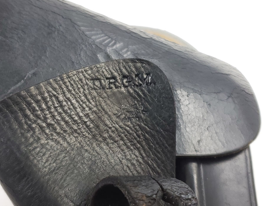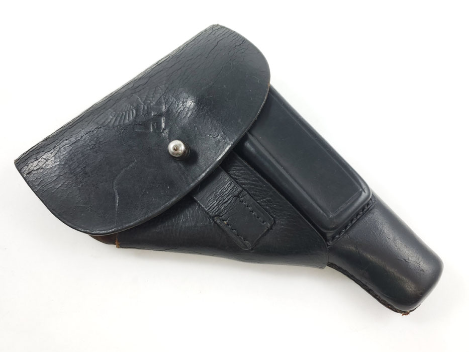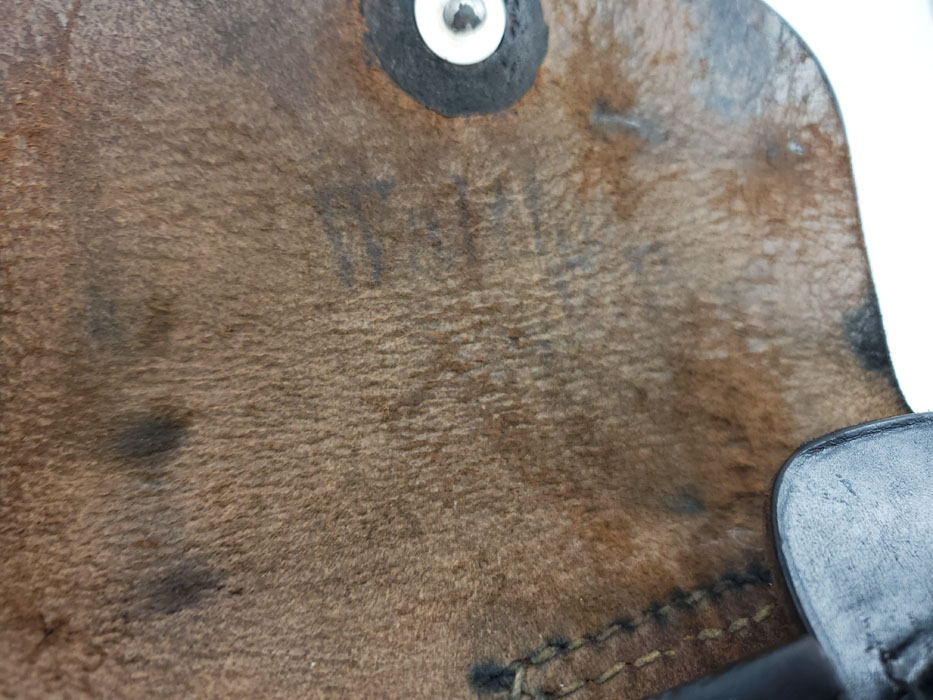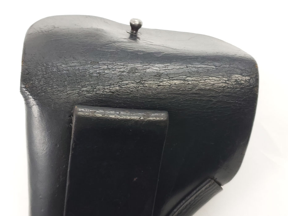 4/24/20 – This is a super rare, highly collectible, and early nazi era Walther PP holster. The holster is NSFK stamped on the front, which was a predecessor of the Luftwaffe (basically the German air force when the Germans weren’t allowed to have an air force). The holster is stamped on the front leather with the NSFK logo and a banner “N.S.F.K.” above the flying man’s head. This stamp is fairly faint but definitely distinguishable. There’s also some light surface cracking on the top leather (I think the photos make this look worse, but please look at the photos!) The holster is also maker stamped by AKAH under the closure strap, and Walther PP ink stamped on the interior leather. The stitching is all original and in tact.