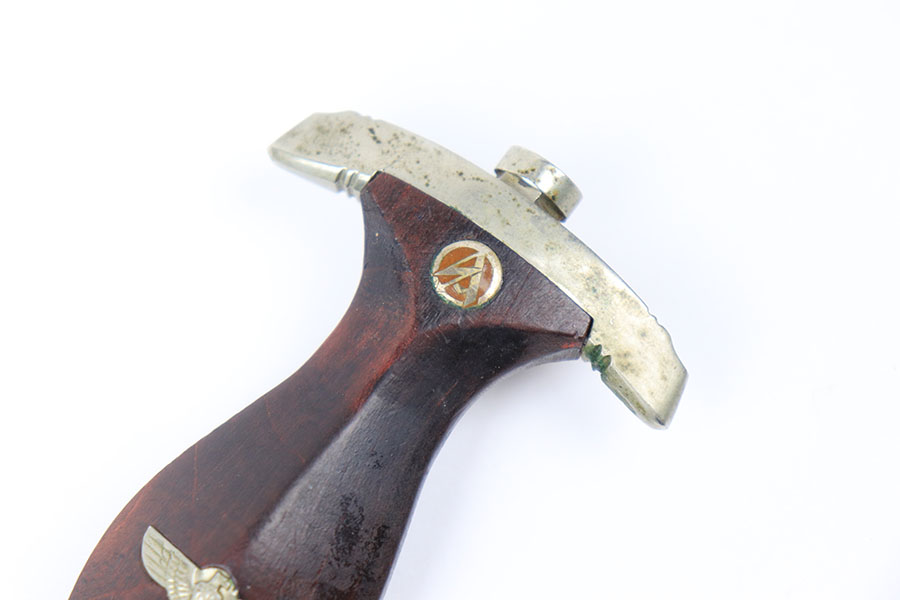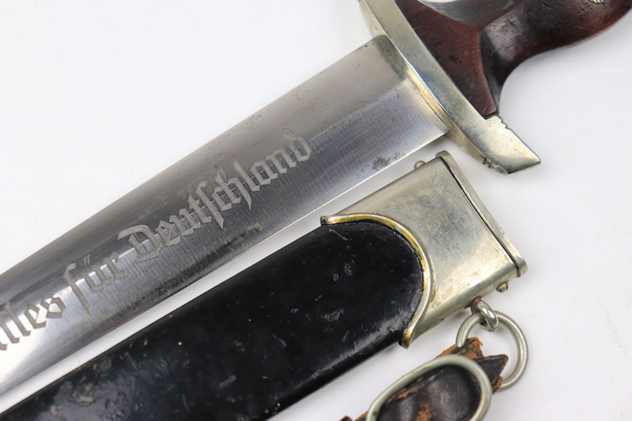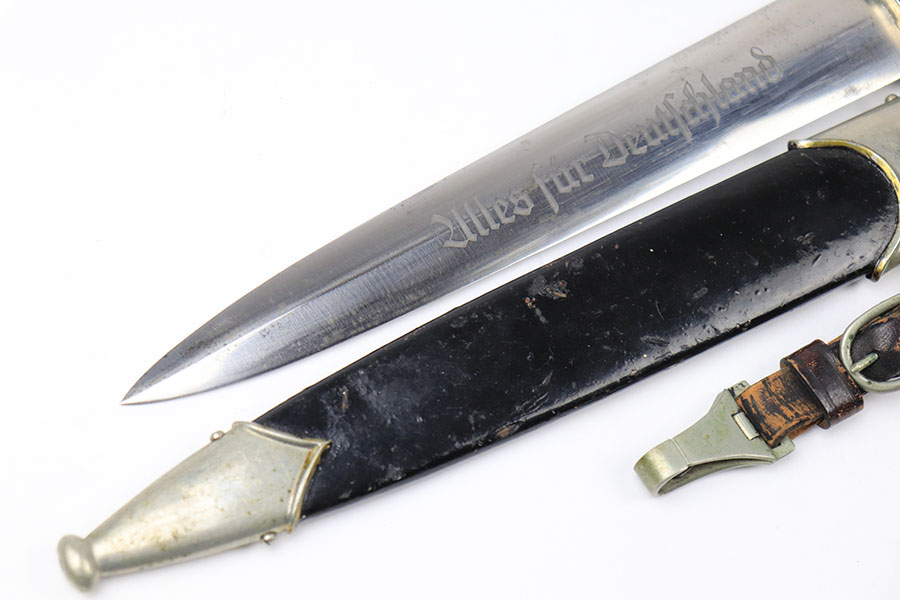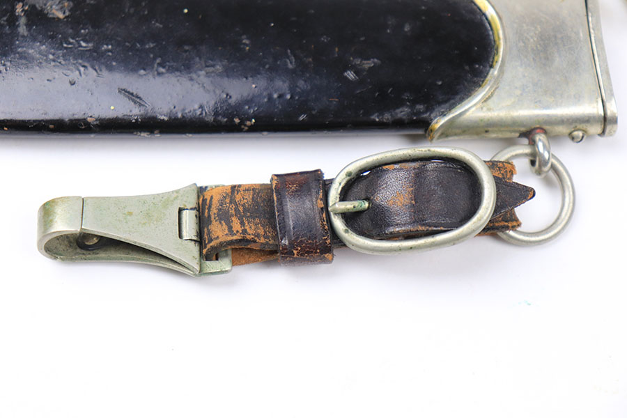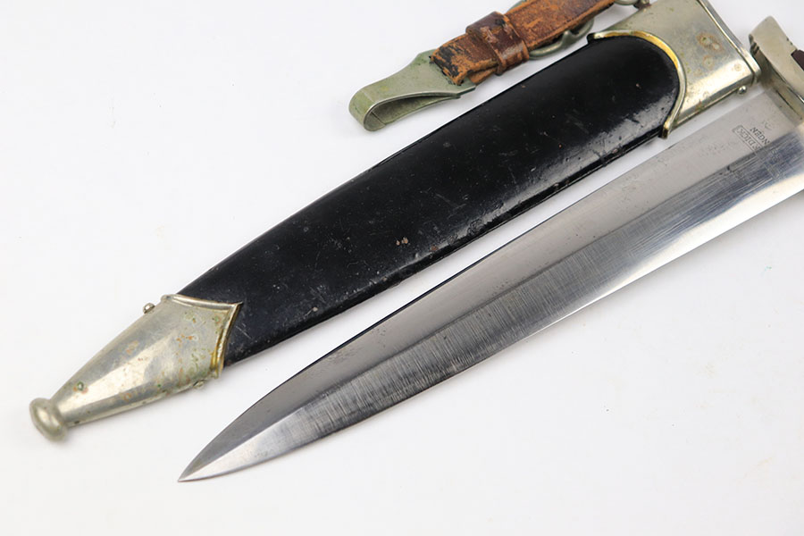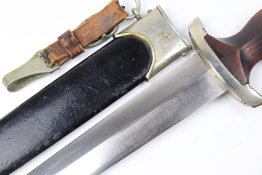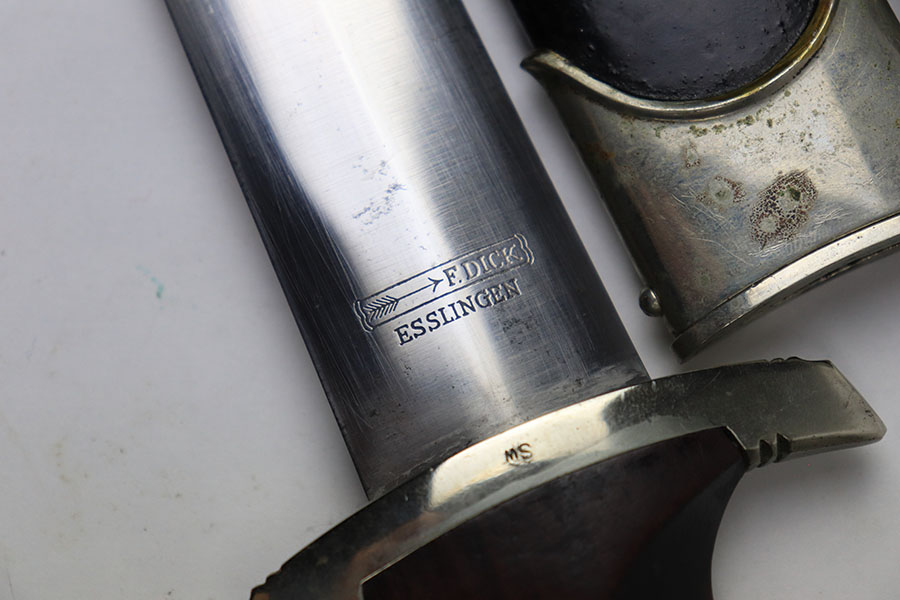8/11/21 – This is an original NSKK issued dagger from WW2. The dagger has a black wood handle and black painted scabbard, though the paint has faded throughout the wood on the handle, as shown. The wood is nice however, with no major cracks or chips. The blade is in great overall condition with some light spots of oxidation but no major areas of wear. Maker stamped by F. Dick on the reverse. The scabbard has an original leather hanger, and has no dents or major flaws.