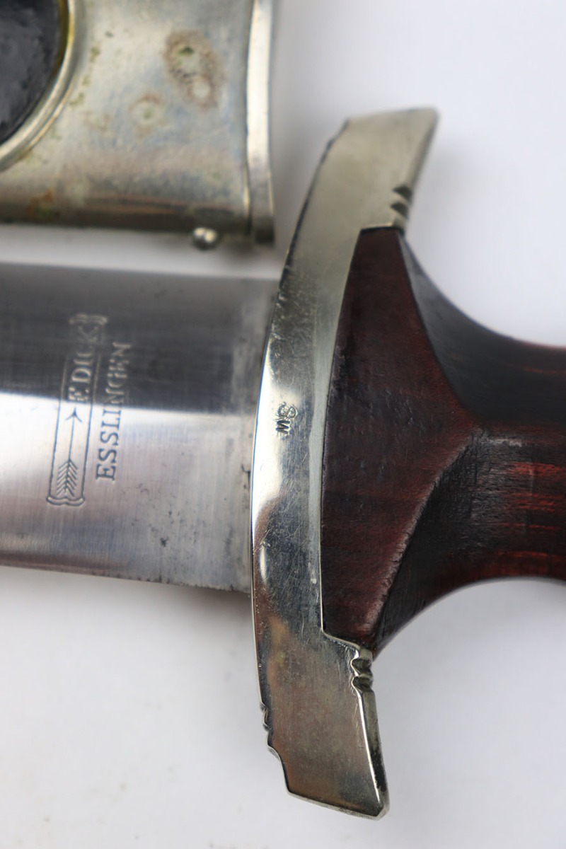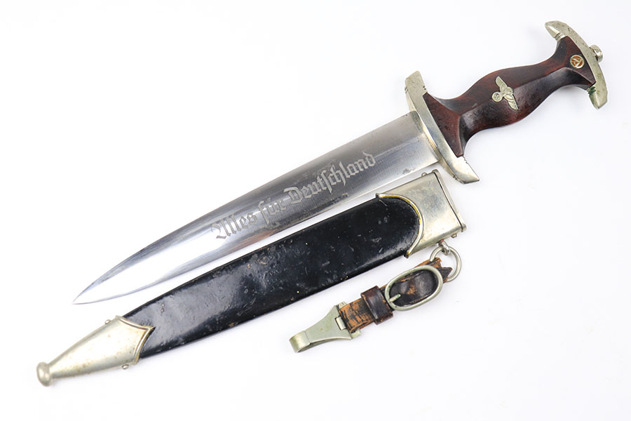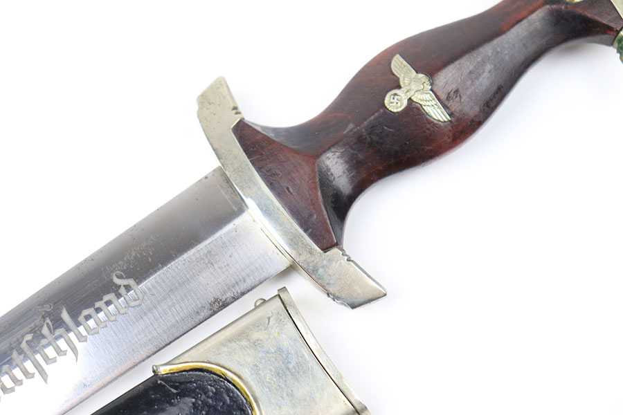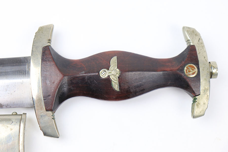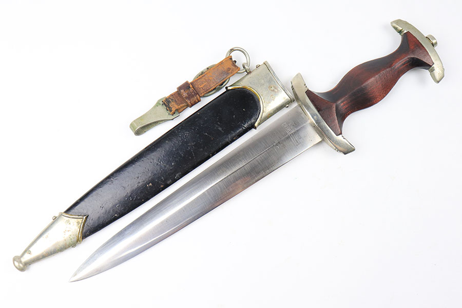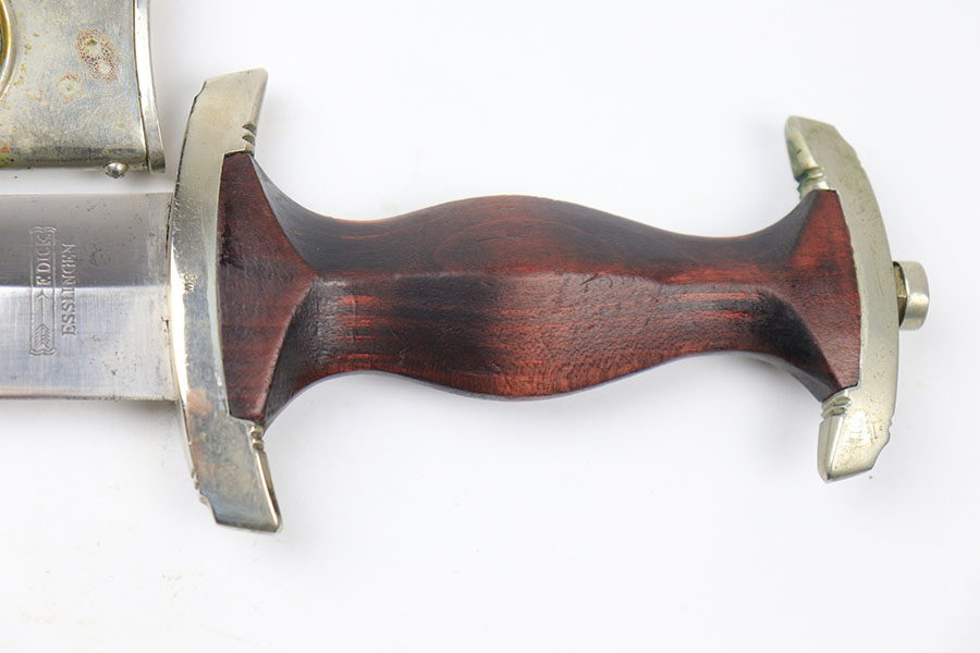 8/11/21 – This is an original NSKK issued dagger from WW2. The dagger has a black wood handle and black painted scabbard, though the paint has faded throughout the wood on the handle, as shown. The wood is nice however, with no major cracks or chips. The blade is in great overall condition with some light spots of oxidation but no major areas of wear. Maker stamped by F. Dick on the reverse. The scabbard has an original leather hanger, and has no dents or major flaws.