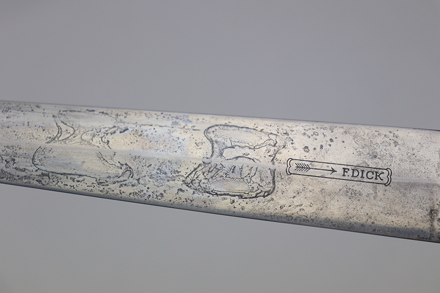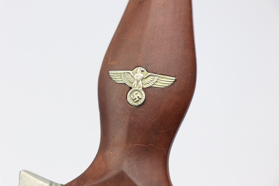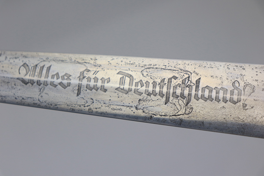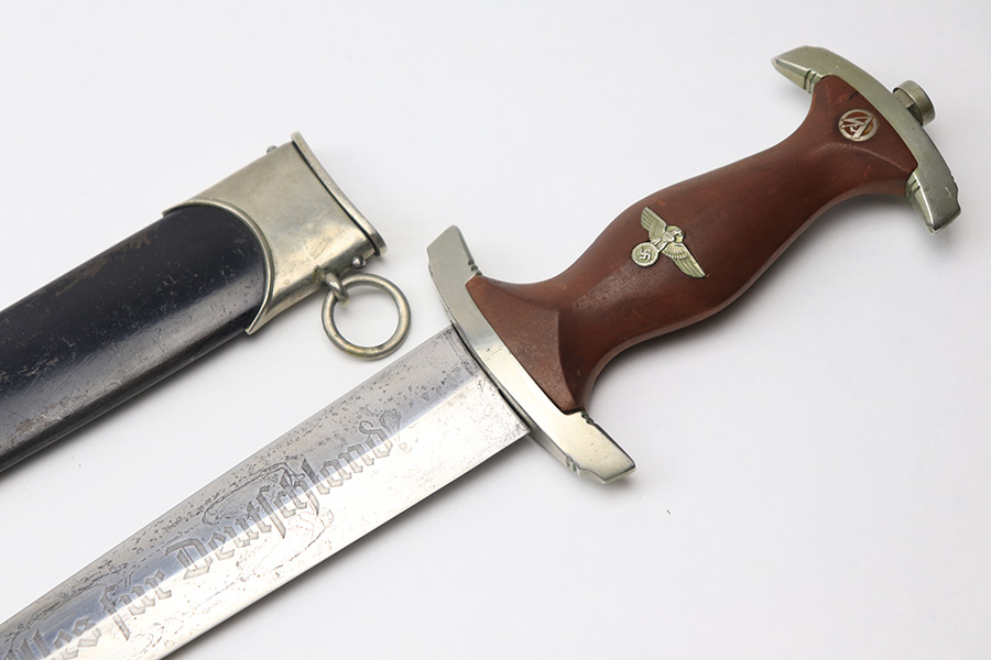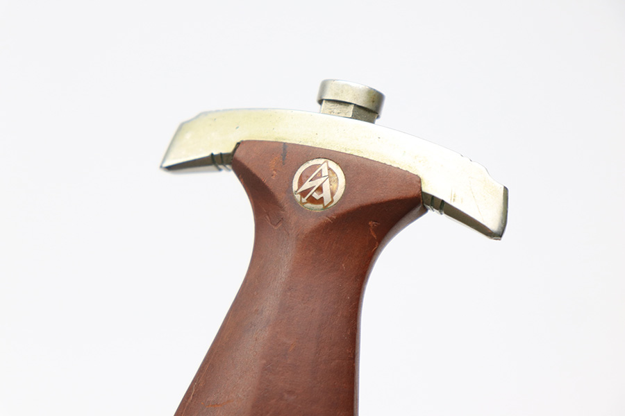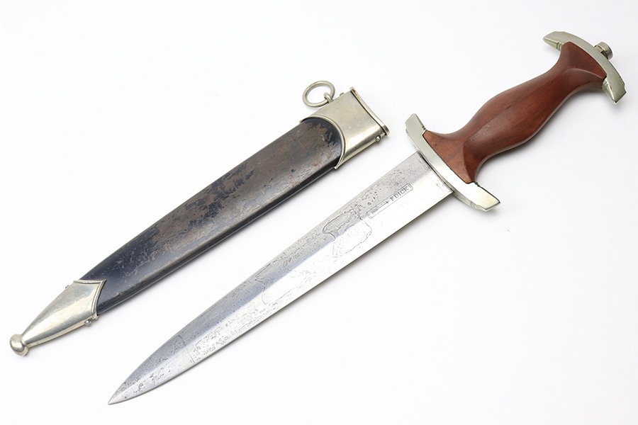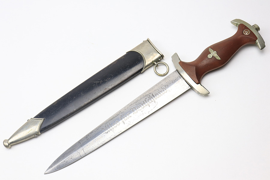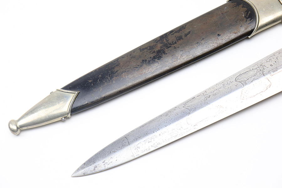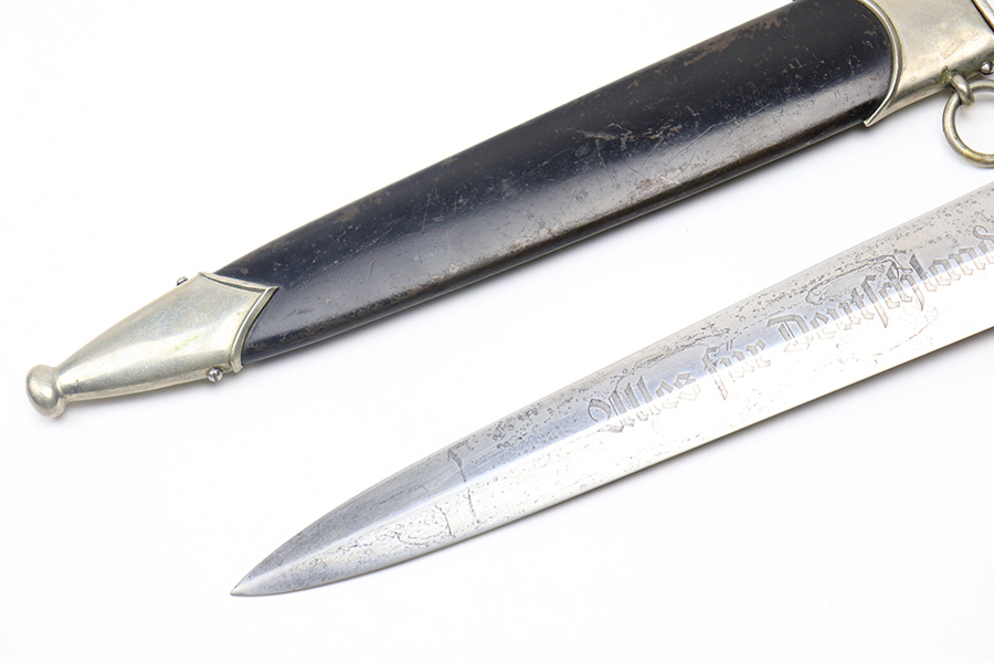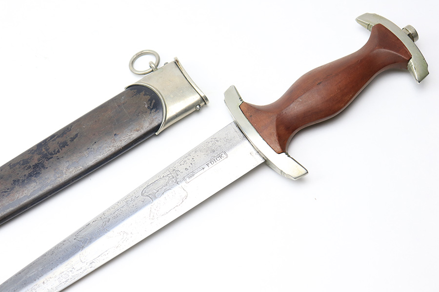 4/1/22 – This is an original WW2 NSKK Dagger by F. Dick. The dagger blade has light surface wear throughout as shown. This is mostly dark oxidation and splotchy wear likely from improper storage. The Alles fur Deutschland inscription and maker stamp are still clearly visible, however. The hand guard and pommel are in great condition, as is the wood handle. The handle has no cracks or chips. Comes with an original scabbard. The scabbard has most of the black painted finish missing on one side, but there are no dents or missing pins.