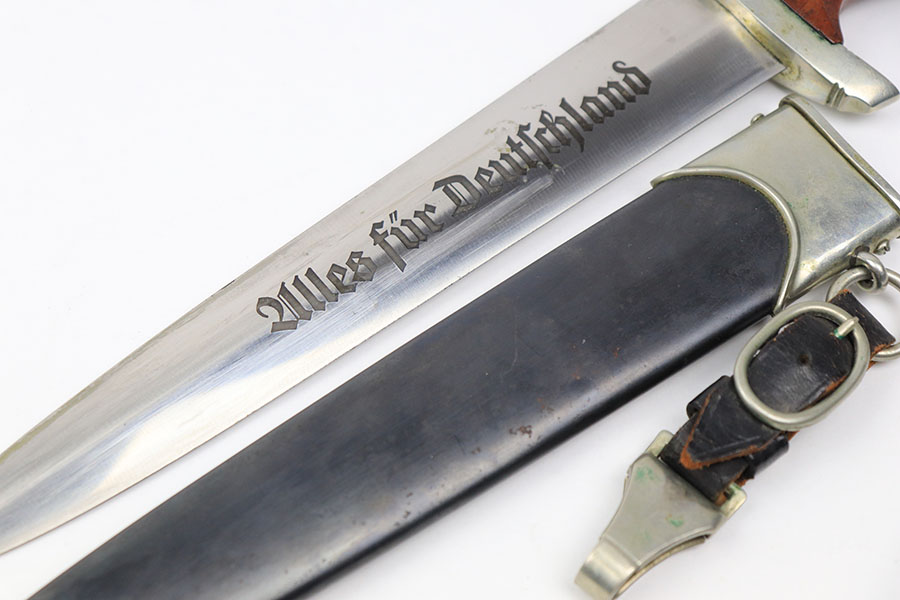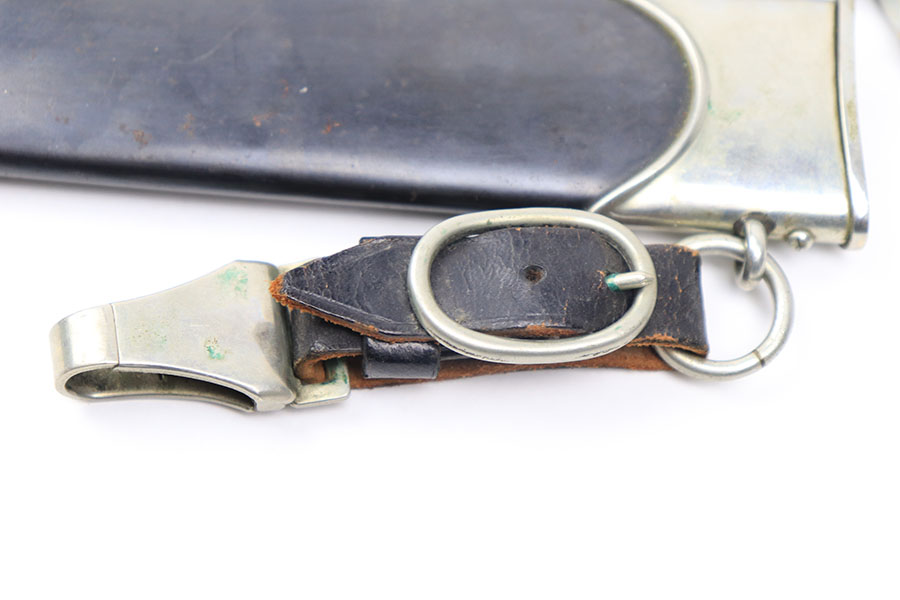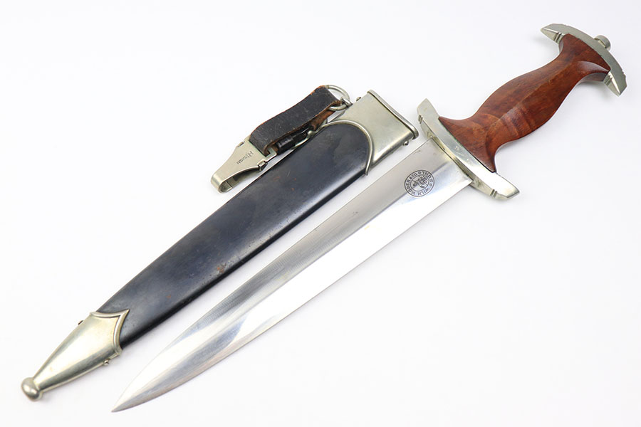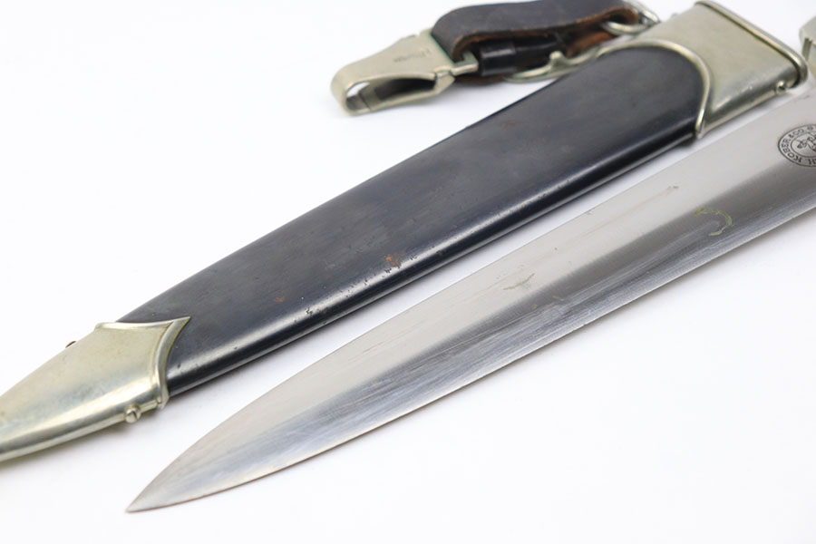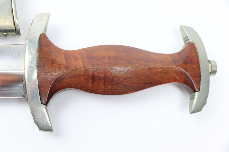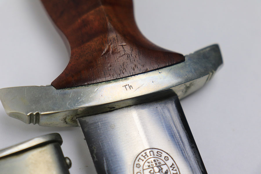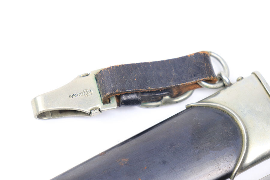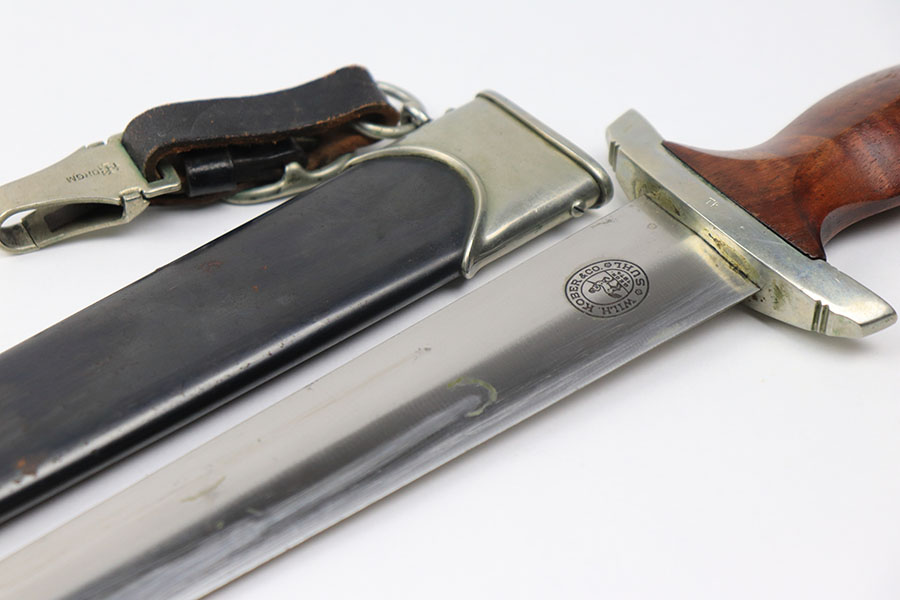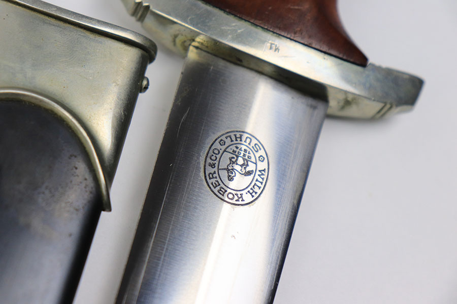 11/22/21 – This is an excellent example of a NSKK dagger by Wilh. Kober & Co. with an original hanger. The blade has beautiful cross graining and is in excellent condition with a strong maker stamp. The wood handle has no notable cracks or chips. The hand guard and pommel have some mild patina but no excessive wear. The scabbard has some mild spotty patina but is in great shape with no dents. The hanger is maker marked by Assmann and in great condition as well.