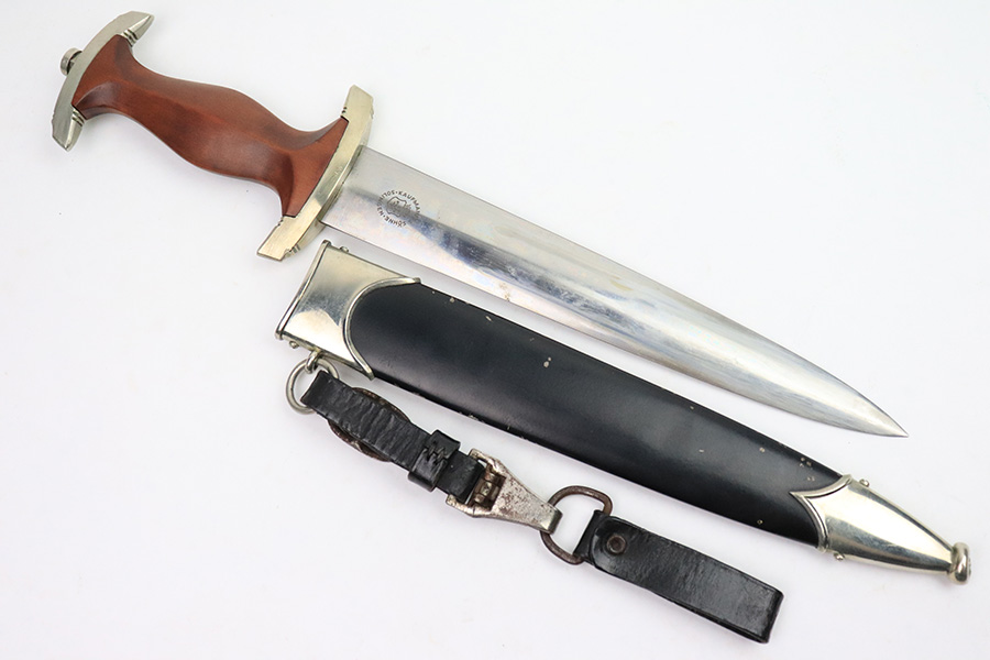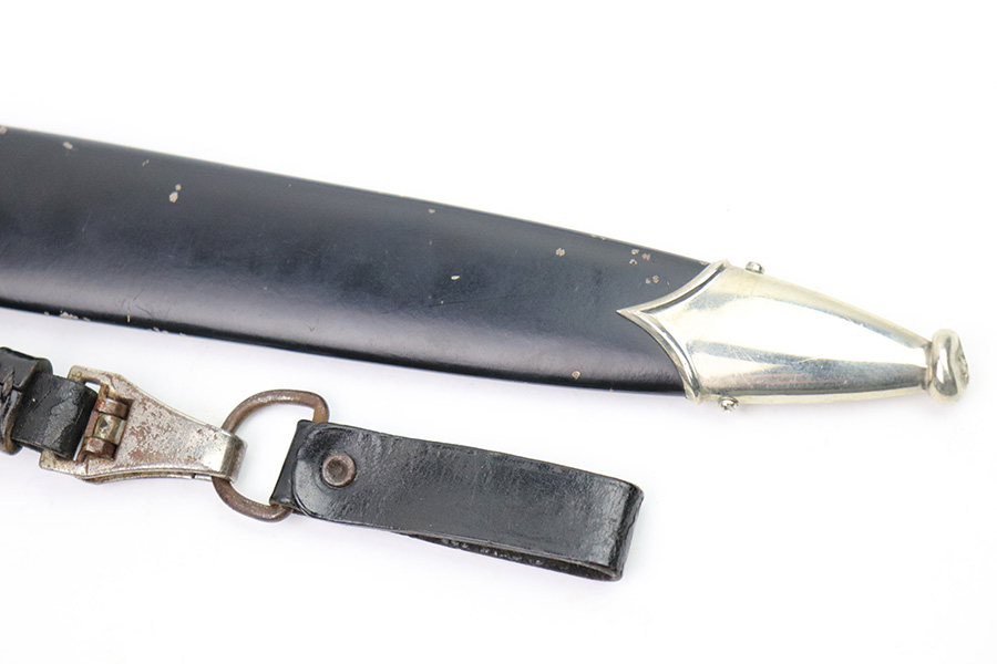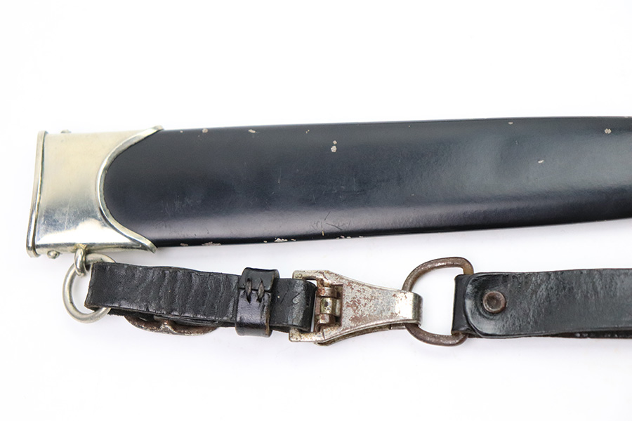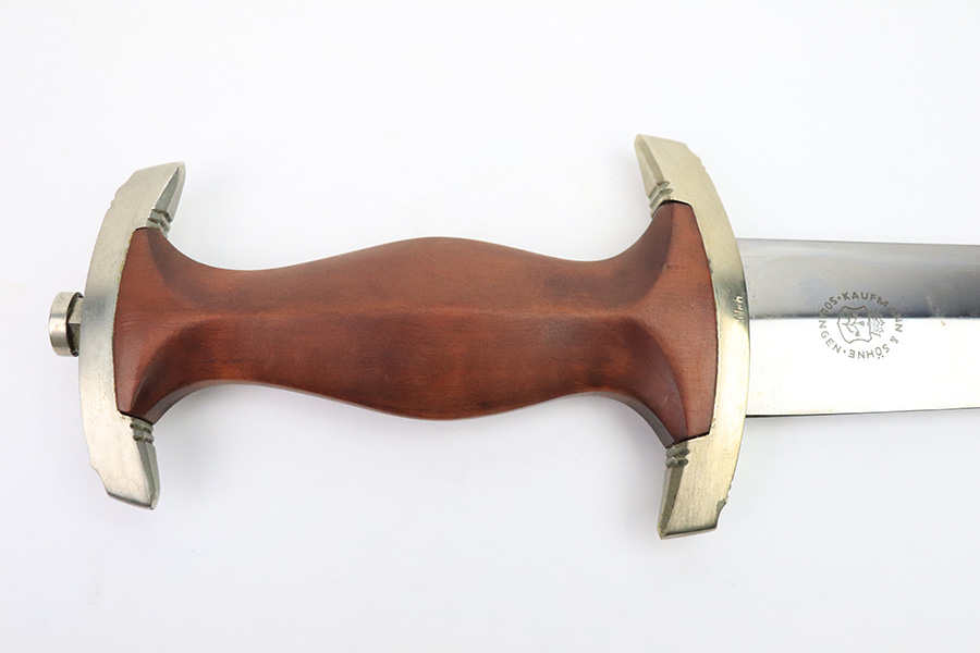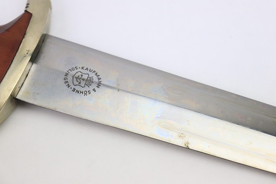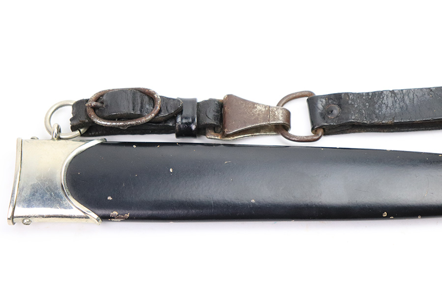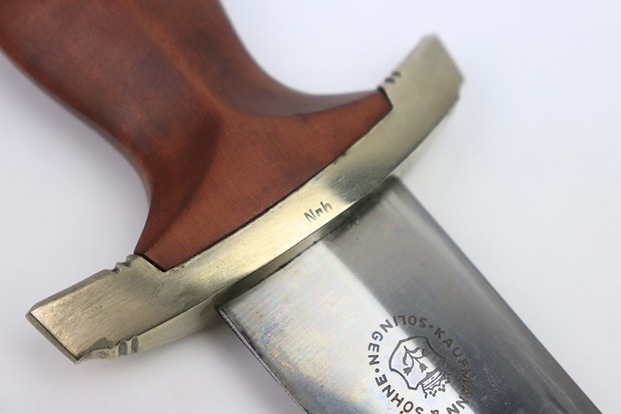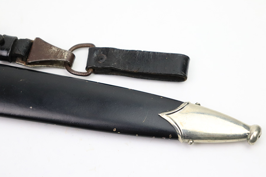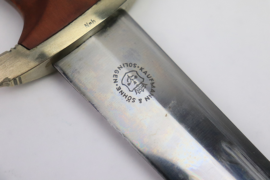 12/15/22 – This is an original NSKK Dagger from WW2 made by Kaufmann & Sohne. The dagger comes with an original scabbard and leather hanger. The dagger blade is in great condition displaying excellent cross-graining throughout. There’s some mild scabbard rub wear and typical mild surface scratching on both sides of the blade. There’s also some rainbow coloring that reflects off the blade (shown in photos) from old oil someone must have used to clean the blade at one point. The dagger has a crisp maker marking and is gruppe stamped on the cross guard “Nrh”. The solid nickel fittings are in great condition with some mild surface patina but no excessive wear. The wood handle is free from cracks, flaking, or chips. The scabbard has excellent original black paint with some very mild spots of paint loss. The hanger is RZM stamped on the leather and the metal clip has dark surface patina but still functions without issue.