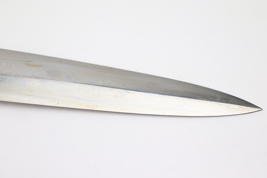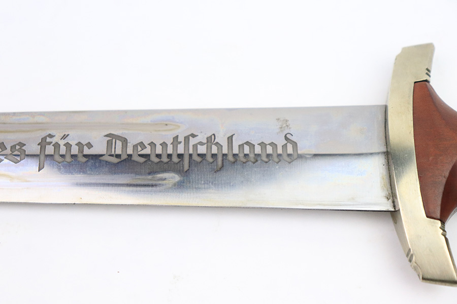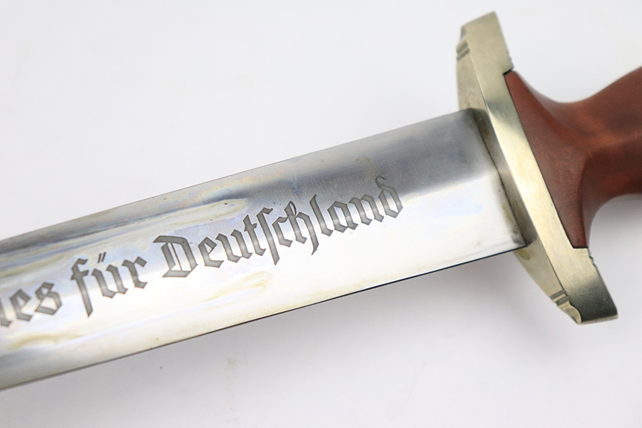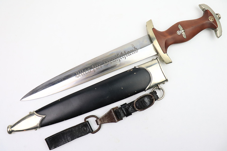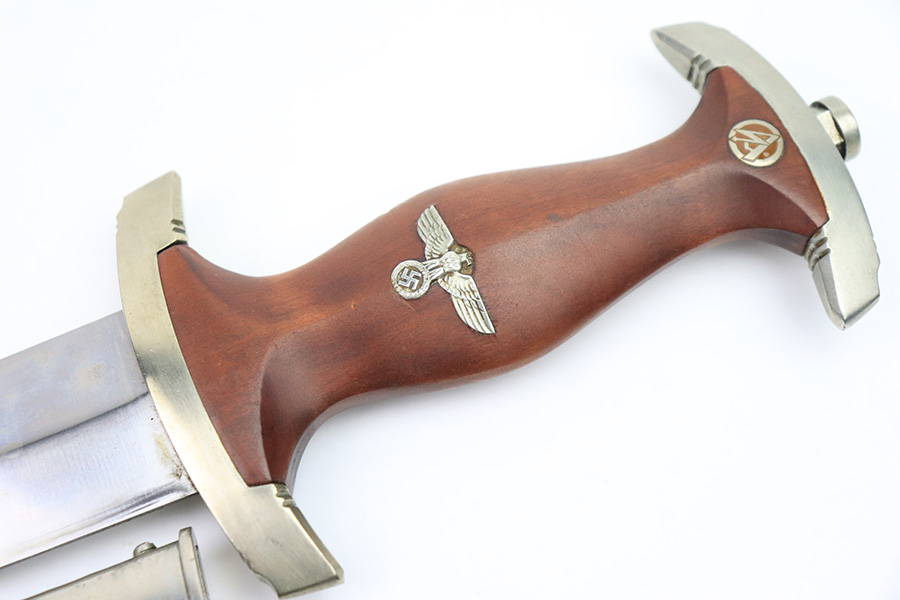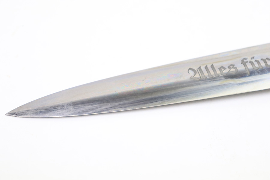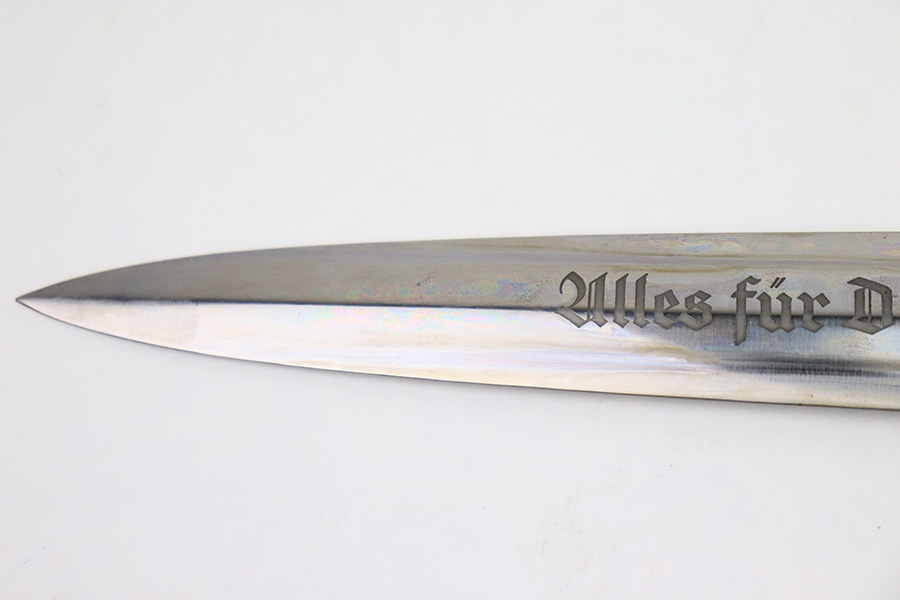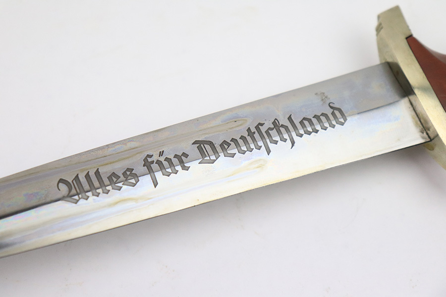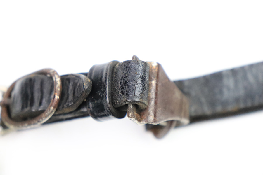 12/15/22 – This is an original NSKK Dagger from WW2 made by Kaufmann & Sohne. The dagger comes with an original scabbard and leather hanger. The dagger blade is in great condition displaying excellent cross-graining throughout. There’s some mild scabbard rub wear and typical mild surface scratching on both sides of the blade. There’s also some rainbow coloring that reflects off the blade (shown in photos) from old oil someone must have used to clean the blade at one point. The dagger has a crisp maker marking and is gruppe stamped on the cross guard “Nrh”. The solid nickel fittings are in great condition with some mild surface patina but no excessive wear. The wood handle is free from cracks, flaking, or chips. The scabbard has excellent original black paint with some very mild spots of paint loss. The hanger is RZM stamped on the leather and the metal clip has dark surface patina but still functions without issue.
