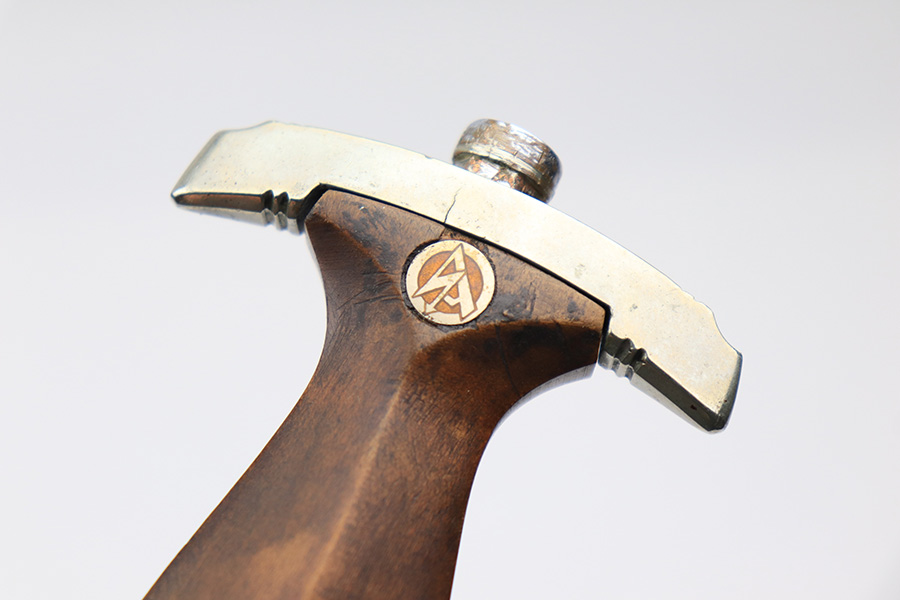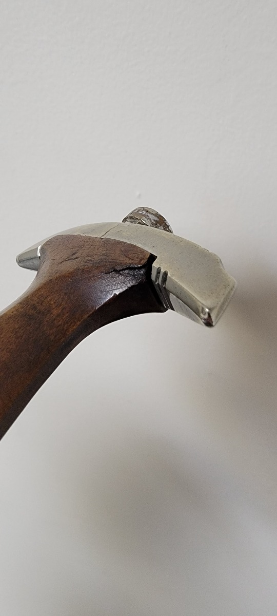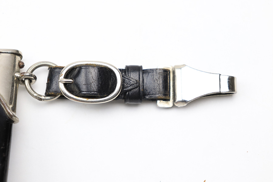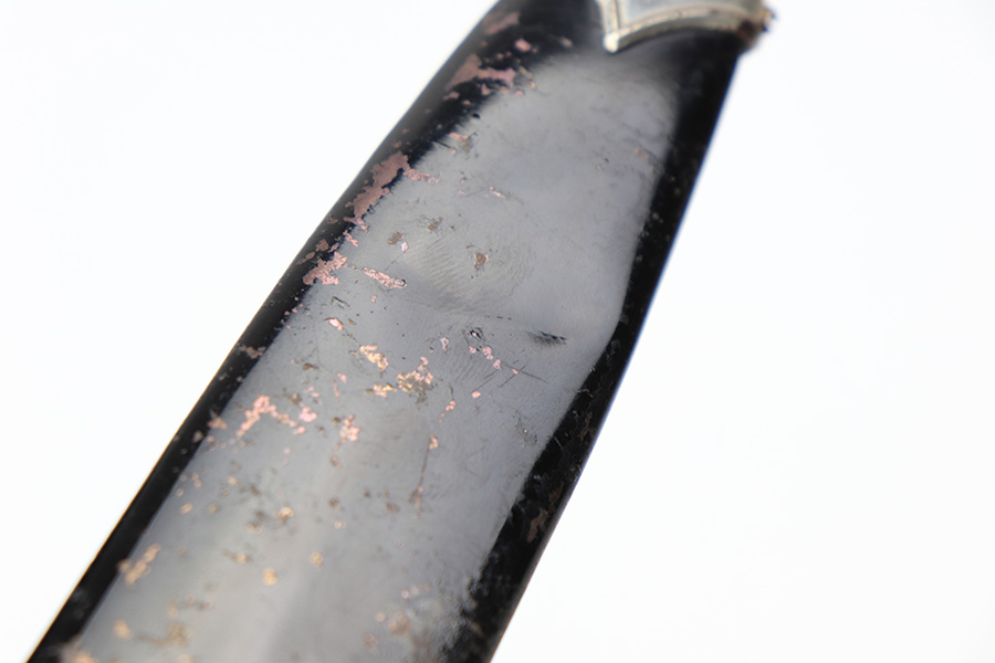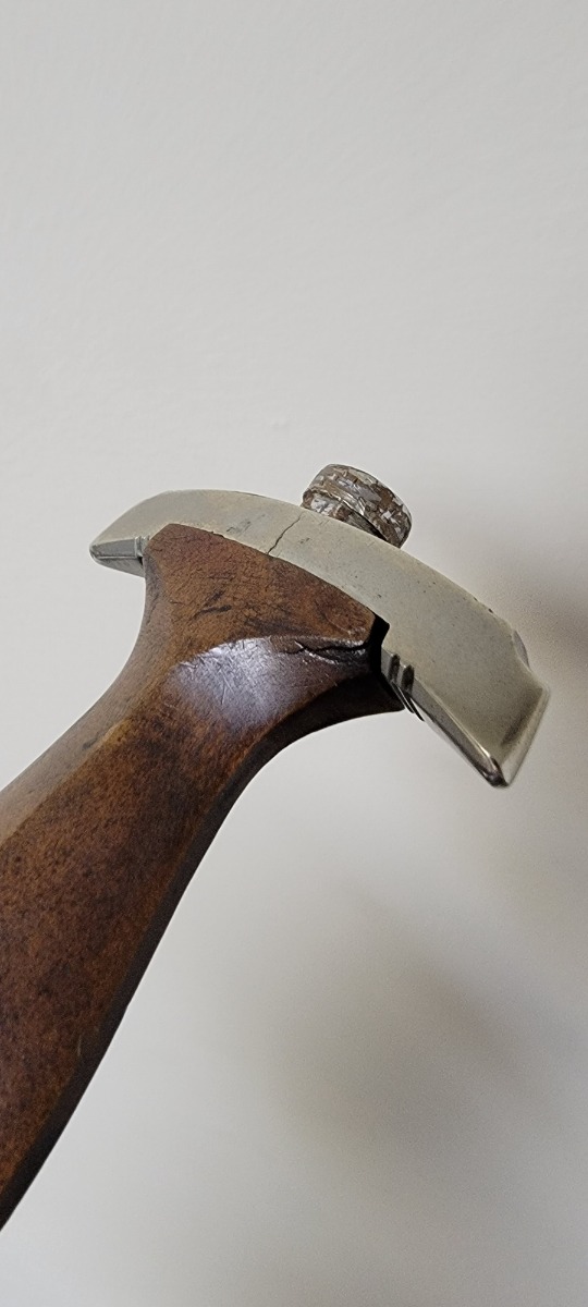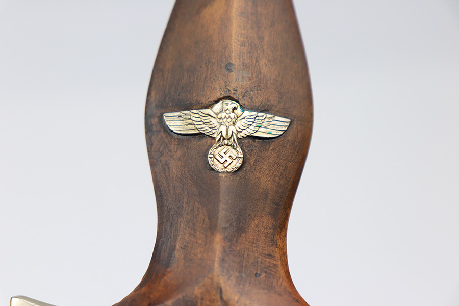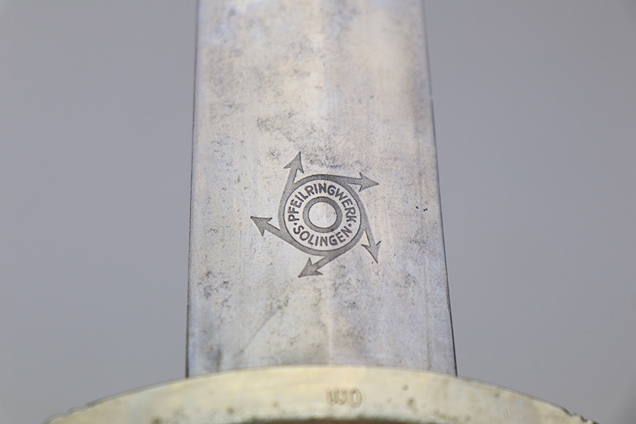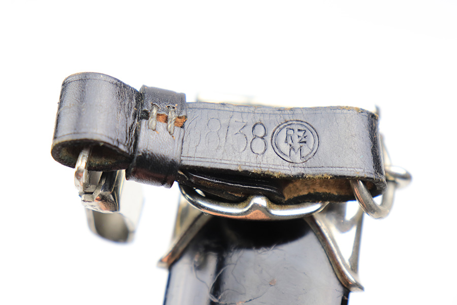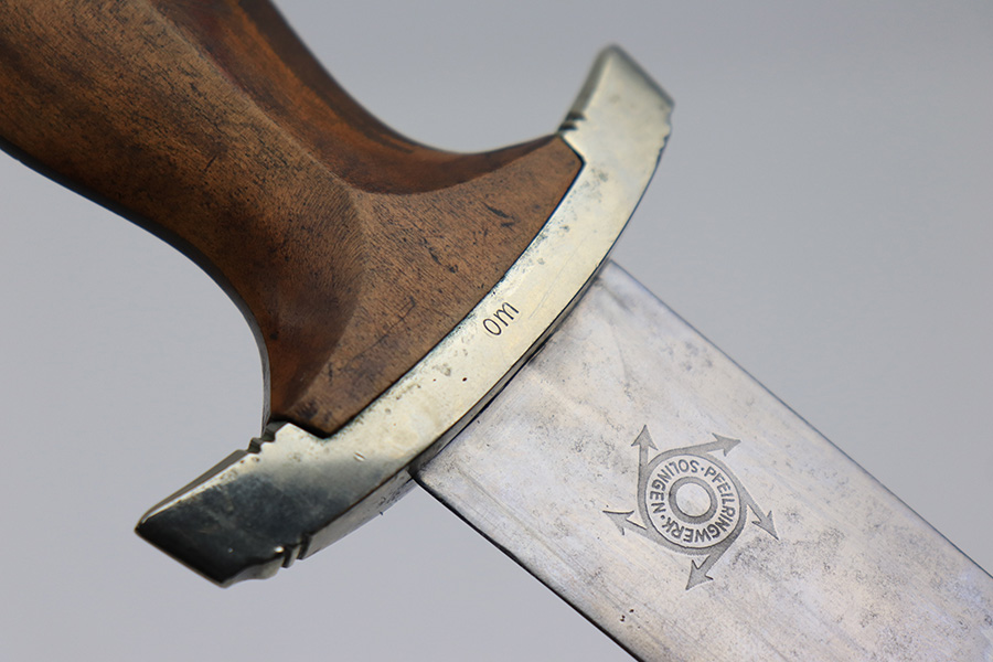 4/7/22 – This is an original WW2 German NSKK Dagger. The dagger comes with an original scabbard and leather hanger. The dagger blade is maker stamped by Pfeilringwerk and is in good overall condition. There’s light surface patina throughout the blade, but the cross graining is still evident and the maker stamp is crisp. The handle has a small crack at the top where the wood meets the pommel, and the hand guard is “Om” stamped. Unfortunately, there’s also a small crack on the backside of the pommel – see photos. Price reduced accordingly. The scabbard is in good condition with a few mild dents but no major issues. The hanger is RZM maker stamped.