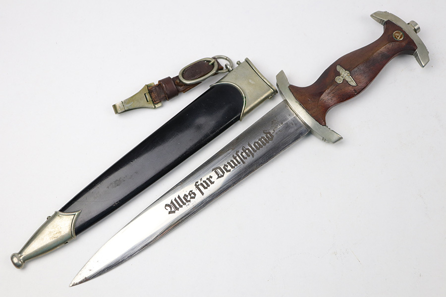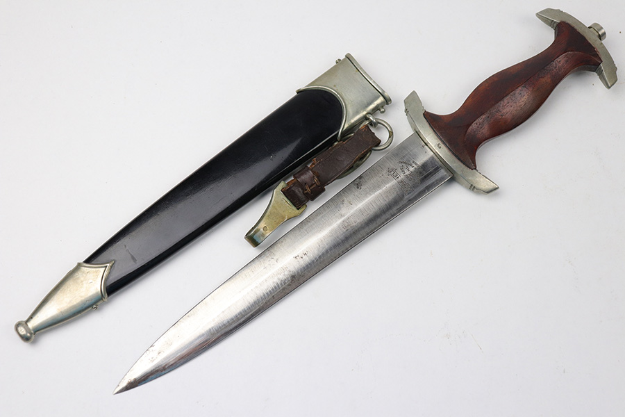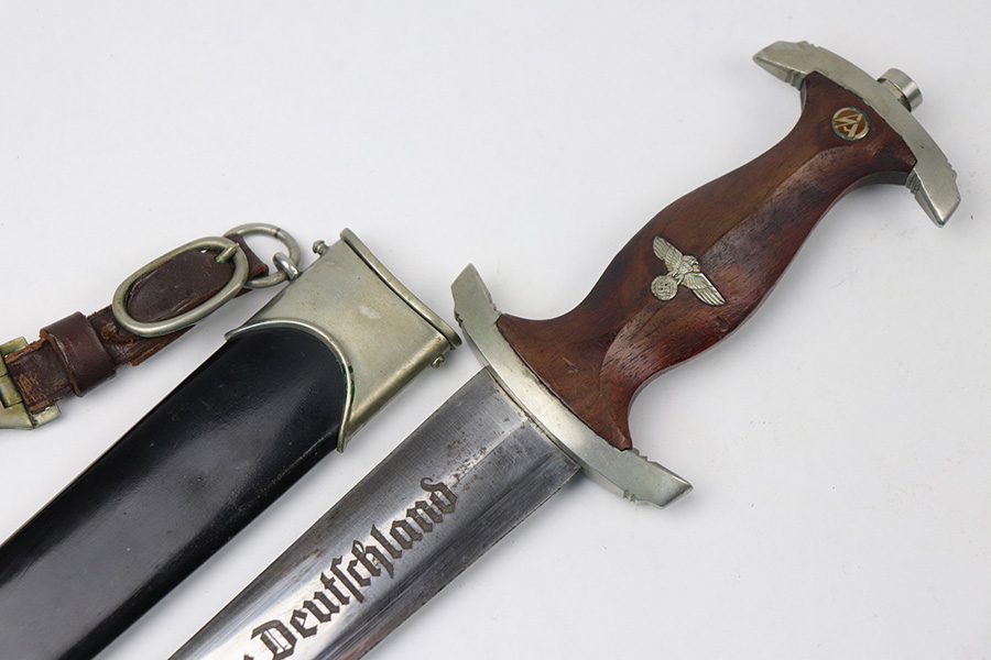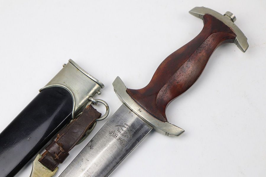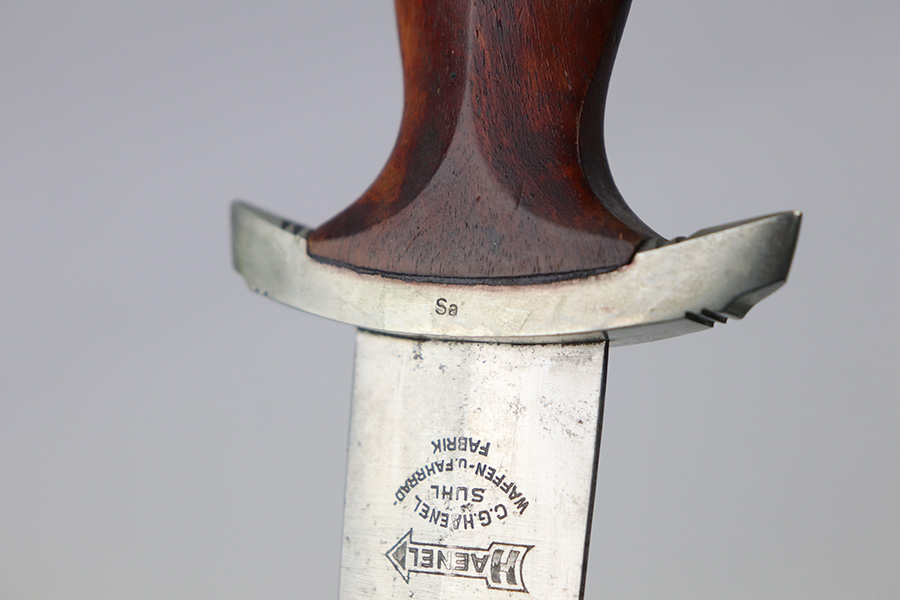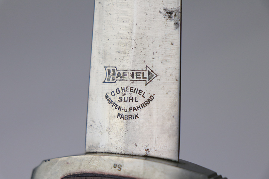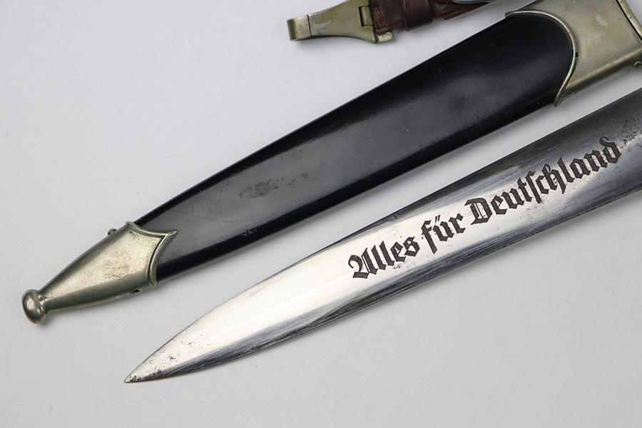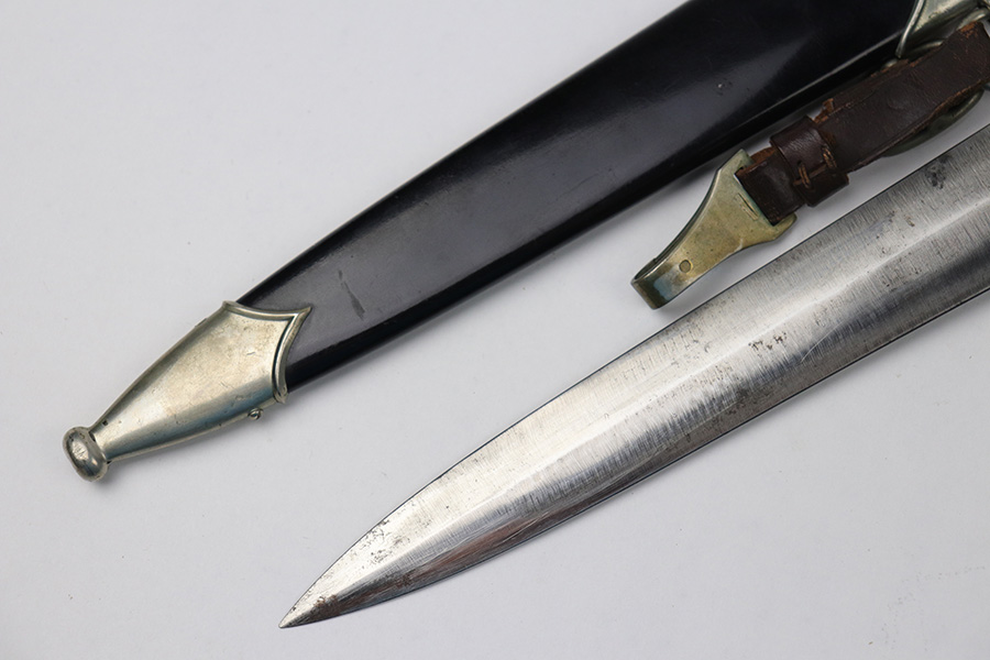 8/26/2021 – This is an excellent condition NSKK Dress or Parade Dagger. All original and authentic. The scabbard is excellent with very little wear or damage – Black in color to denote issuance to the NSKK. The blade has a little wear and rub marks, with Haenel markings and logo. Early nickel fittings with Sa marking, I believe to indicate Sachsen Gruppe. An original leather hanger is attached.