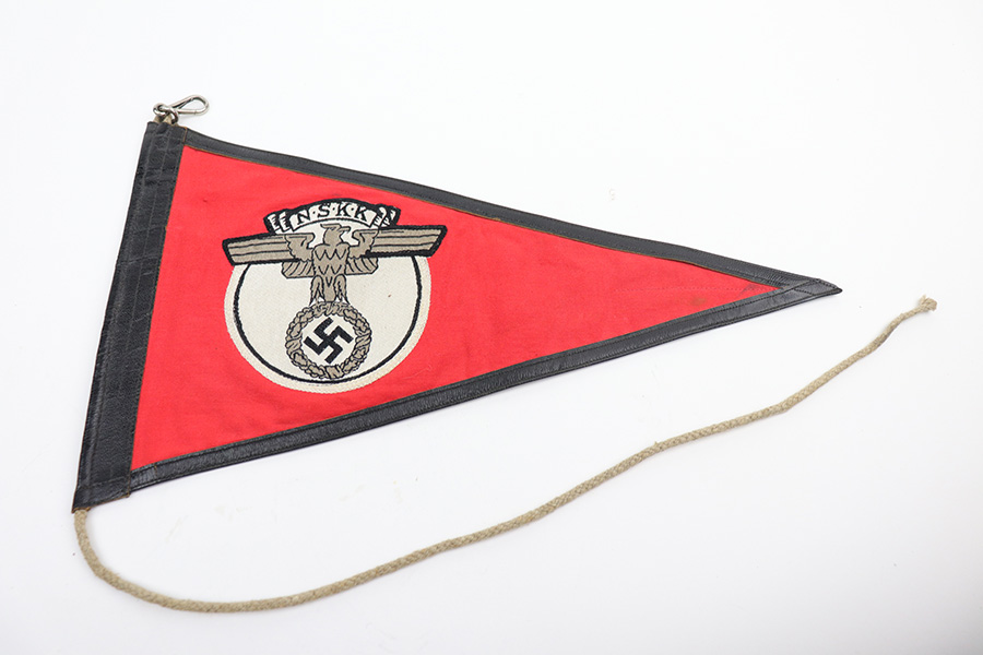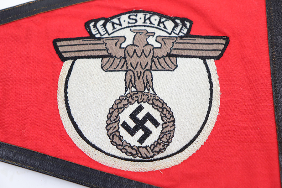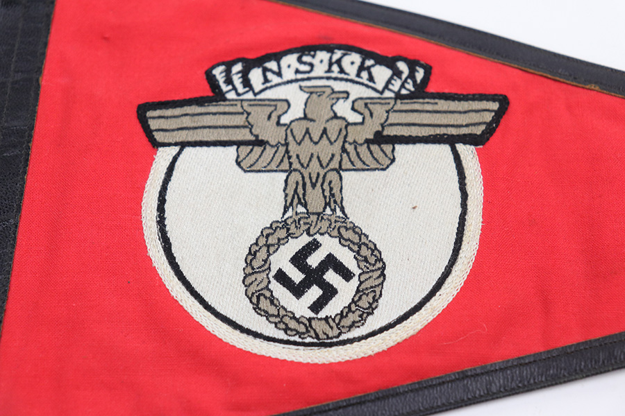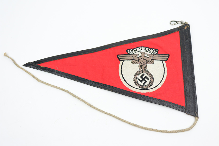 8/30/21 – This is an original NSKK Pennant flag from WW2. The flag is in excellent overall condition with an embroidered NSKK logo on each side. The flag has a black leather edge throughout. The rope is still attached as is the metal hook on the top. Measures about 12 inches long and 6.75 inches wide.