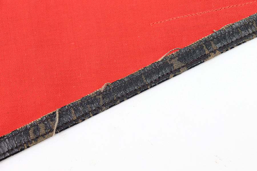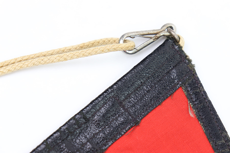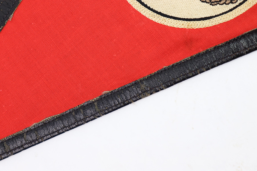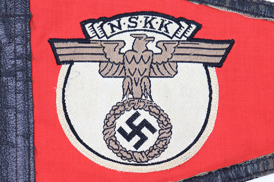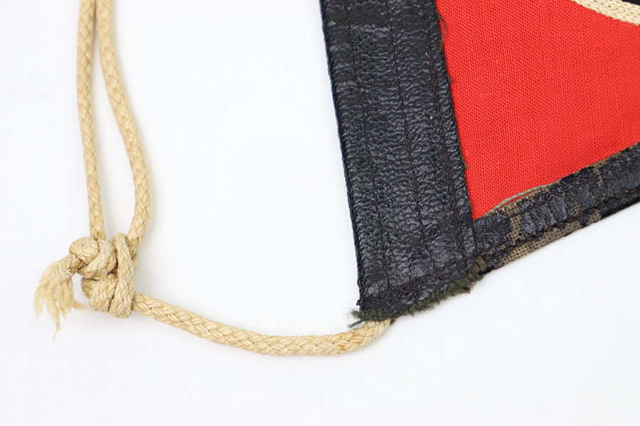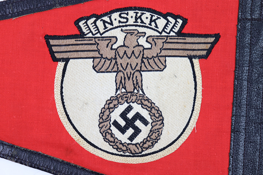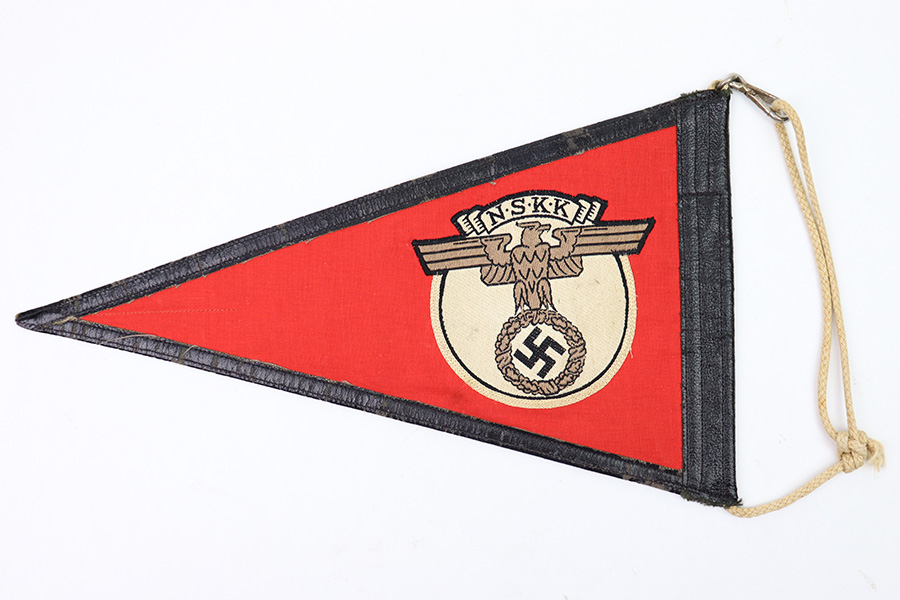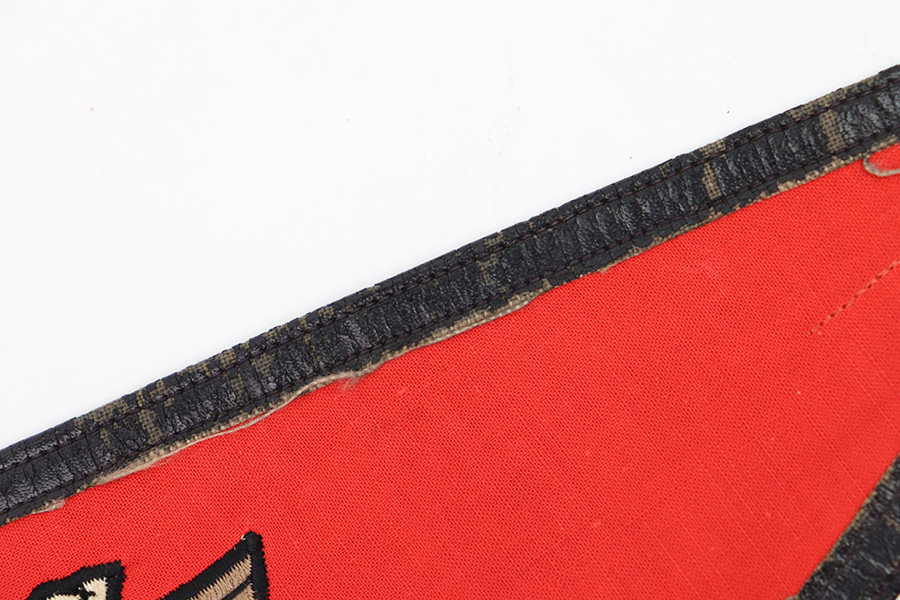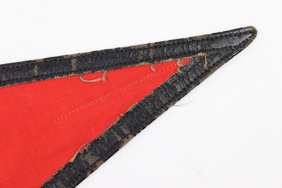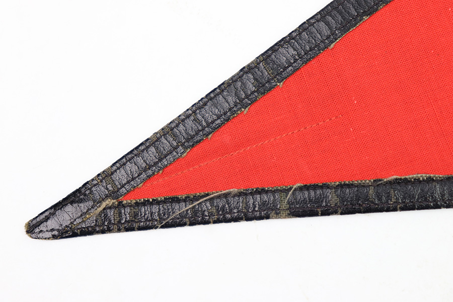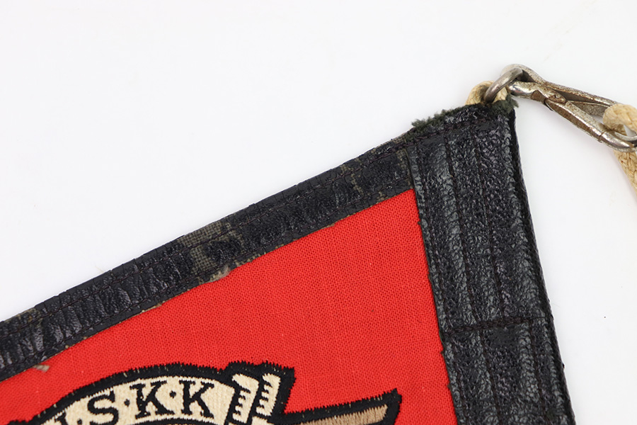 8/30/22 – This is an original NSKK vehicle pennant flag. The flag about 11.75 inches long and 6.2 inches wide. Double sided with the Nazi NSKK logo on each side. The original hanging rope / chord is still attached and in great shape with an original hanging clip as well. The black leather edge has surface scuffing and mild surface wear but is still intact. Excellent stitching throughout. No rips or tares.