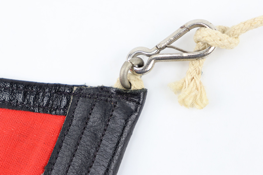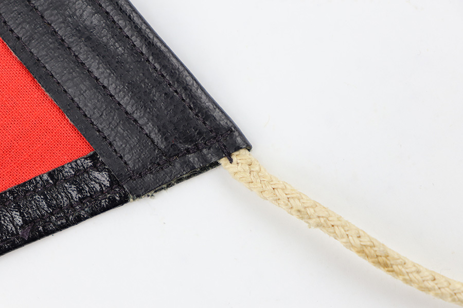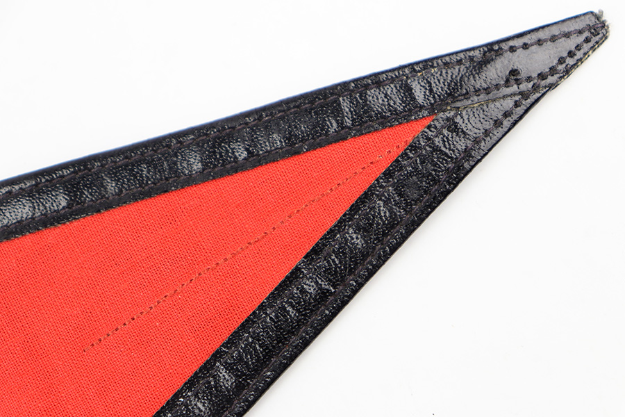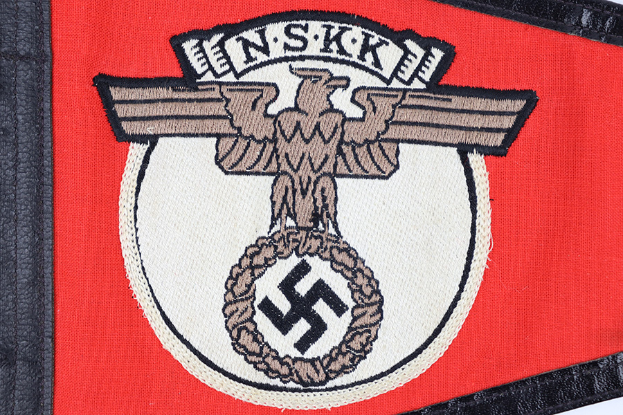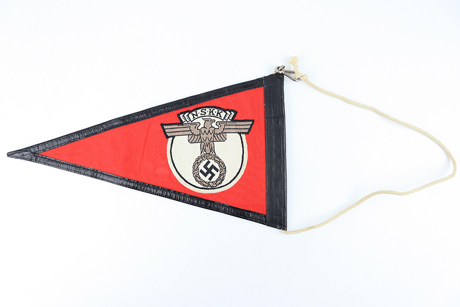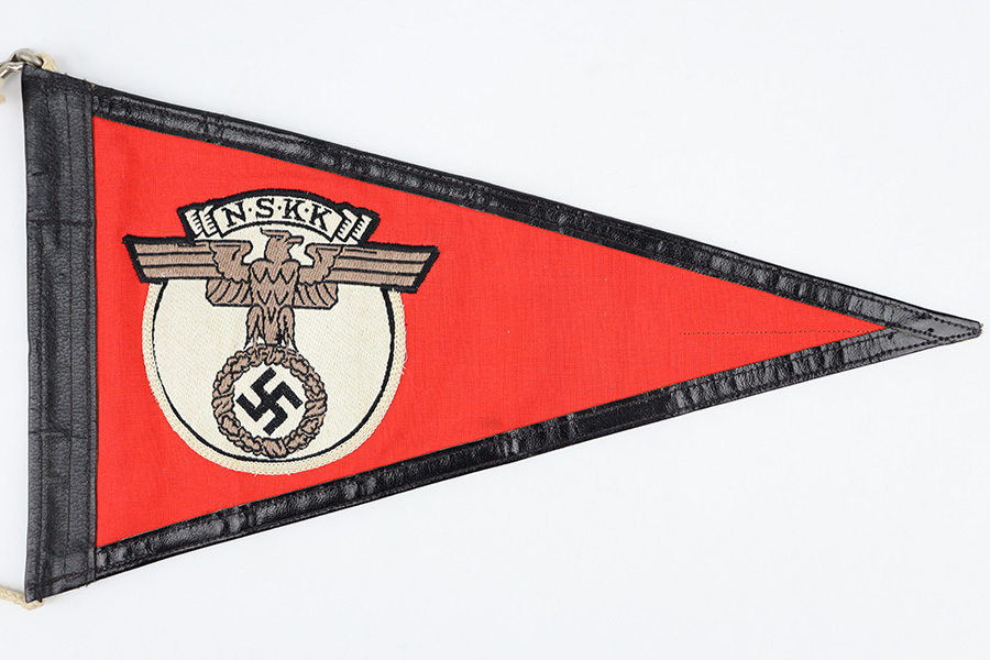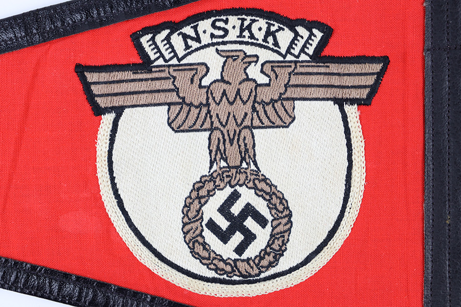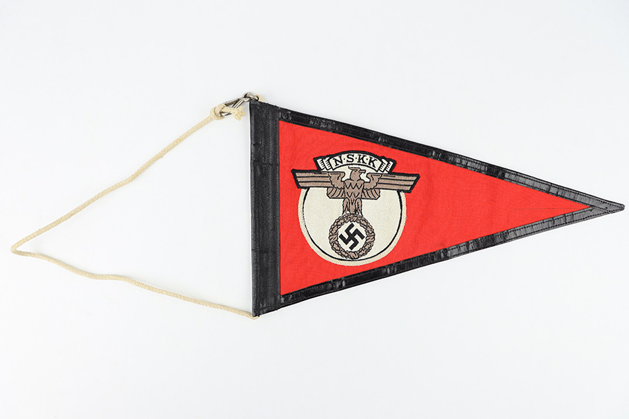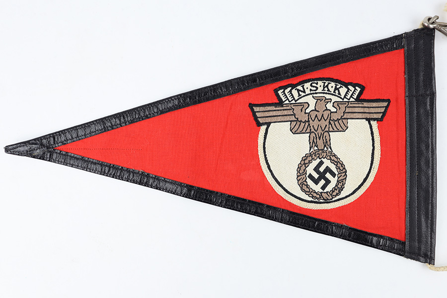 9/6/23 – This is an excellent, original NSKK Vehicle Pennant Flag. The flag retains the original black leather border and hanging rope, as shown. The colors and details on the flag are excellent on both sides with no loose stitches or notable stains. Measures 29.5cm from hoist to tip. Difficult to find a nicer example.