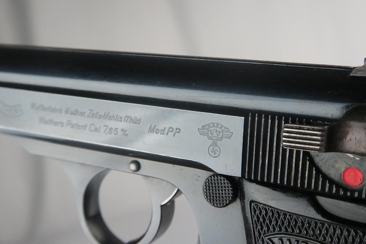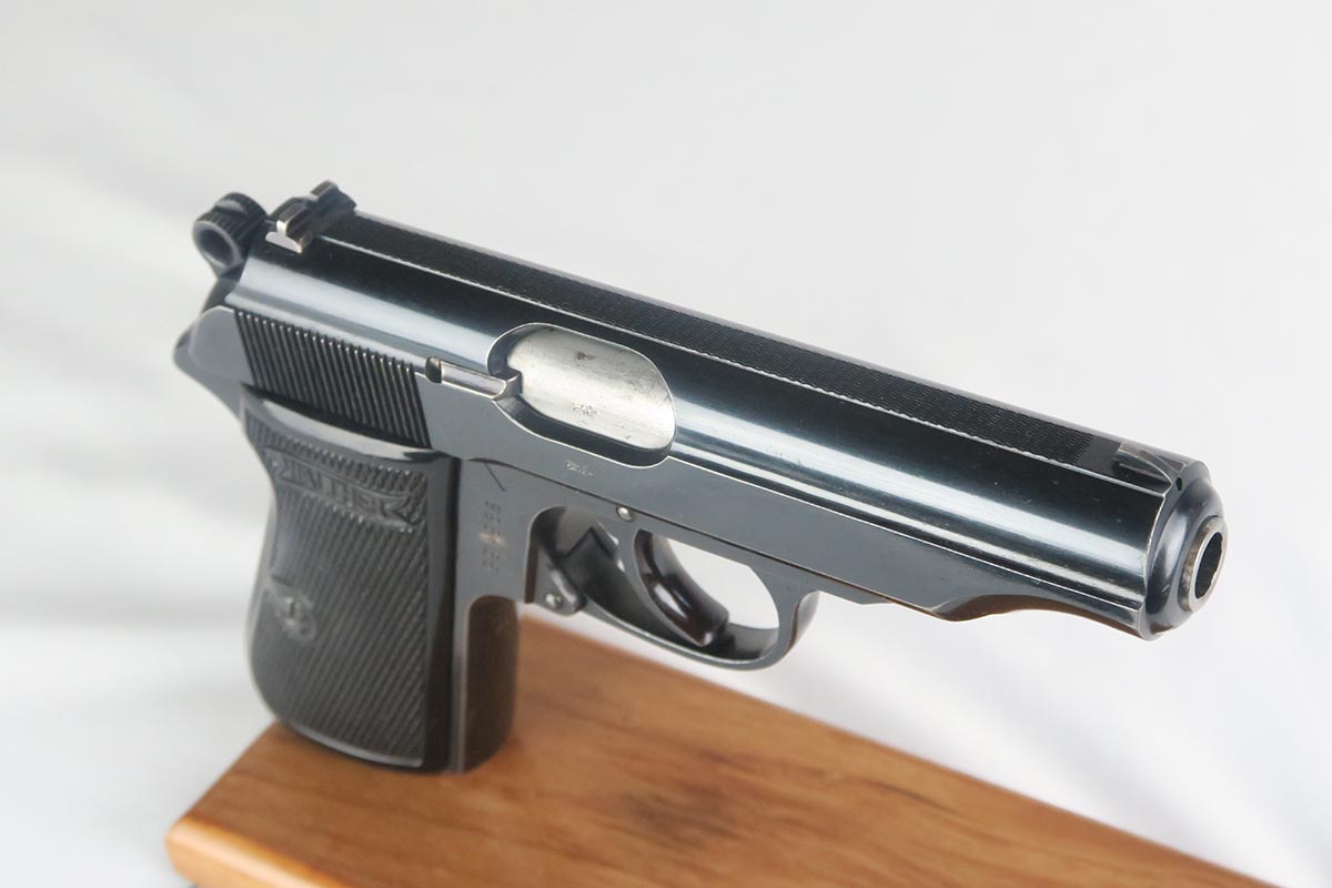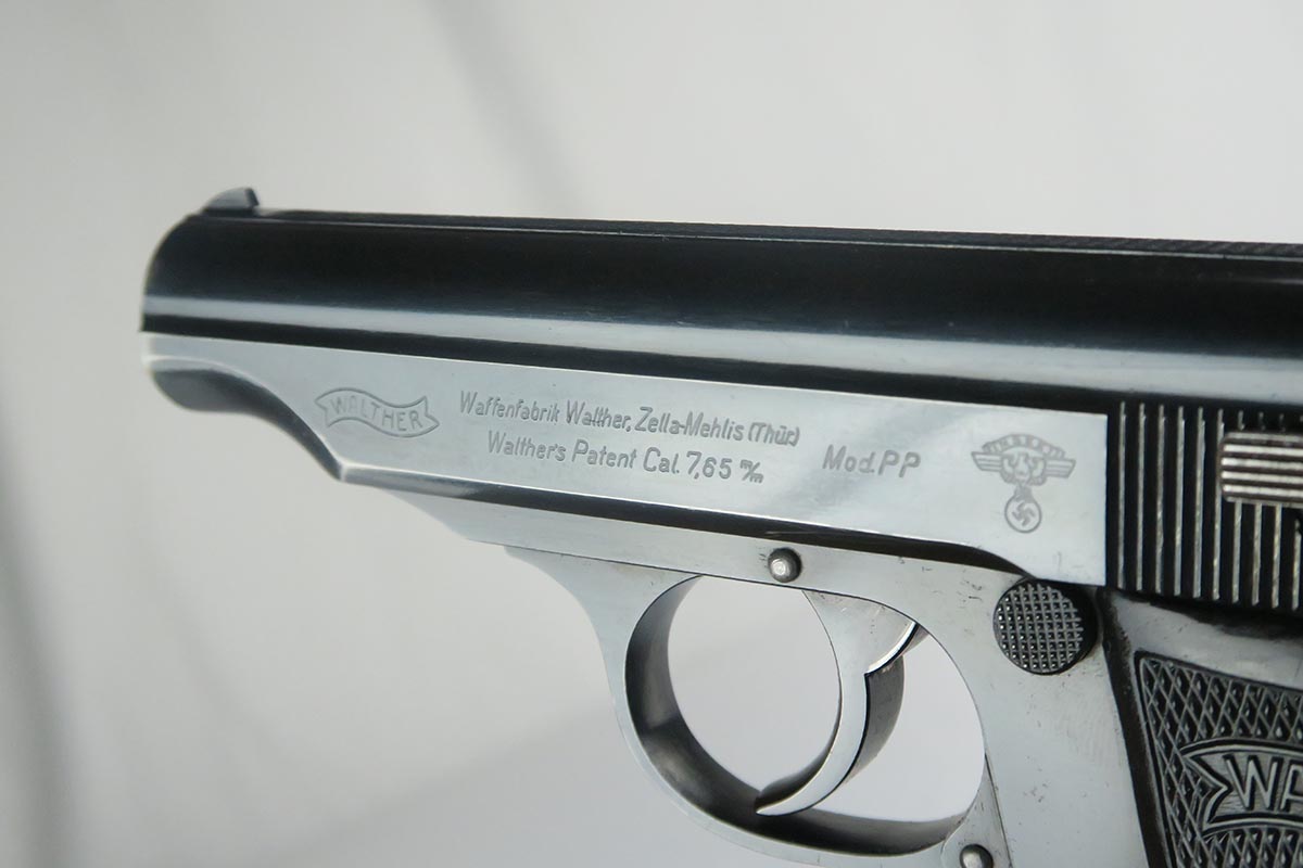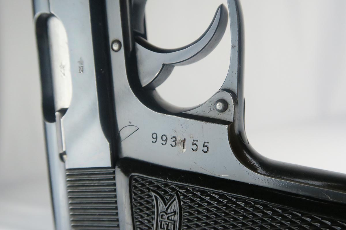 9/22/17 – This is an original 1937-38 production NSKK issued Walther PP pistol. NSKK was the designated official transportation branch of the NSDAP.  There were about 3,500 such pistols issued, and ~100 reported serials. This pistol is all original and correct with about 95-96% blue remaining.  The majority of the finish loss is found on the front and back strap, along with some minor edge wear near the muzzle. The photos accurately show the conditions and minor flaws. There is a blemish over part of the serial number, but the serial is still easily legible.  Excellent grips and magazine.  Crown/N proofs on slide and frame.  Minty bore with some minor patina, but overall shiny with nice rifling.