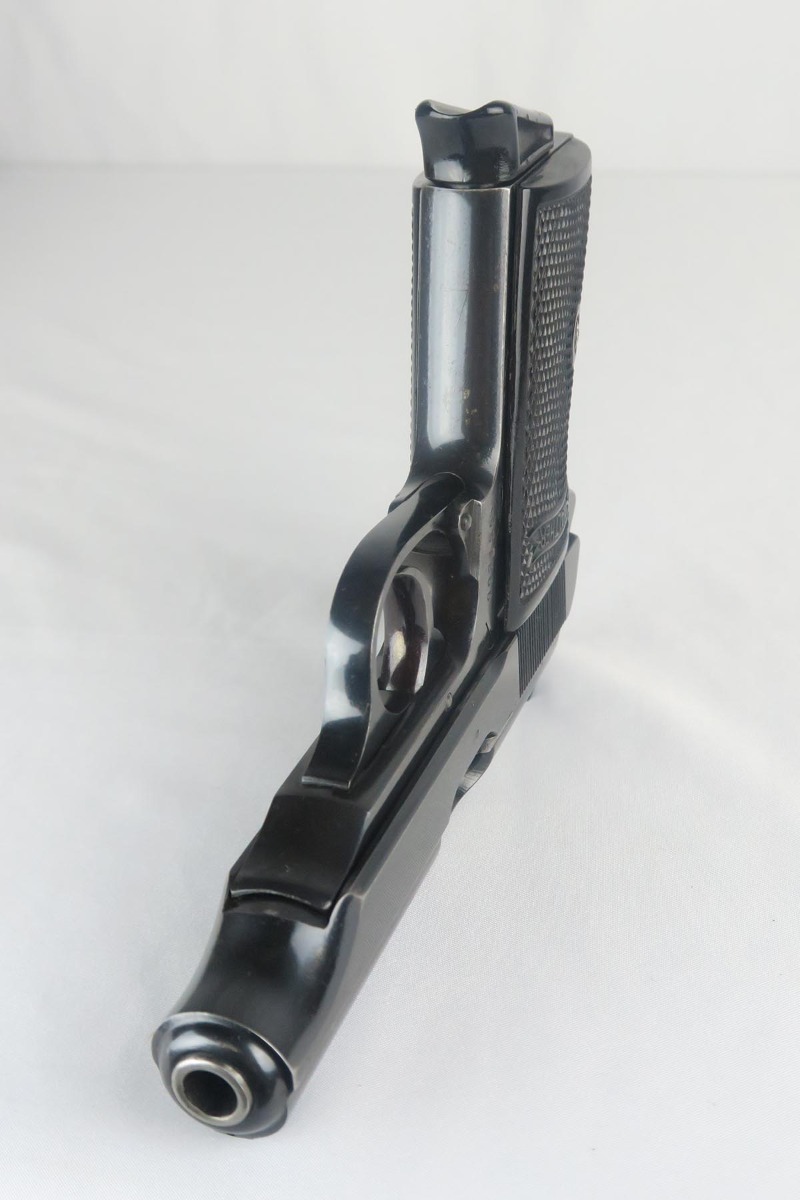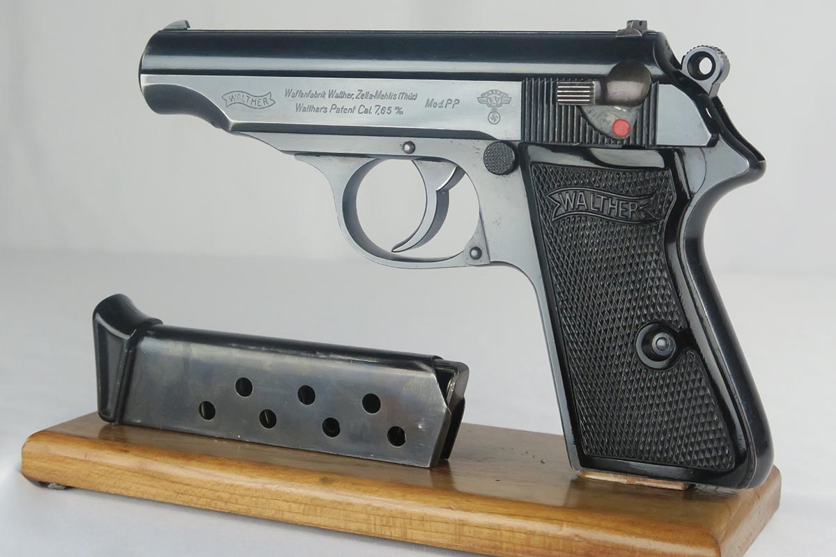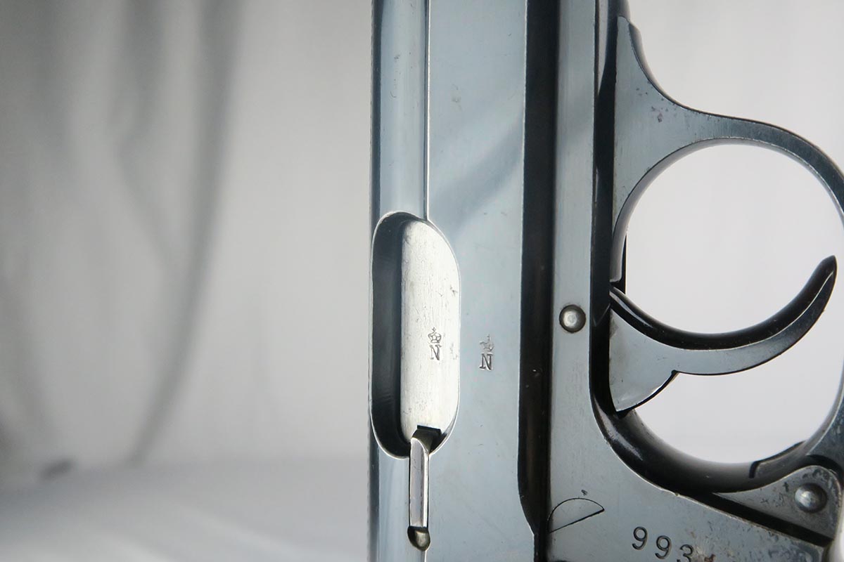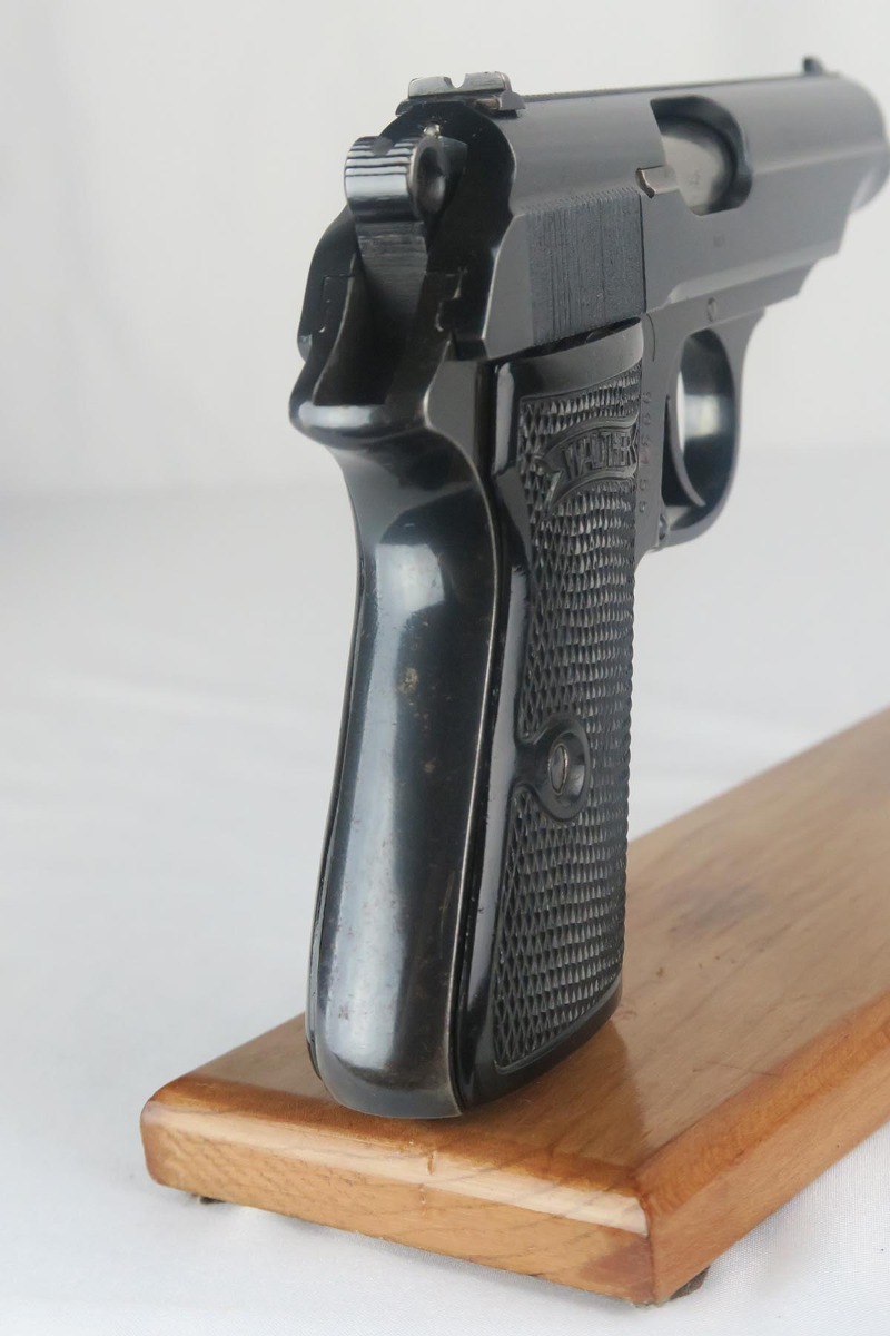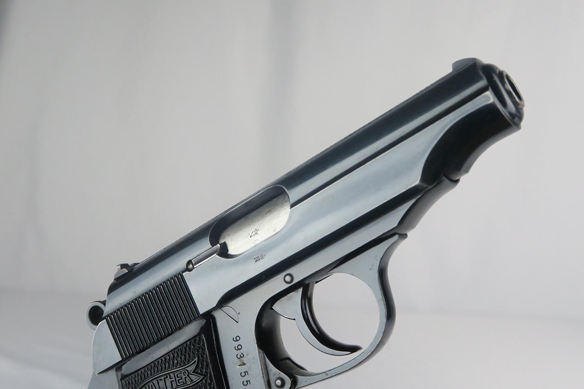 9/22/17 – This is an original 1937-38 production NSKK issued Walther PP pistol. NSKK was the designated official transportation branch of the NSDAP.  There were about 3,500 such pistols issued, and ~100 reported serials. This pistol is all original and correct with about 95-96% blue remaining.  The majority of the finish loss is found on the front and back strap, along with some minor edge wear near the muzzle. The photos accurately show the conditions and minor flaws. There is a blemish over part of the serial number, but the serial is still easily legible.  Excellent grips and magazine.  Crown/N proofs on slide and frame.  Minty bore with some minor patina, but overall shiny with nice rifling.