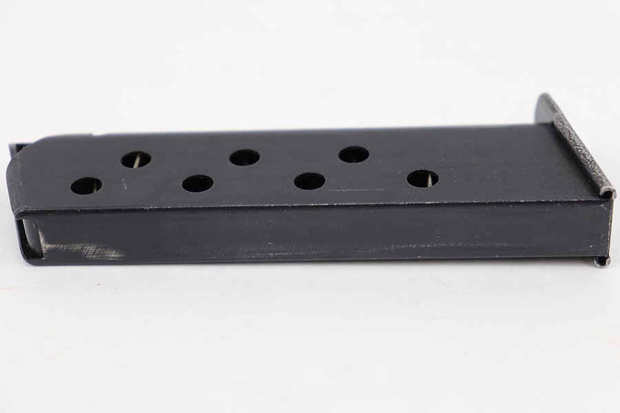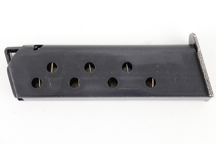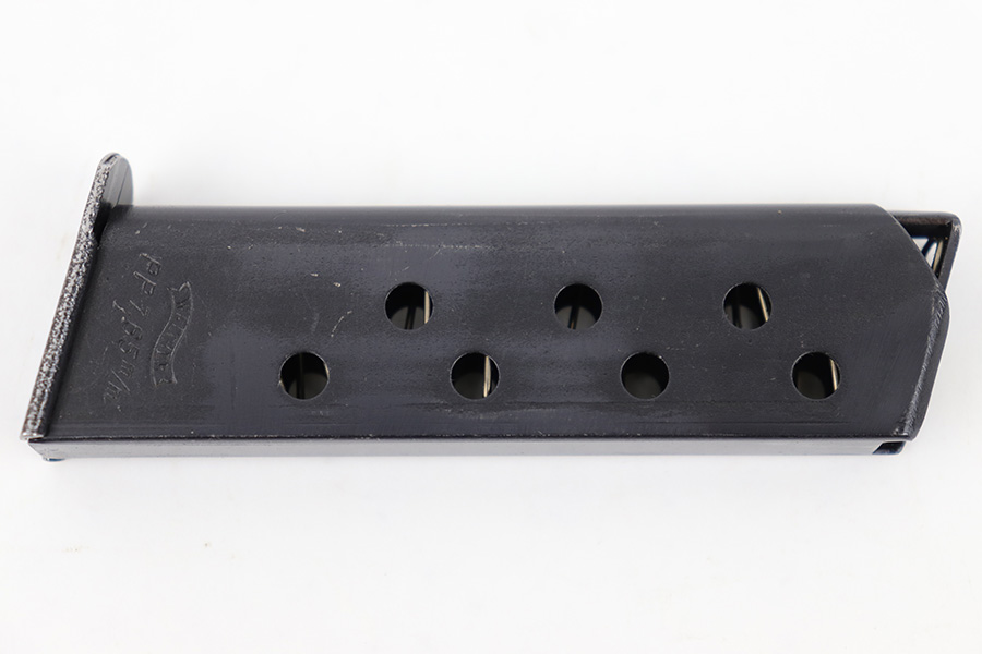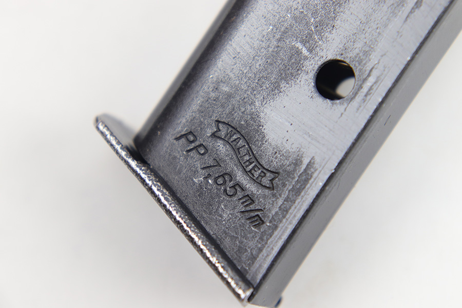 4/21/23 – This is an original WW2 production Walther PP magazine. The magazine features a numbered base plate, which falls into a known range of Luftwaffe issued Walther PP pistols. The magazine tube is excellent with strong bluing throughout and minimal surface wear. The base plate has some mild edge wear and patina but no major issues. Strong, functional spring.