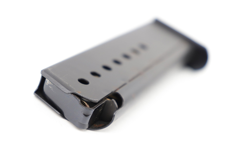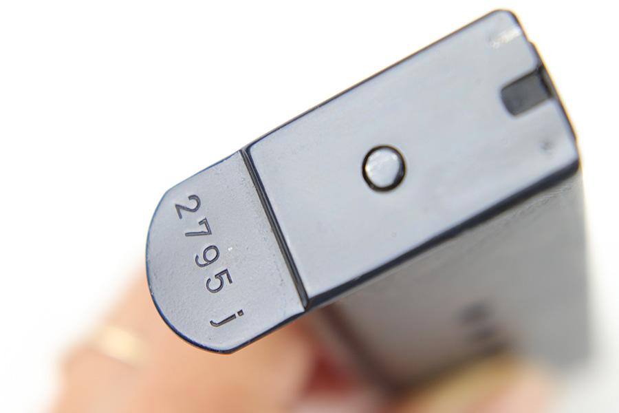 5/25/23 – This is an original, early Walther P.38 magazine from WW2. The magazine is all original except for the finish on the base, which has been re-blued. The price is reduced accordingly. The magazine tube is stamped P.38 with two eagle 359 proof stamps on the spine. The base is serial numbered 2795j. Excellent, fully functional spring.