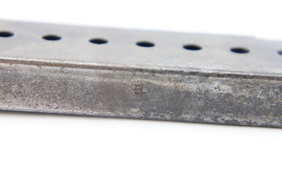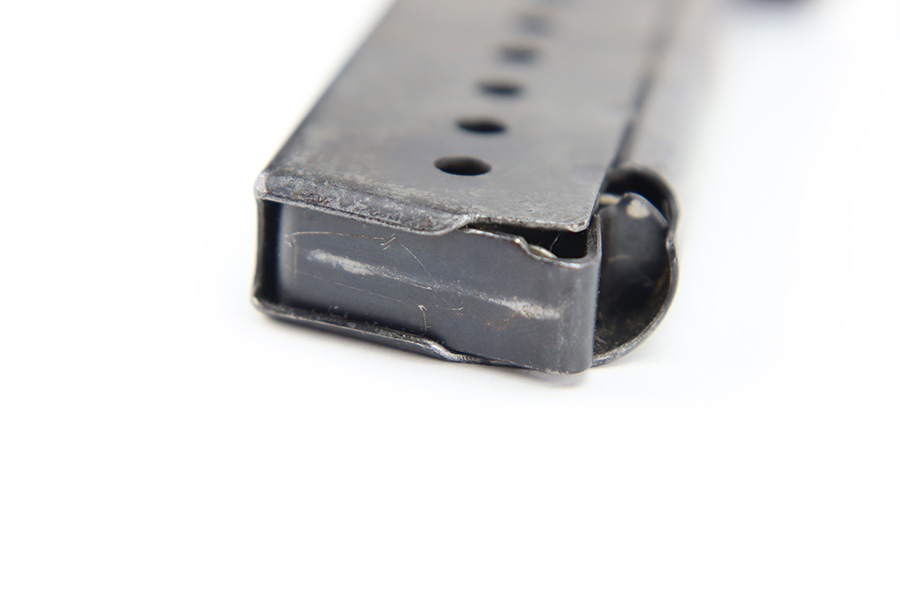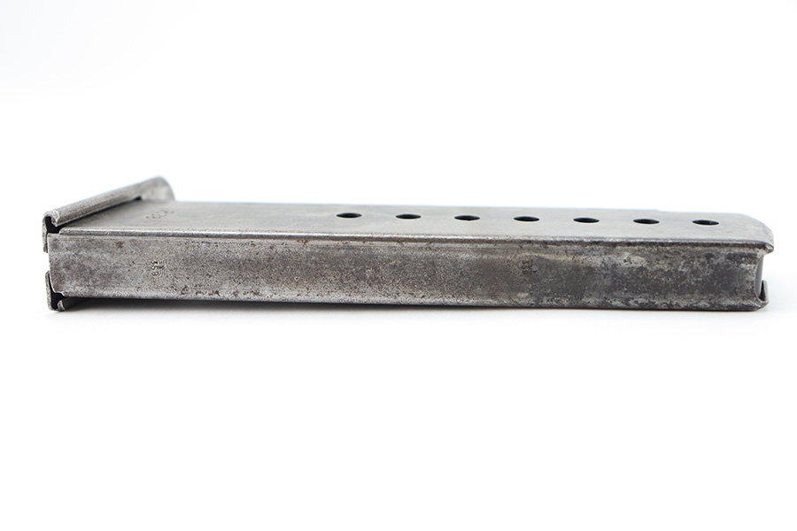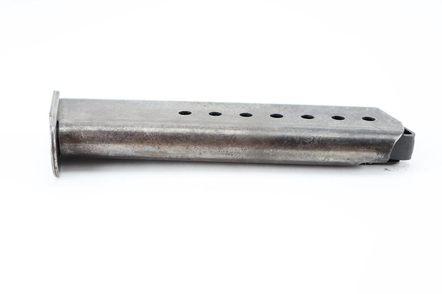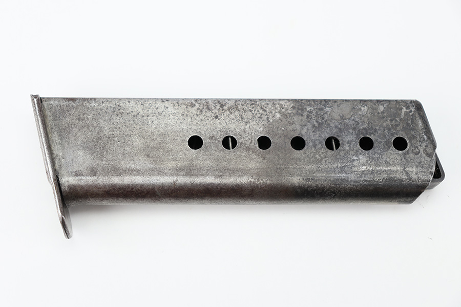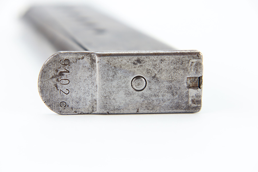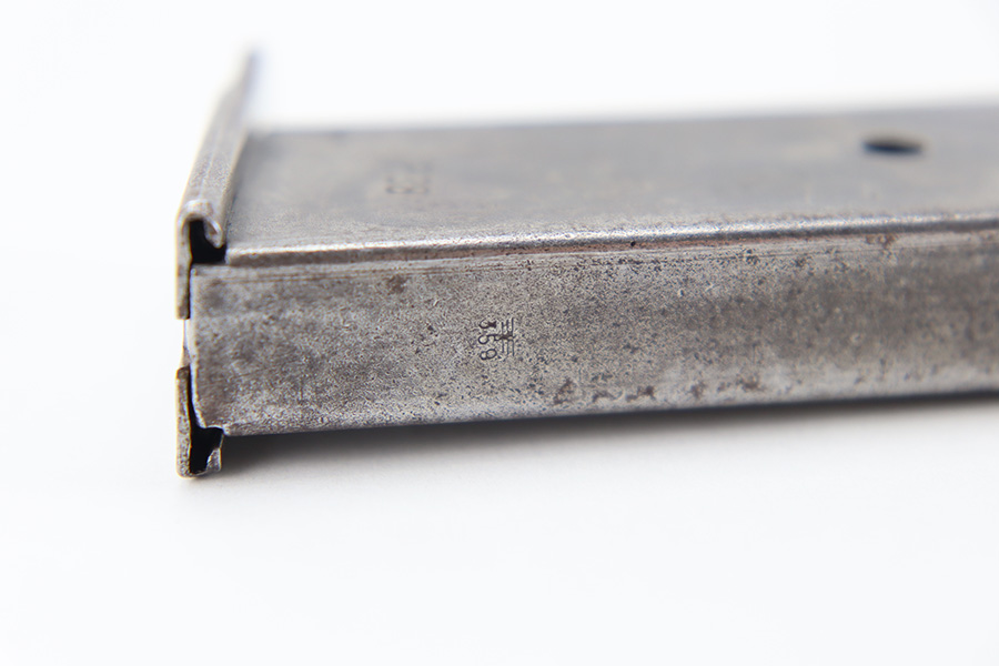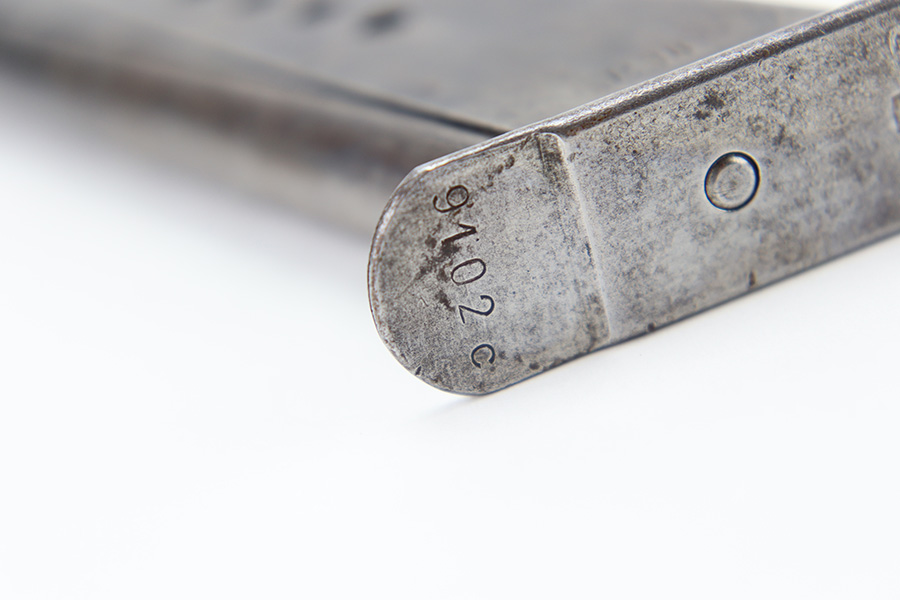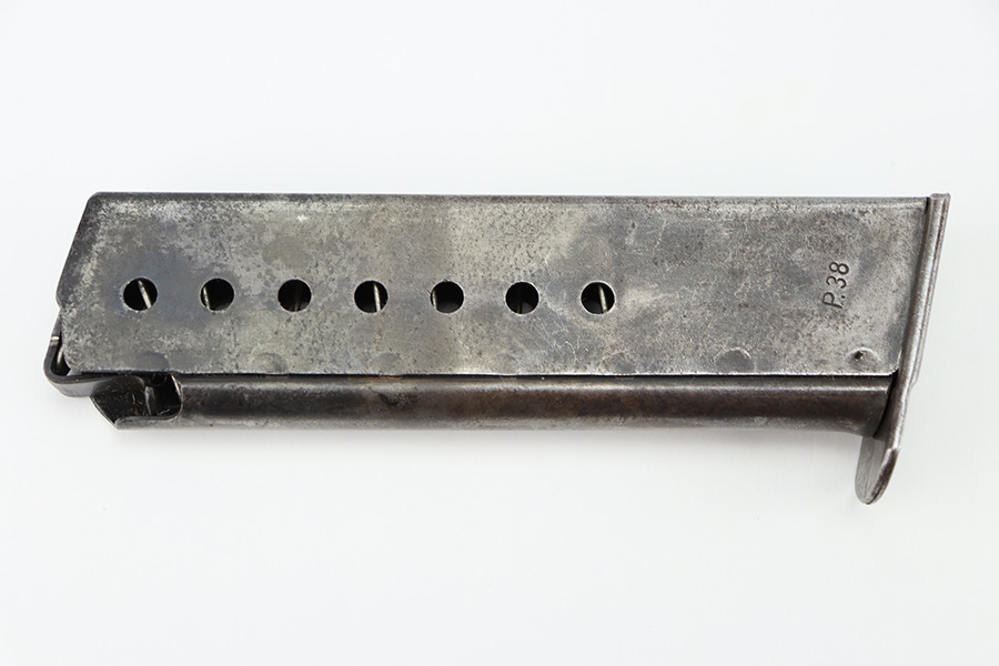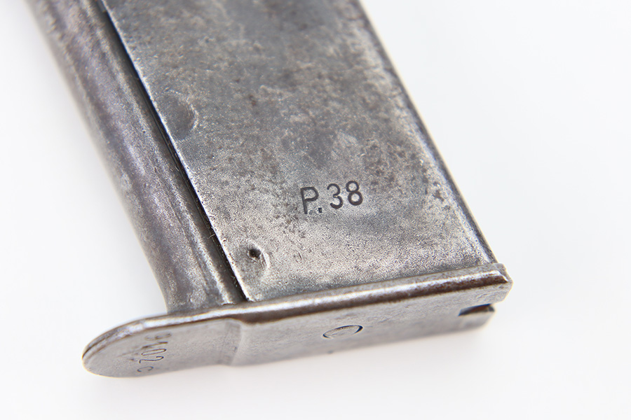 11/17/23 – This is an early Walther production, numbered P.38 magazine from WW2. The magazine is in good overall condition with dark surface patina and finish loss throughout. No rust or pitting however, only a natural aged look. The left side of the tube is P.38 stamped and there are two eagle 359 military proof stamps on the spine. The base is serial numbered 9102c. Strong, functional spring.