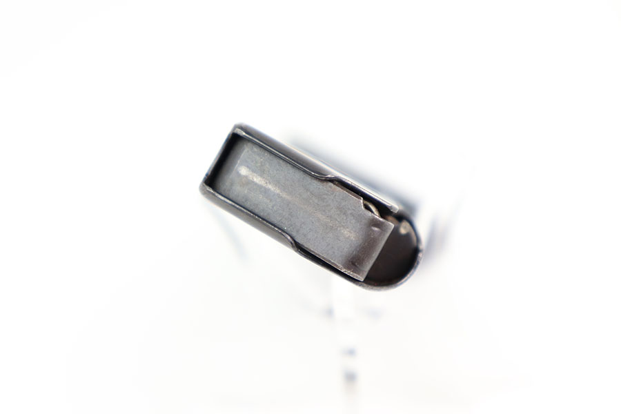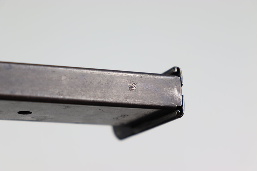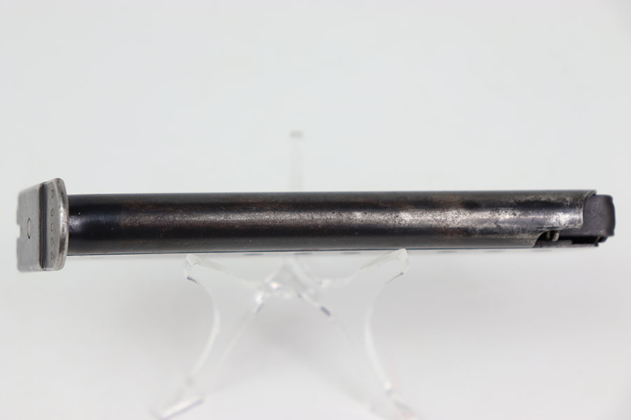 3/29/24 – This is a “transitional” style P.38 magazine from WW2. The magazine is transitional because it has early features such as a P.38 stamp on the left side of the tube, and a numbered base. The spine has two eagle 359 military proof stamps. Therefore this magazine is most appropriate for an AC 41 P.38 pistol. Excellent overall condition with some mild finish loss but no rust or pitting and a fully functional spring. The base is numbered 2206g.
