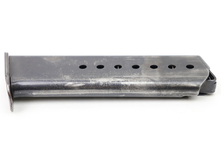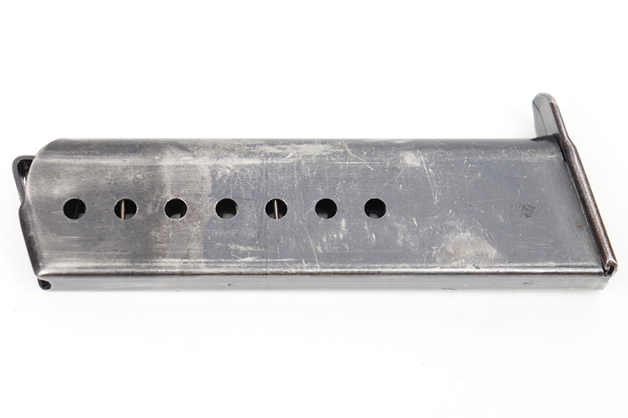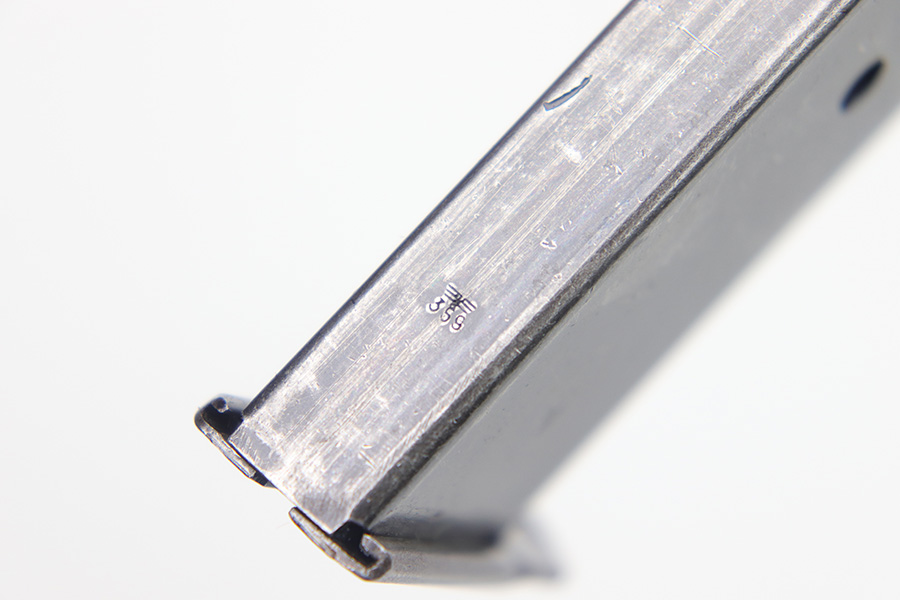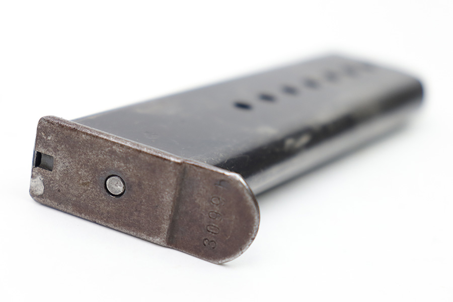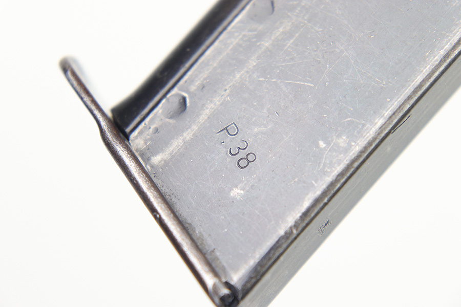 1/26/23 – This is an original early production Walther P.38 magazine with a numbered base. Most appropriate for 1940-41 production P.38s. The magazine is stamped P.38 on the left side, and has two eagle 359 military proof stamps on the spine. The base of the magazine is serial numbered 3099h. The magazine is in great shape with some light finish loss throughout the tube, and some dark patina on the base. The spring is strong and fully functional.