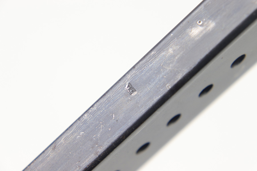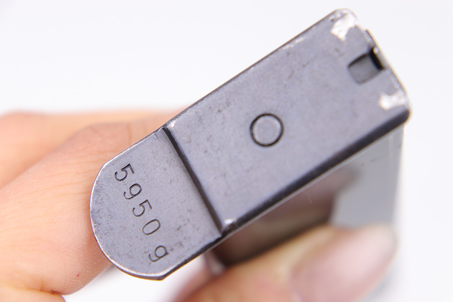 3/1/23 – This is an original, early Walther production P.38 magazine. The magazine is in great condition with most of the original finish intact, and only some mild surface patina and finish loss. No rust or pitting. The spine is stamped with two eagle 359 military proof stamps, and the left side is P.38 stamped. The base of the magazine is numbered 5950g, in a style that’s correct for AC 41 and AC 42 pistols. Fully functional spring.