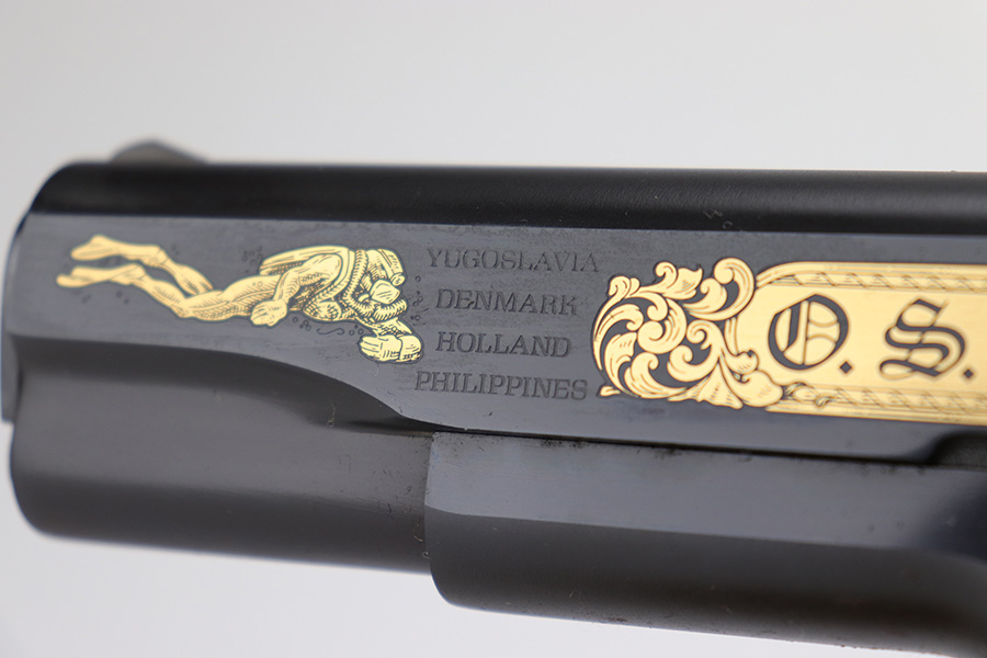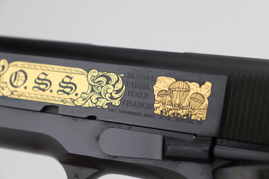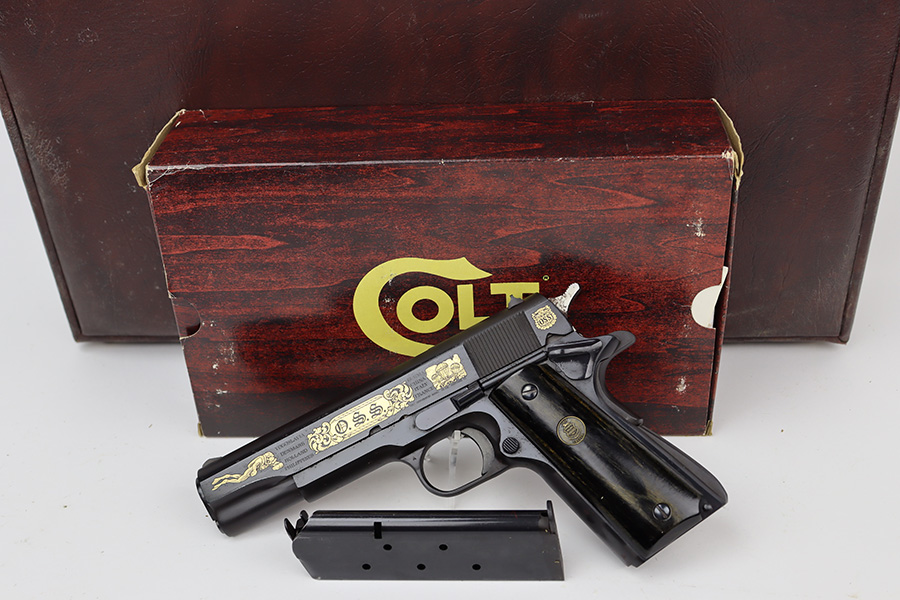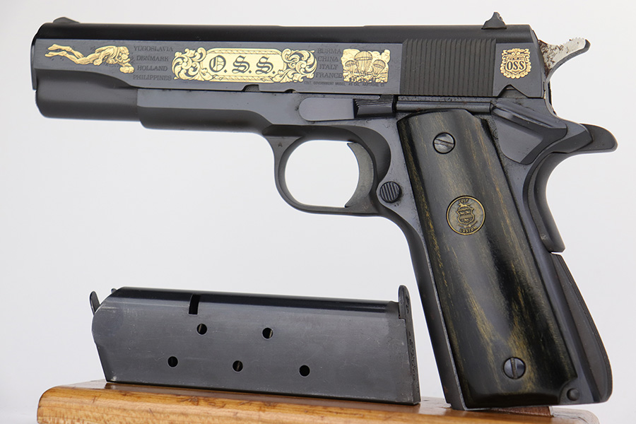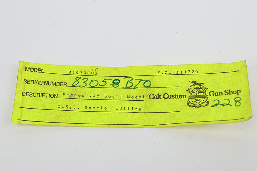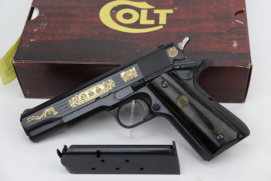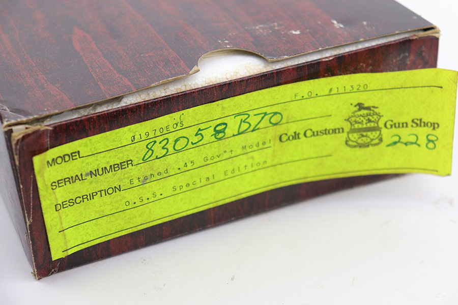 6/15/23 – This is a rare series 70 Colt that was made to commemorate the O.S.S, which was the predecessor to the C.I.A. Only 250 of these were produced, and this one is in nearly unfired condition aside from some rust that got on the hammer from moisture exposure. The listing includes the original box and Styrofoam insert, and the box has the matching serialized label (though it has fallen off). These were also sold with a briefcase that had a book on OSS history and a mag pouch but only the briefcase remains with this listing.