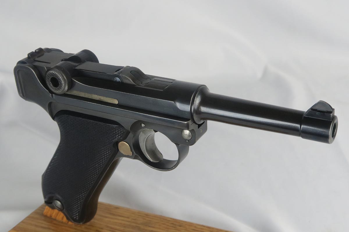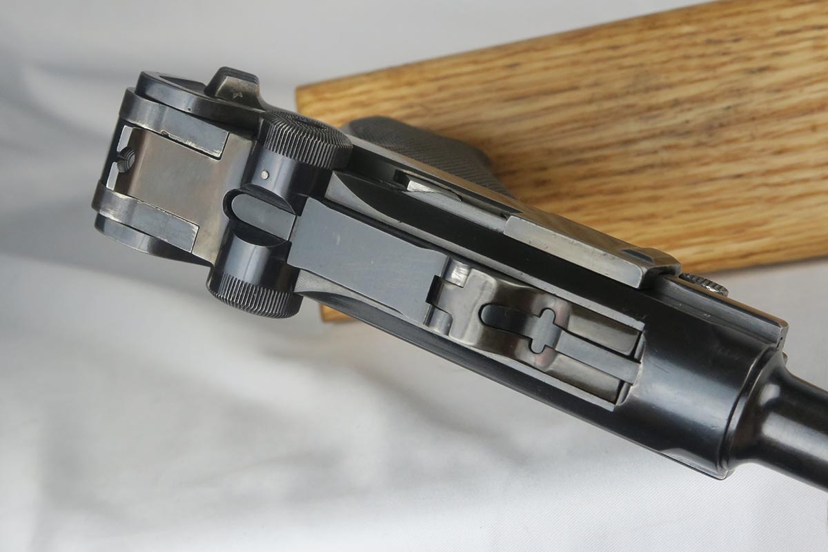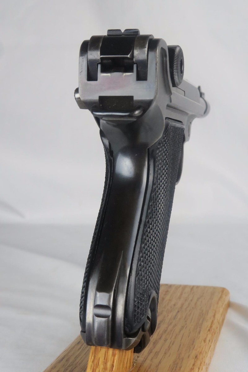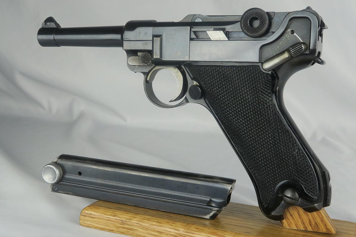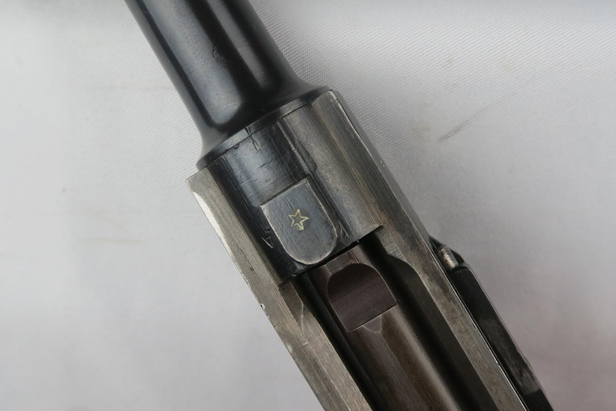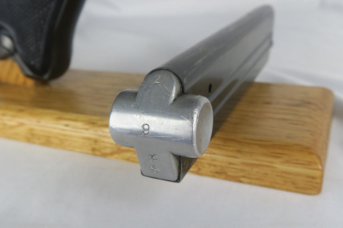 10/31/17 – This is an oddball luger that was put together from leftover Mauser and Krieghoff parts.  These guns were generally assembled after the war from wartime parts, and sold at the PX store in Germany so that GI’s had souvenirs to take home from their time in Germany.  This one shows serial number 9 on the frame and serial, but no other parts are numbered at all.  The barrel and receiver have Crown/N proofs, and there is a star proof(French?) on multiple parts (barrel, safety, internal sideplate, etc).  The pistol is chambered in .30 and has excellent Black Widow-style grips.  The finish on this one is a little difficult to rate, as there is brown showing through in a few areas, but there isn’t much rub wear or finish loss.  Excellent bore.
