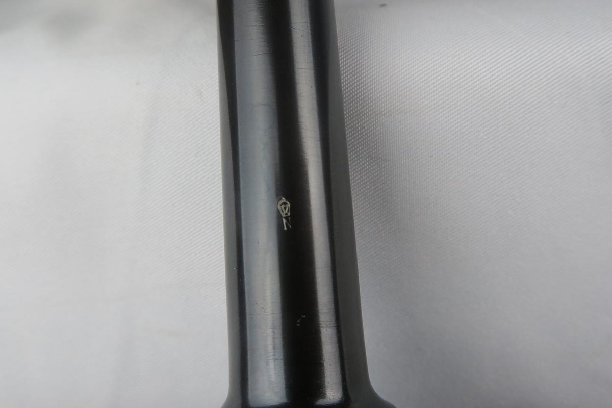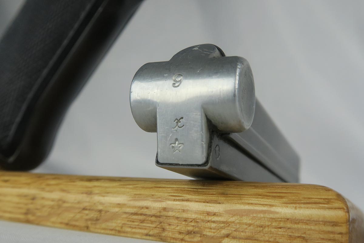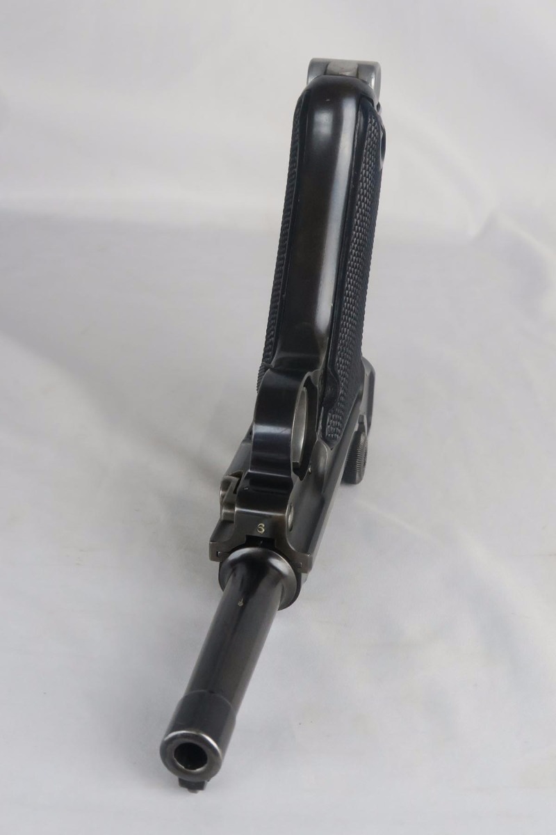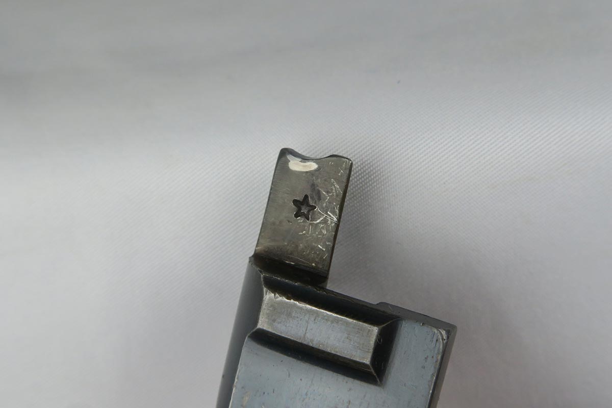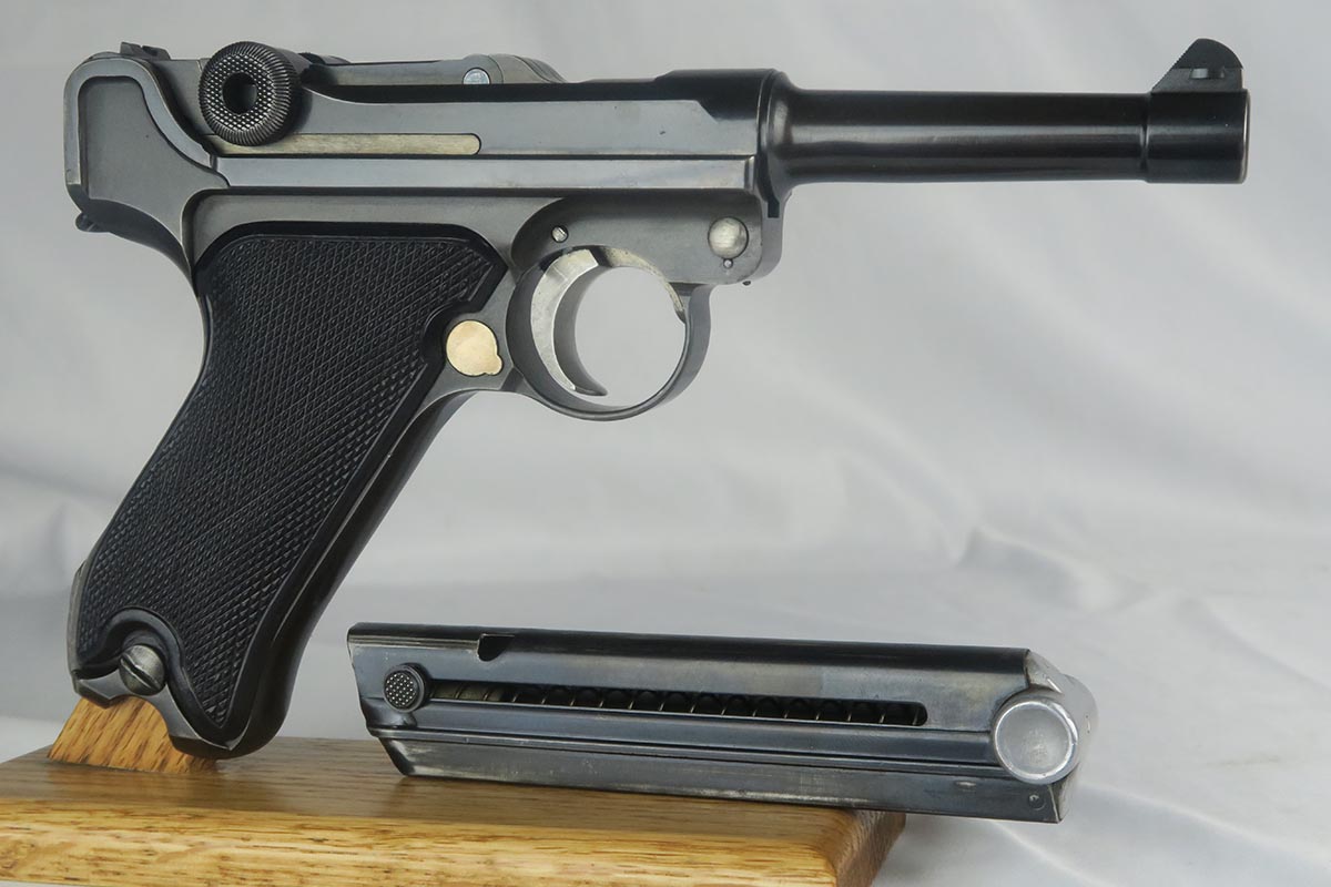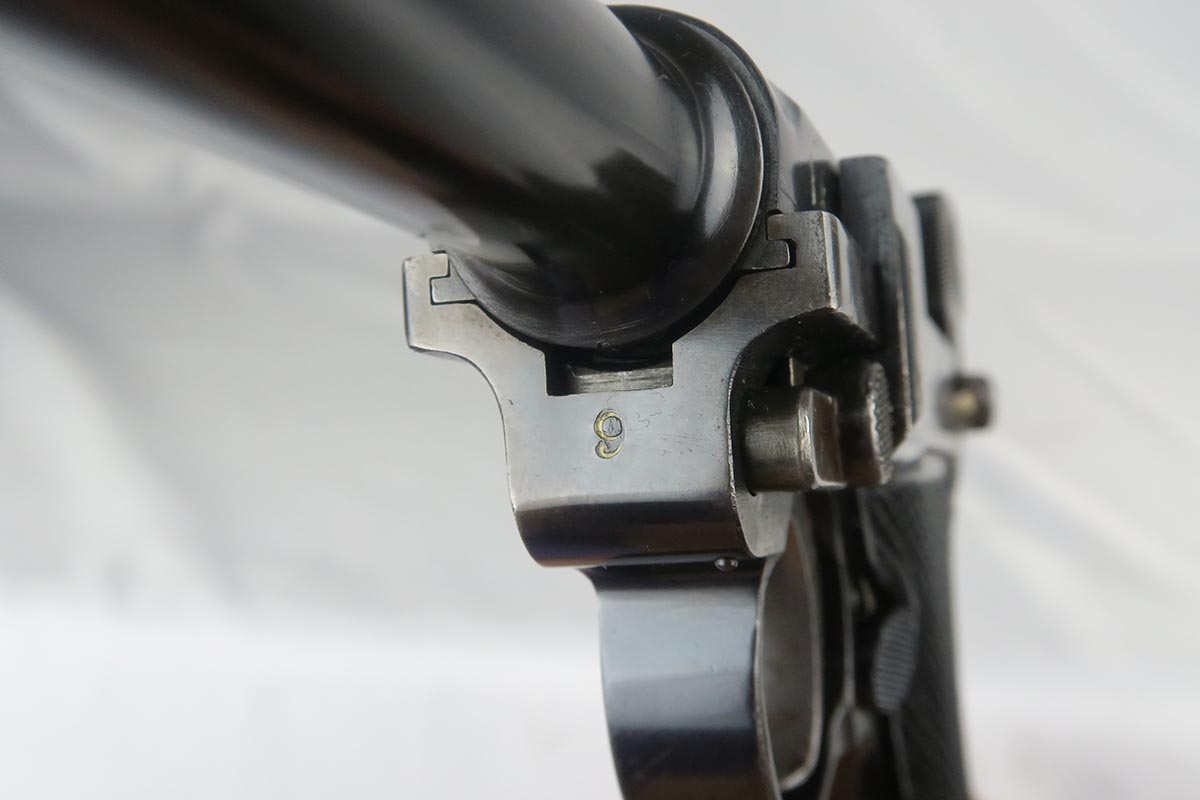 10/31/17 – This is an oddball luger that was put together from leftover Mauser and Krieghoff parts.  These guns were generally assembled after the war from wartime parts, and sold at the PX store in Germany so that GI’s had souvenirs to take home from their time in Germany.  This one shows serial number 9 on the frame and serial, but no other parts are numbered at all.  The barrel and receiver have Crown/N proofs, and there is a star proof(French?) on multiple parts (barrel, safety, internal sideplate, etc).  The pistol is chambered in .30 and has excellent Black Widow-style grips.  The finish on this one is a little difficult to rate, as there is brown showing through in a few areas, but there isn’t much rub wear or finish loss.  Excellent bore.