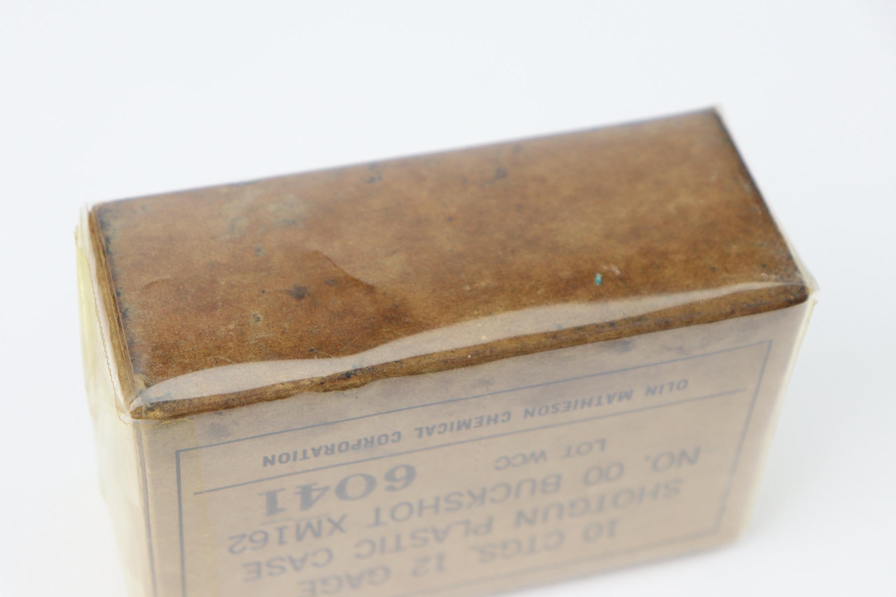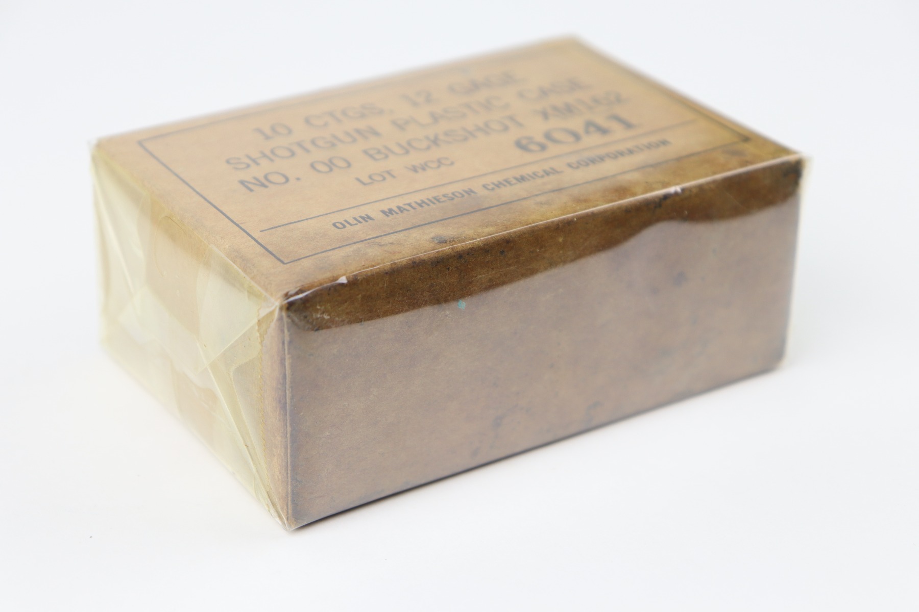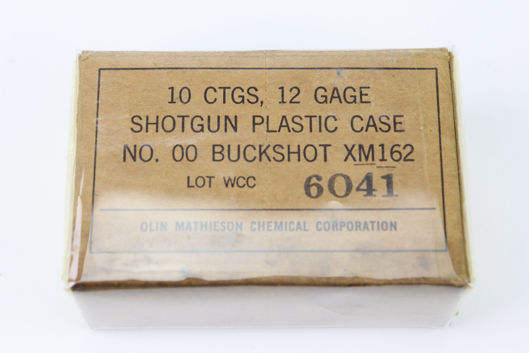 9/29/26 – This is a vintage box of 12 Gauge Shotgun Shells by Olin Mathieson Chemical Corp. The box is still sealed and covered in a protective plastic wrapping. The box label is marked, “LOT WCC 6041”. There’s some mild oil staining at the base of the box, but otherwise great condition.