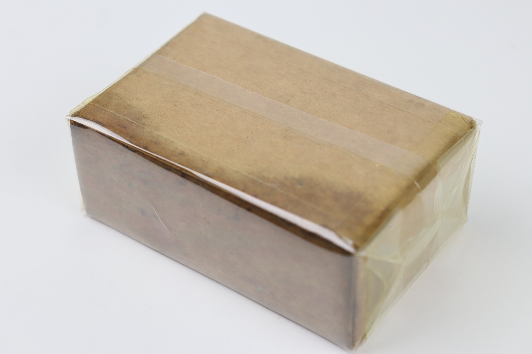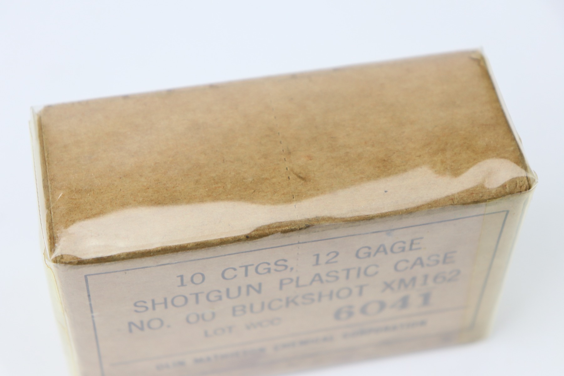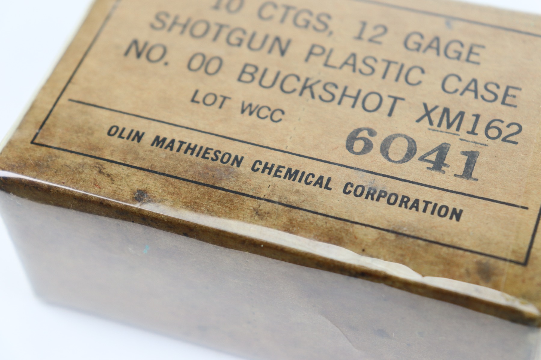 9/29/26 – This is a vintage box of 12 Gauge Shotgun Shells by Olin Mathieson Chemical Corp. The box is still sealed and covered in a protective plastic wrapping. The box label is marked, “LOT WCC 6041”. There’s some mild oil staining at the base of the box, but otherwise great condition.