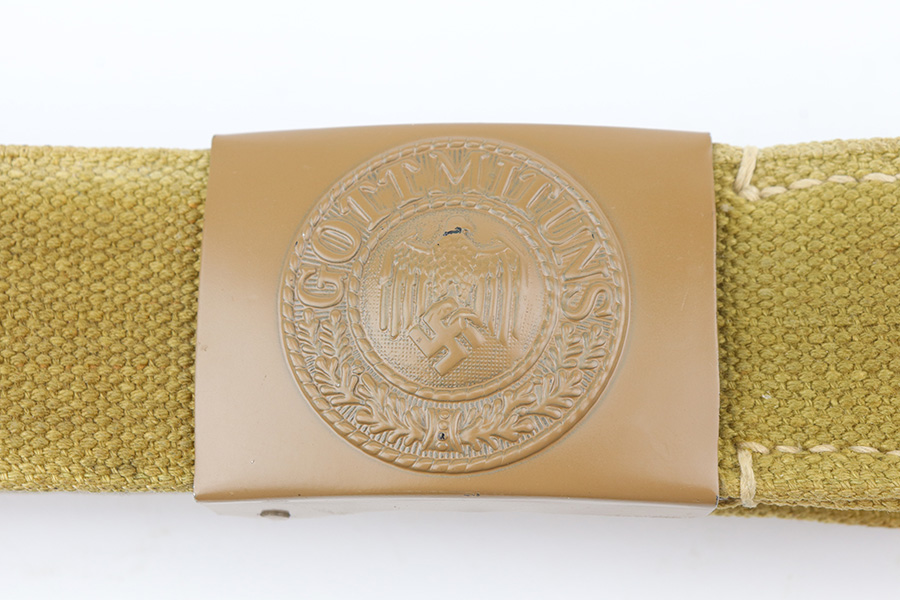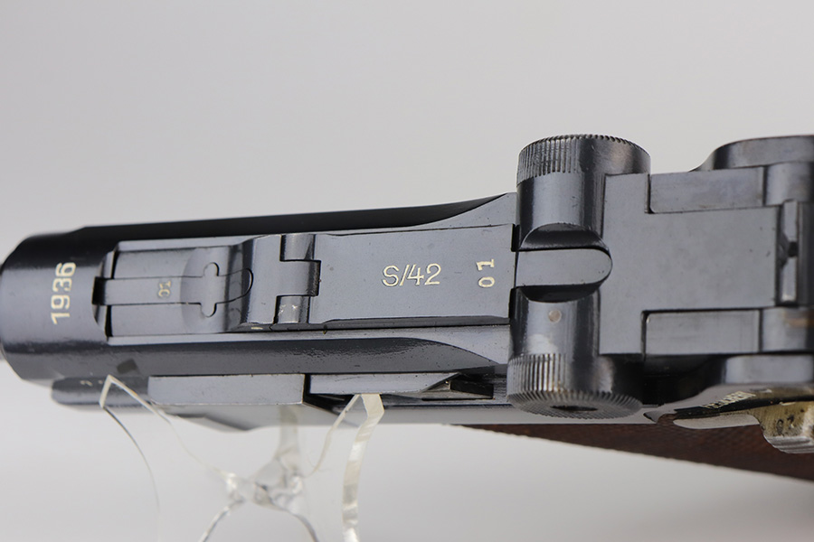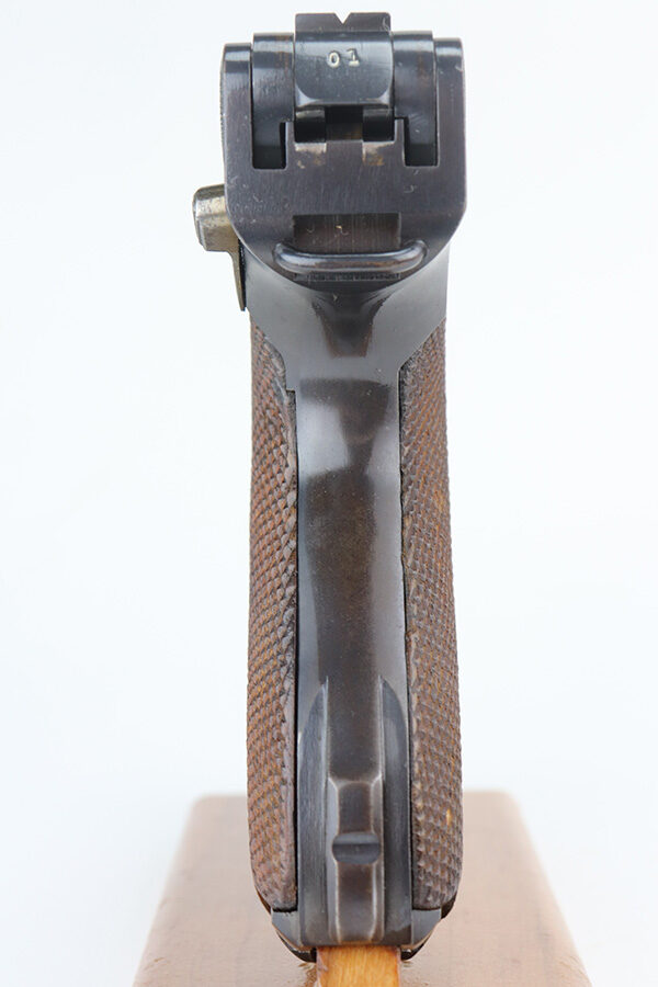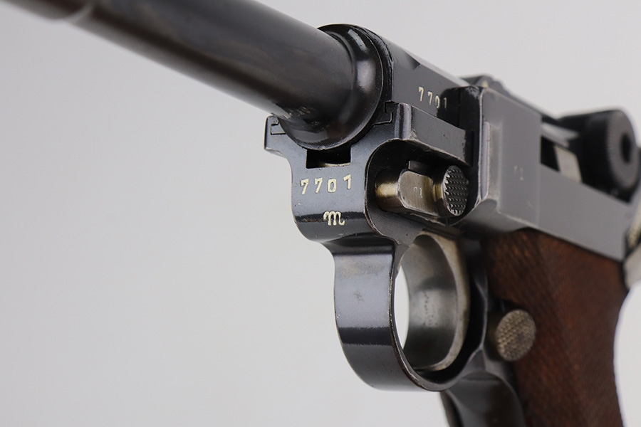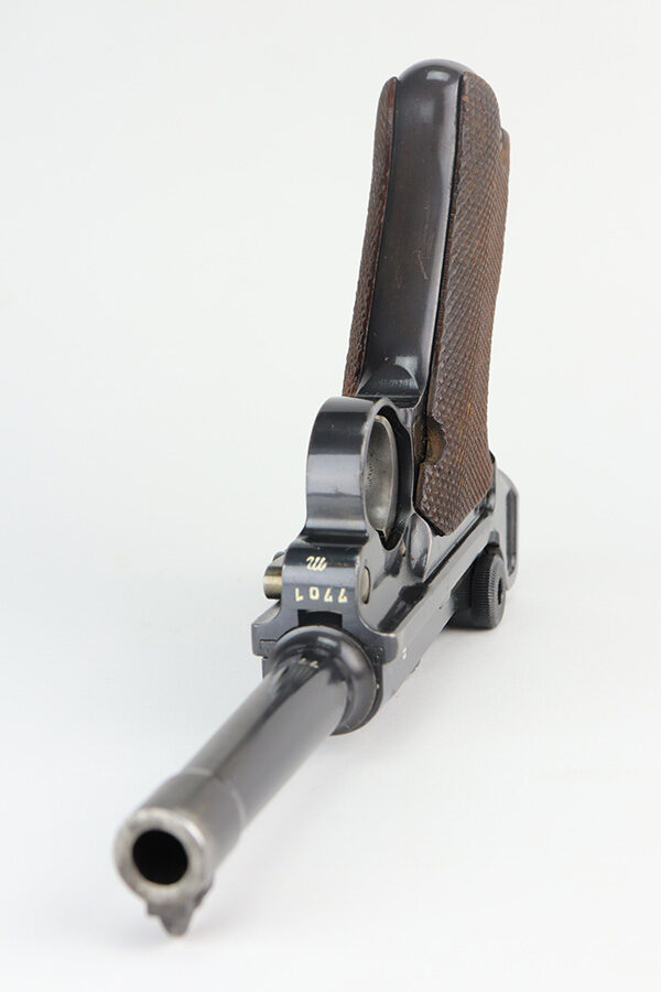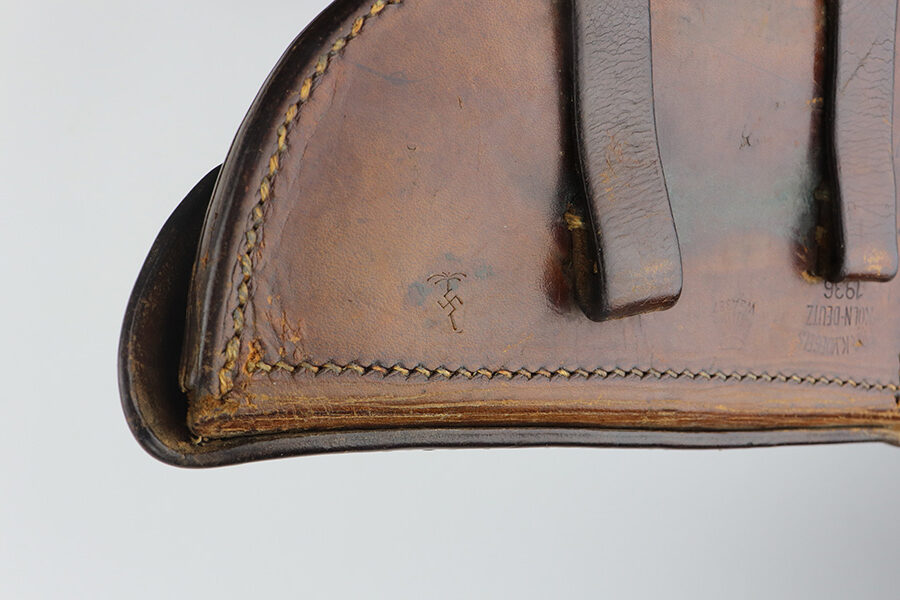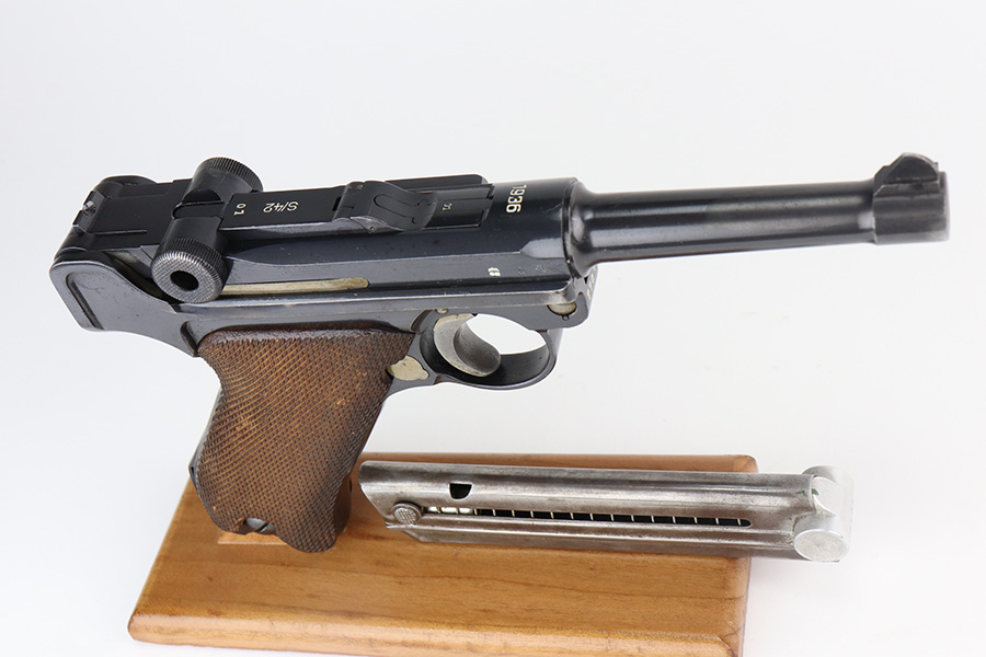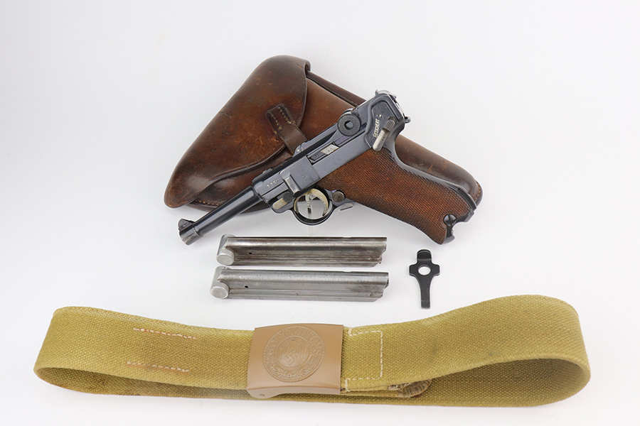 6/11/21 – This is truly a special Luger rig that we’ve never seen before. It is a 1936 Mauser Luger that was issued to the Afrikorps division of the Nazi military in the 1940’s. The gun is dated 1936, all matching, and has the proper “Eagle 63” military proofs. The rig comes with a very unique tropical-marked 1936-dated holster (we’ve never seen one like it!), an “Eagle 63” tool, two original matching magazines, and a mint “Gott Mit Uns” tropical belt buckle and tropical canvas belt. This is quite the assembly! The gun has retained about 95% of its original finish. There are areas of very minor wear on the side plate, side rails, and around the muzzle. Some very tiny freckling on the straps and left side of the frame. Comes with excellent un-numbered grips. Minty bore.