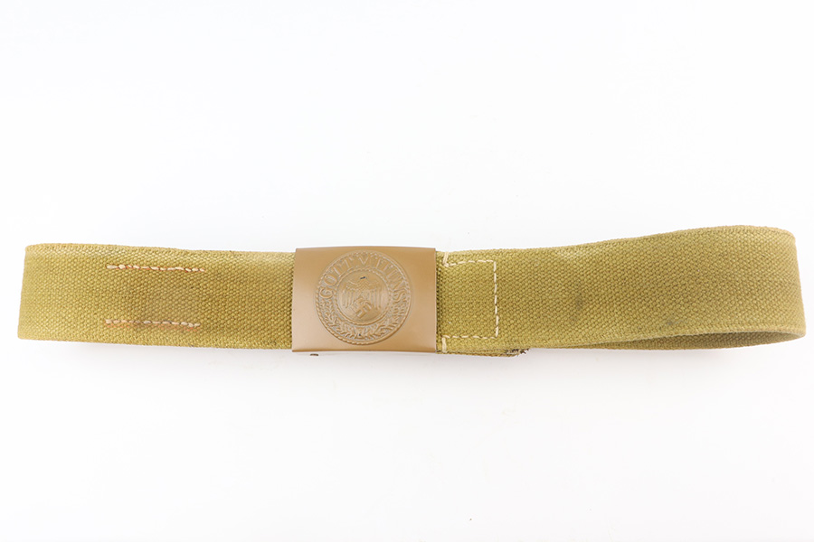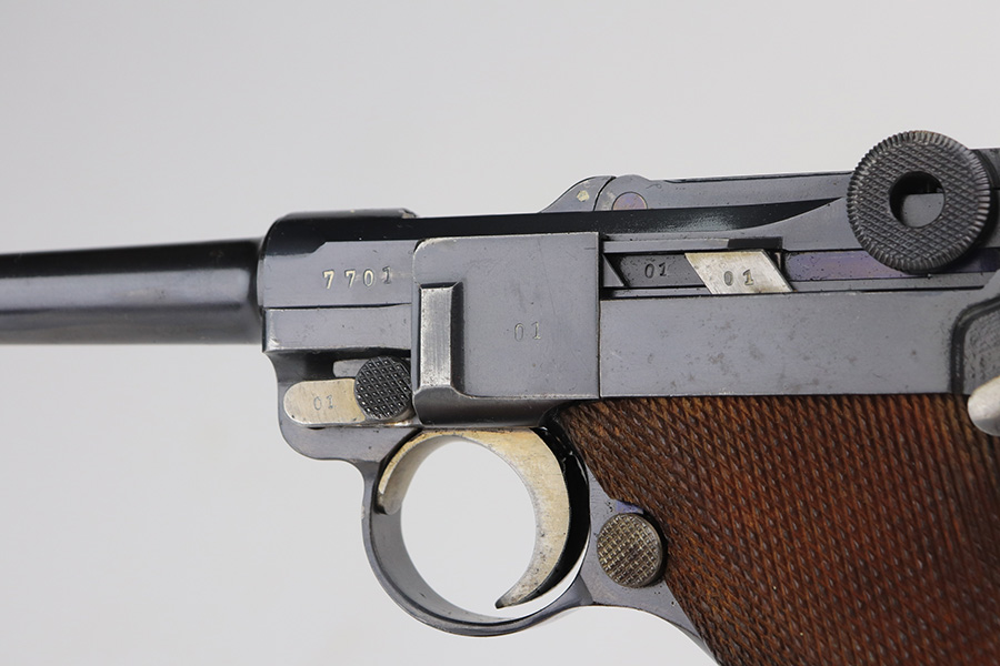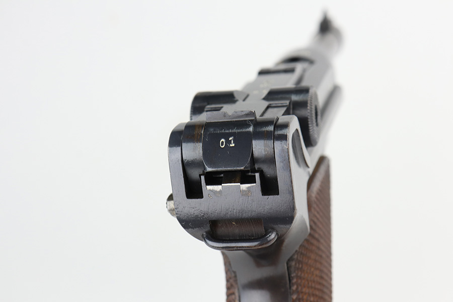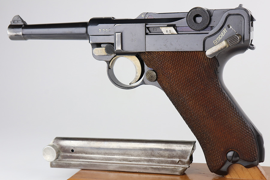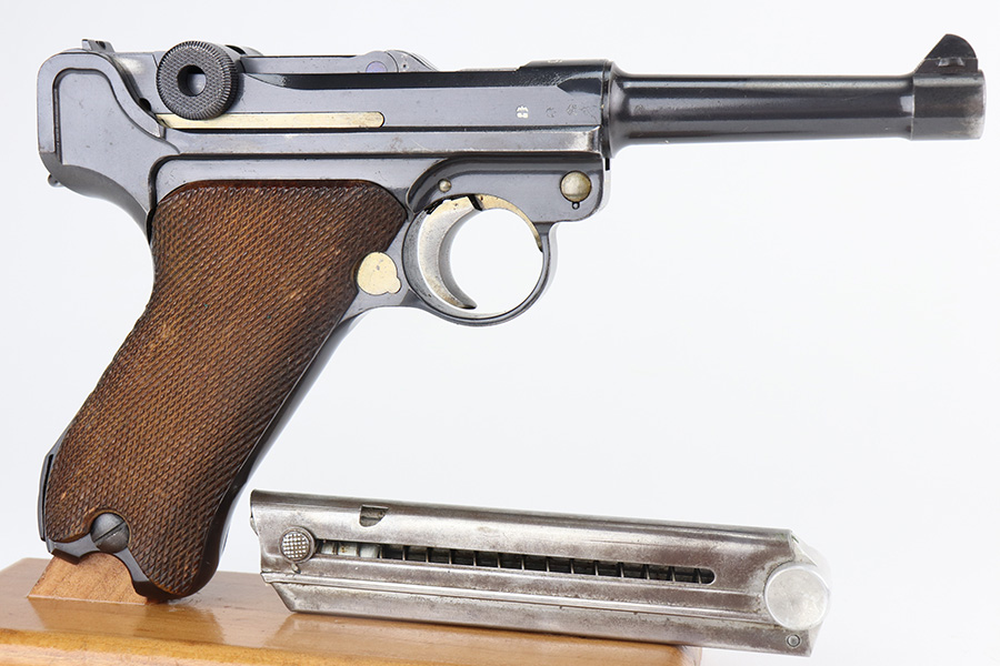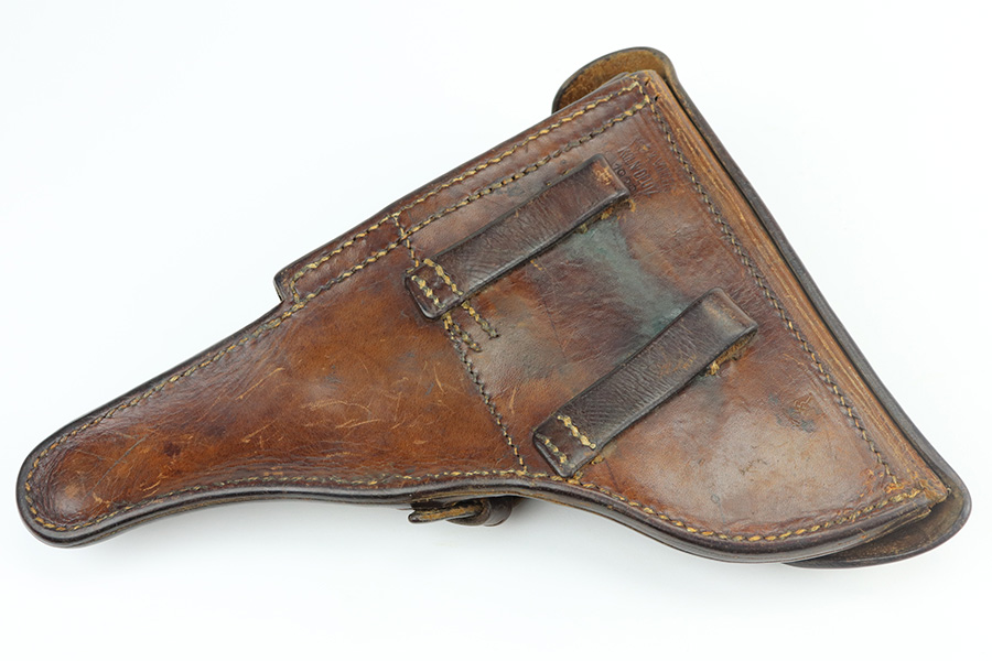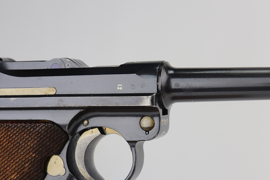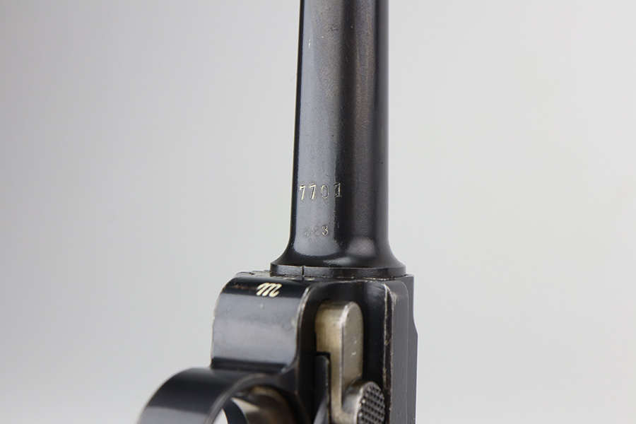 6/11/21 – This is truly a special Luger rig that we’ve never seen before. It is a 1936 Mauser Luger that was issued to the Afrikorps division of the Nazi military in the 1940’s. The gun is dated 1936, all matching, and has the proper “Eagle 63” military proofs. The rig comes with a very unique tropical-marked 1936-dated holster (we’ve never seen one like it!), an “Eagle 63” tool, two original matching magazines, and a mint “Gott Mit Uns” tropical belt buckle and tropical canvas belt. This is quite the assembly! The gun has retained about 95% of its original finish. There are areas of very minor wear on the side plate, side rails, and around the muzzle. Some very tiny freckling on the straps and left side of the frame. Comes with excellent un-numbered grips. Minty bore.