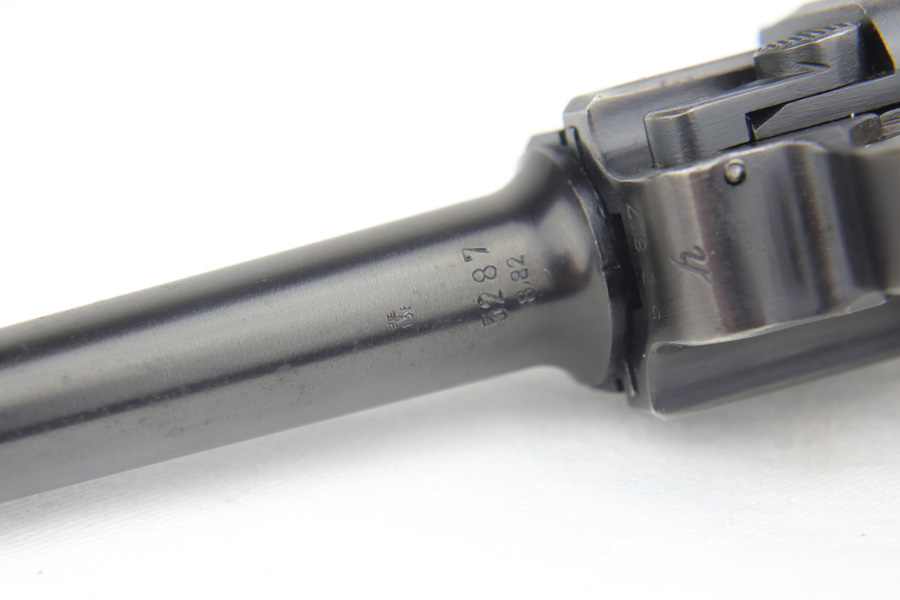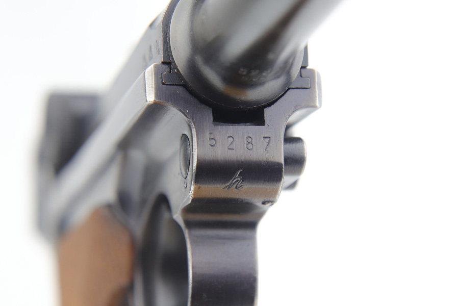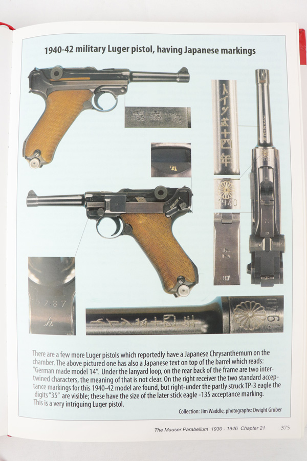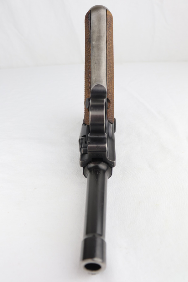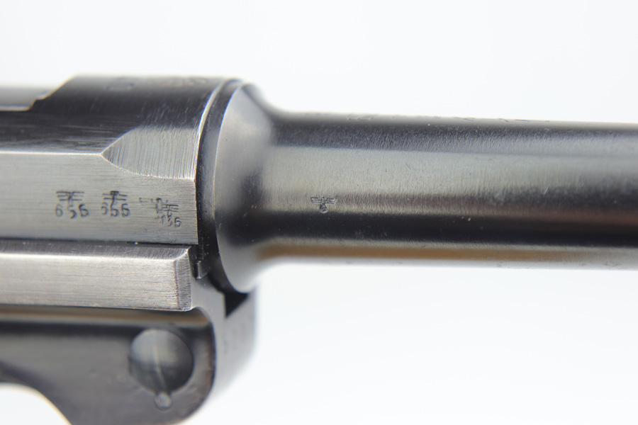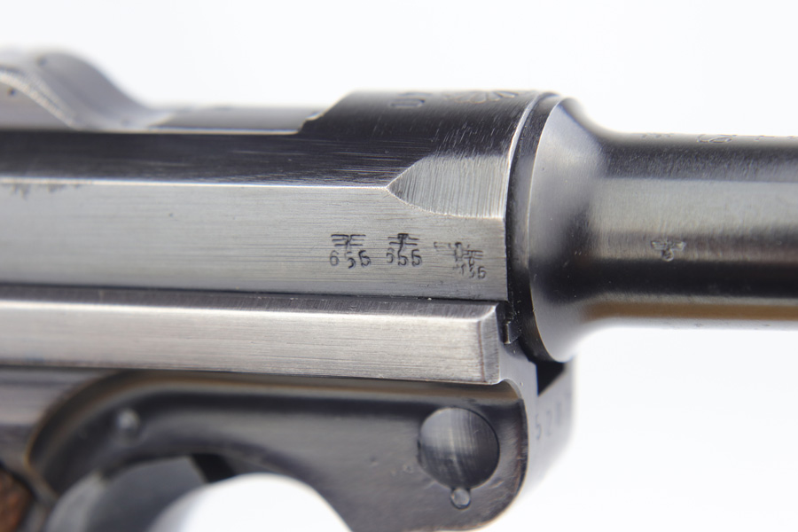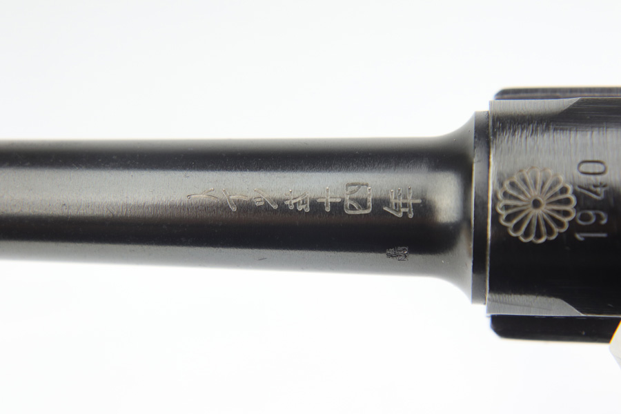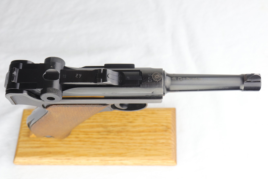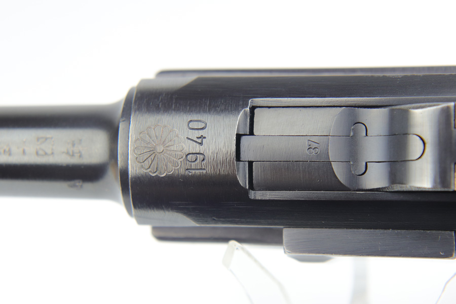 12/28/18 – This is a very rare and unique Luger. It is a 1940 Nazi proofed Military luger, but with a Japanese Mum and writing on the barrel. The gun is documented in Jan Still’s Third Reich Lugers, and also Hallock and Van de Kant’s Mauser Luger book. This exact gun from the Jim Waddle collection is pictured in the book on page 375. There are a few known Japanese Presentation pieces, only 2 that look like this one (That I have seen). While I am not sure who or when this gun was presented, I am convinced that it was a Japanese presented Luger in or around 1941 – 1942. One source indicates these were part of the Japanese Diplomatic Corp in Berlin. This has not been confirmed. In full disclosure though, some collectors believe these Lugers to be faked. There are several clues to indicate this may be “real”. These anomalies are mentioned in the book. First, this gun has tiny Japanese characters on the back of the frame and then again at the bottom of frame (same placement as the Baby Nambu). While the gun is dated 1940, it has both 655 and 135 proofs on the frame and the barrel. Mauser did not use the Eagle 135 proof until 1942. So clearly this gun was made in 1940, but then set aside or sent back to the factory in or about 1942 for additional proofs and presentation inscription. I have not heard of that before with Mauser, but among Walther collectors we know that presentation guns were pulled off the assembly line and then often given later proofs and inscriptions just before presentation. These anomalies would not have entered the imagination of a “faker”; AND anyone with this level of sophistication would at least have given the gun a matching magazine and better finish on the grip straps. The condition of the gun is very good, except for the thin finish on the straps.. It is all matching with the exception of the magazine and the grips are not numbered. The bore is very good. Shiny, with only minor corrosion in the grooves. Guaranteed authentic and original.