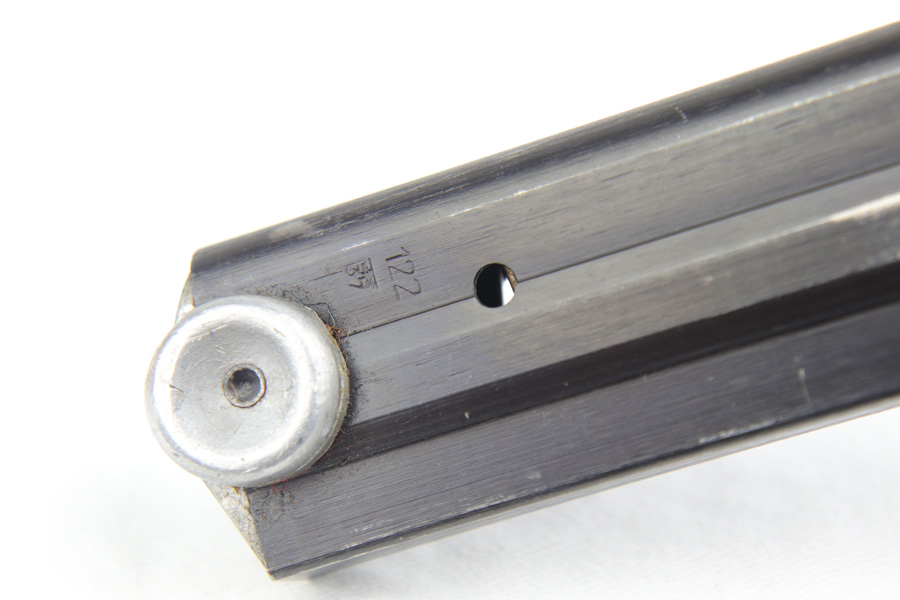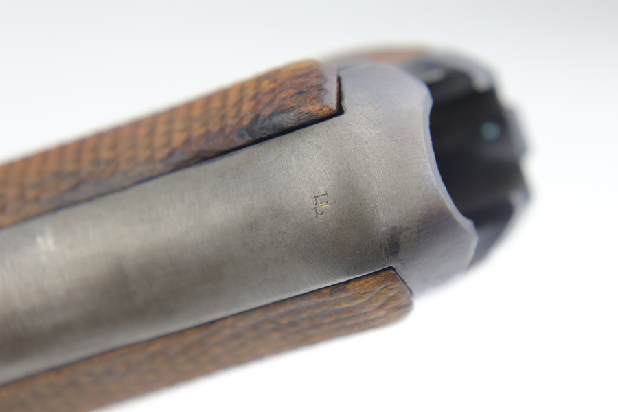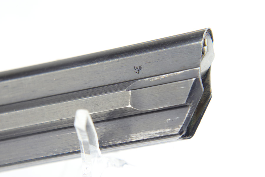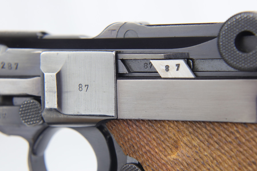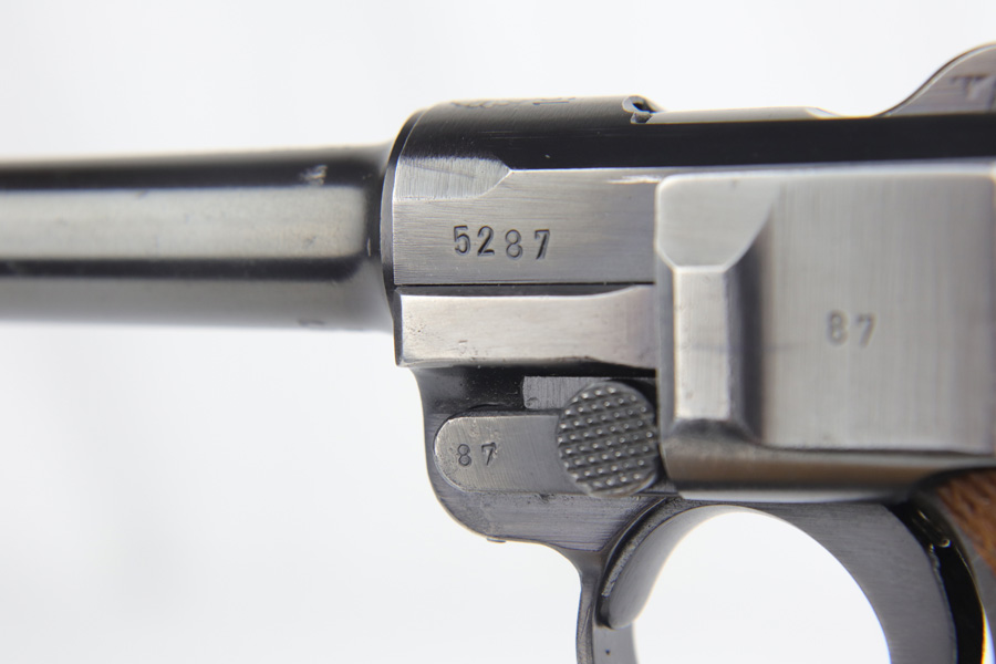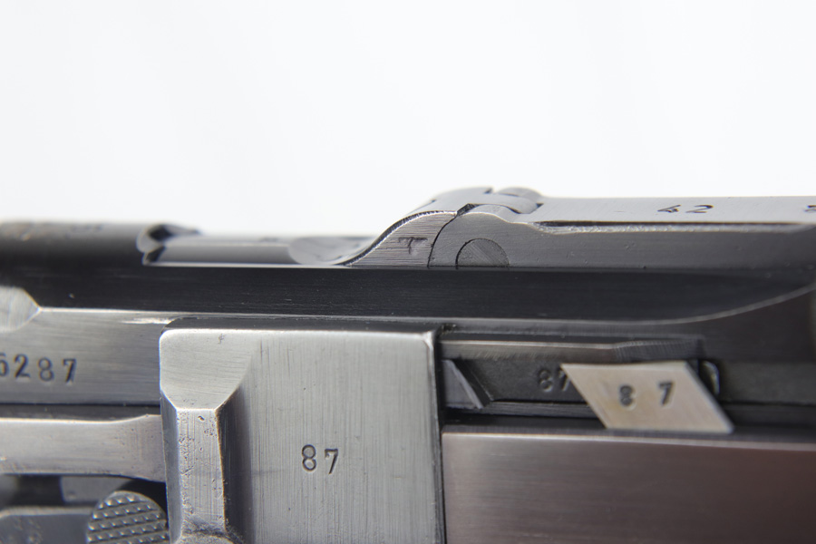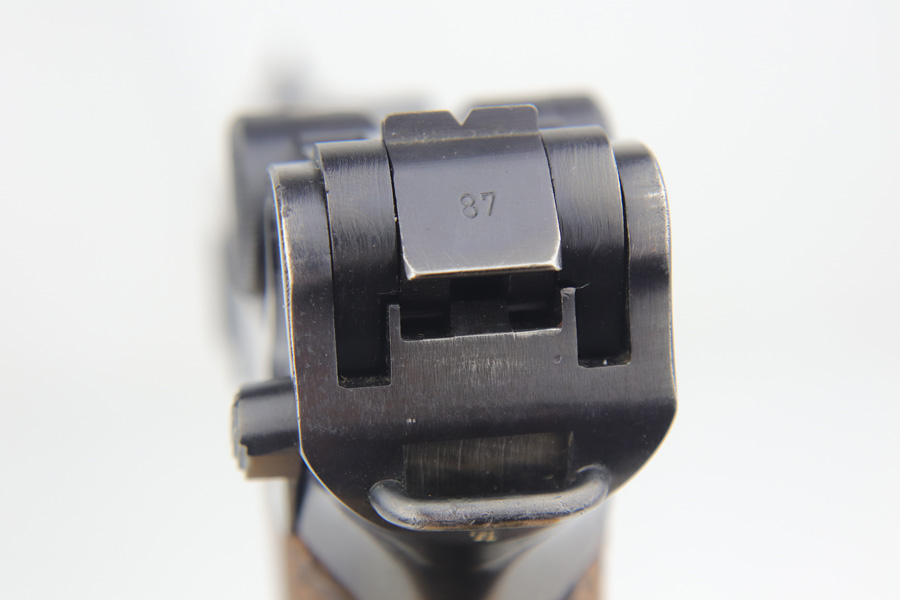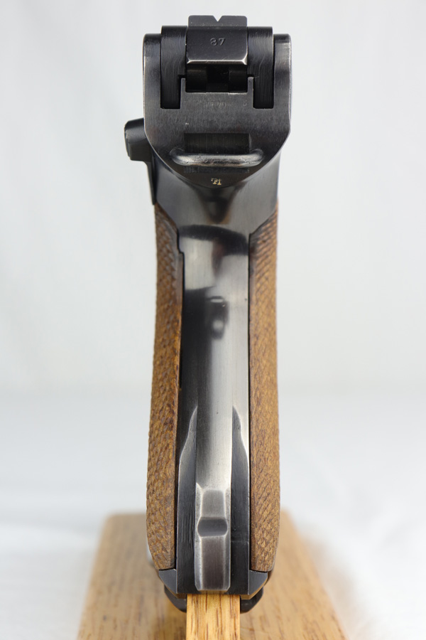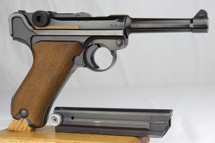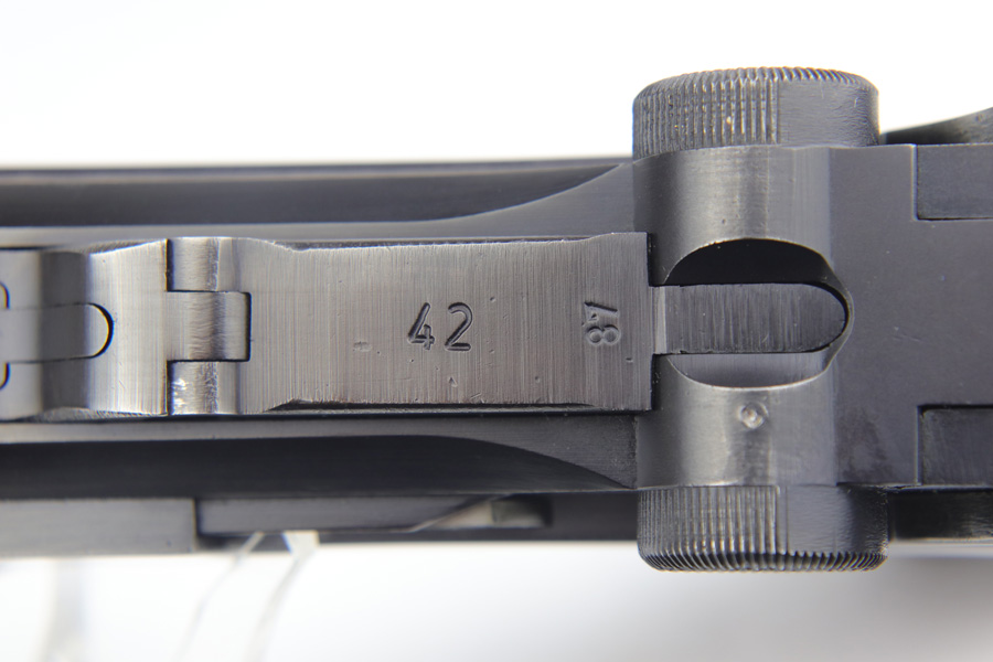 12/28/18 – This is a very rare and unique Luger. It is a 1940 Nazi proofed Military luger, but with a Japanese Mum and writing on the barrel. The gun is documented in Jan Still’s Third Reich Lugers, and also Hallock and Van de Kant’s Mauser Luger book. This exact gun from the Jim Waddle collection is pictured in the book on page 375. There are a few known Japanese Presentation pieces, only 2 that look like this one (That I have seen). While I am not sure who or when this gun was presented, I am convinced that it was a Japanese presented Luger in or around 1941 – 1942. One source indicates these were part of the Japanese Diplomatic Corp in Berlin. This has not been confirmed. In full disclosure though, some collectors believe these Lugers to be faked. There are several clues to indicate this may be “real”. These anomalies are mentioned in the book. First, this gun has tiny Japanese characters on the back of the frame and then again at the bottom of frame (same placement as the Baby Nambu). While the gun is dated 1940, it has both 655 and 135 proofs on the frame and the barrel. Mauser did not use the Eagle 135 proof until 1942. So clearly this gun was made in 1940, but then set aside or sent back to the factory in or about 1942 for additional proofs and presentation inscription. I have not heard of that before with Mauser, but among Walther collectors we know that presentation guns were pulled off the assembly line and then often given later proofs and inscriptions just before presentation. These anomalies would not have entered the imagination of a “faker”; AND anyone with this level of sophistication would at least have given the gun a matching magazine and better finish on the grip straps. The condition of the gun is very good, except for the thin finish on the straps.. It is all matching with the exception of the magazine and the grips are not numbered. The bore is very good. Shiny, with only minor corrosion in the grooves. Guaranteed authentic and original.