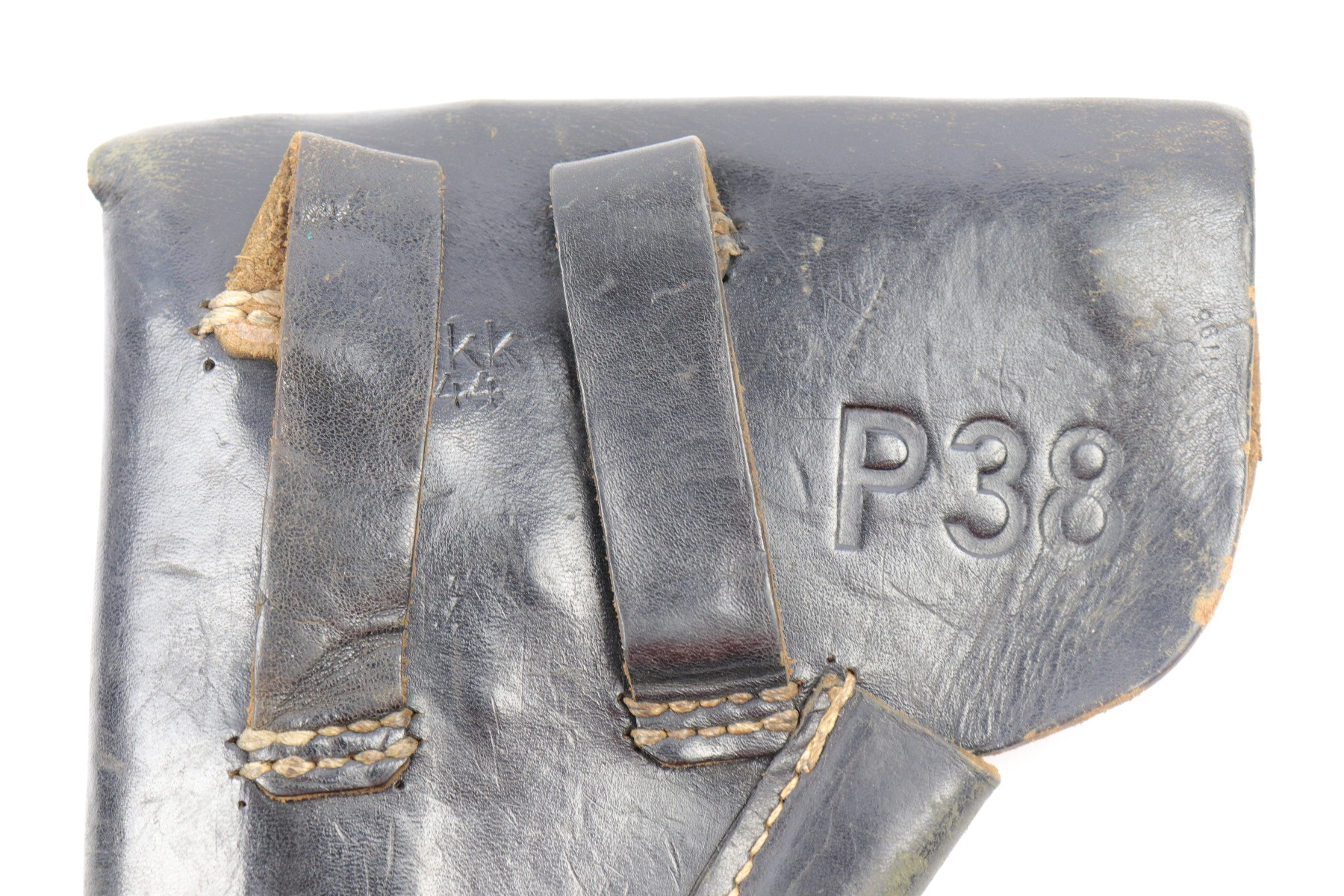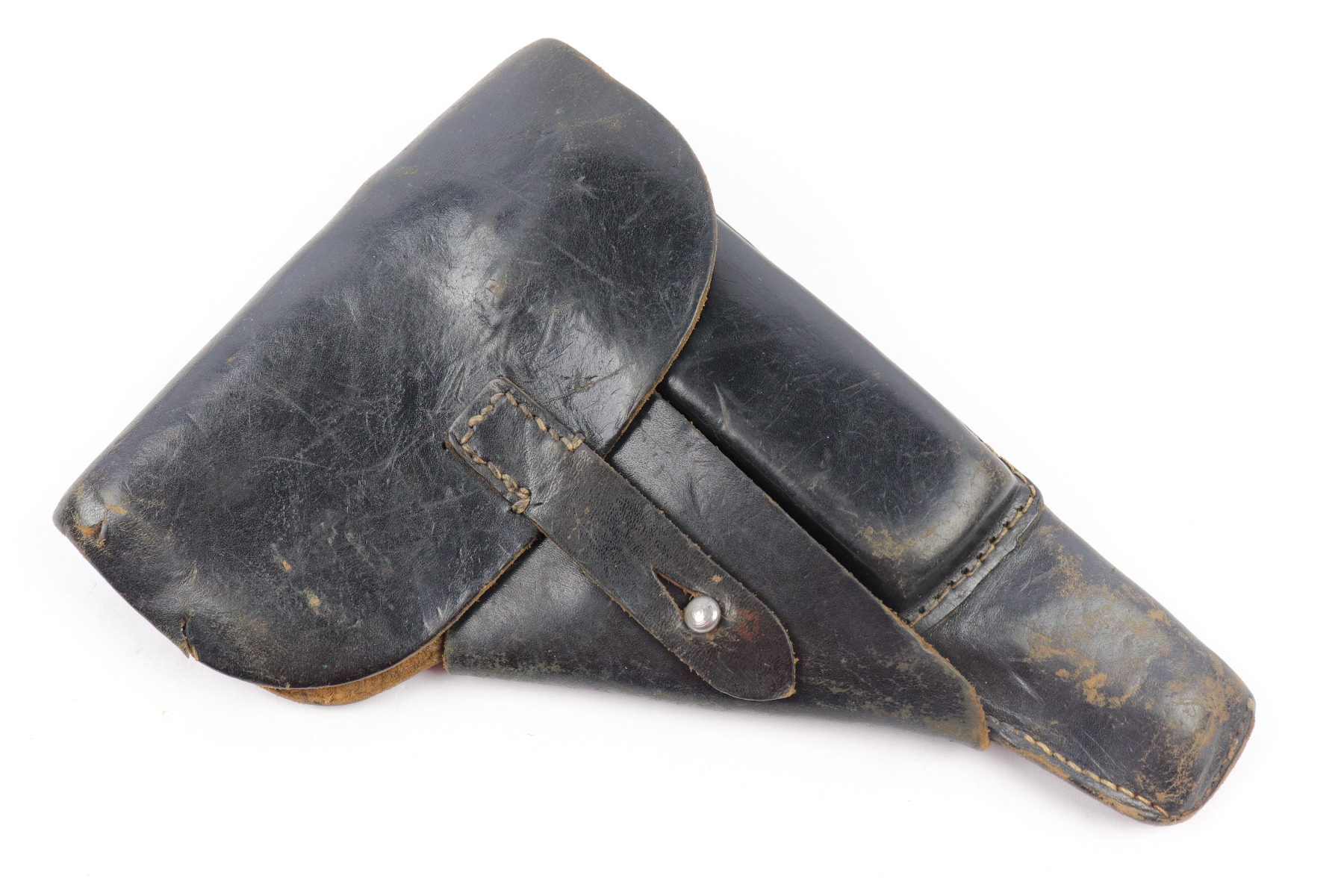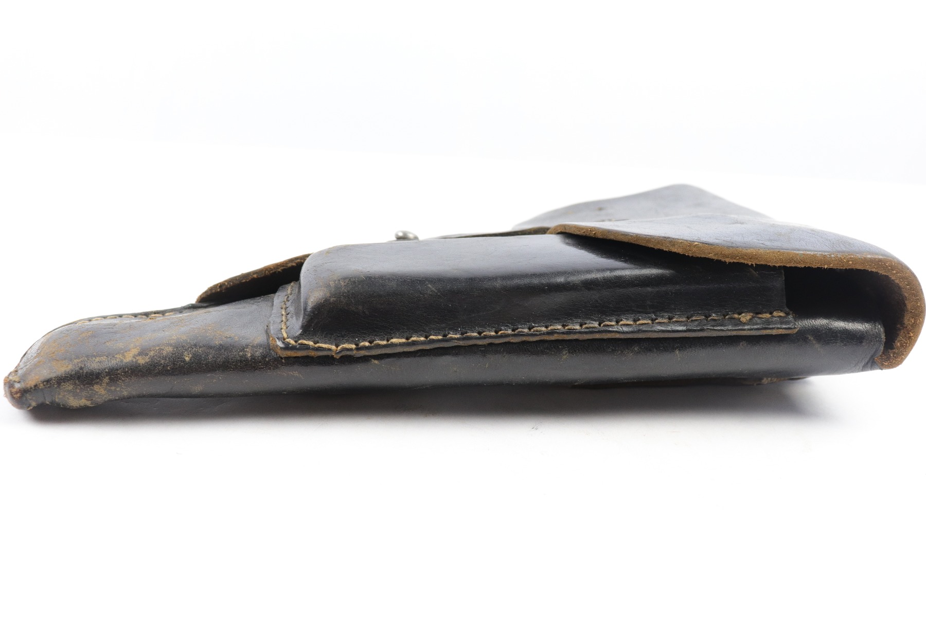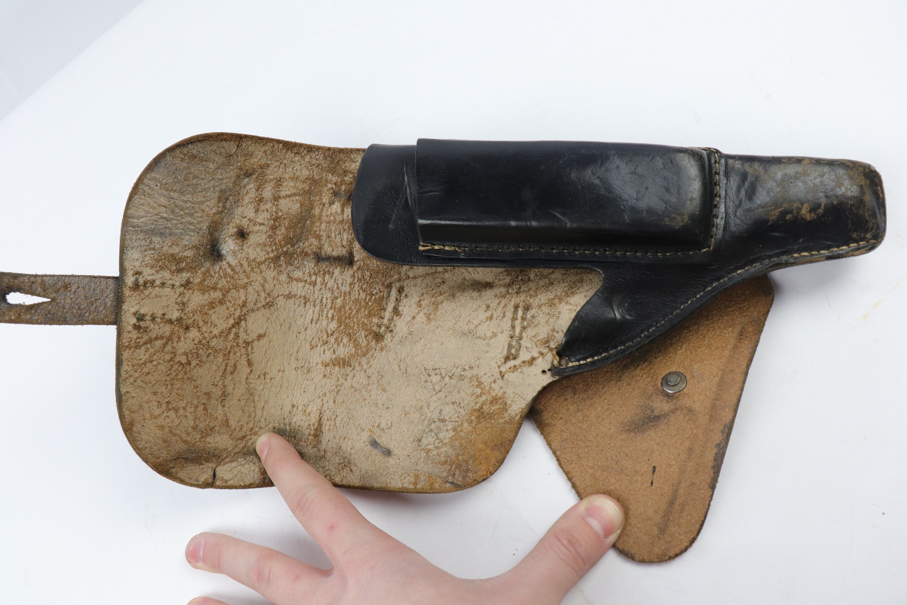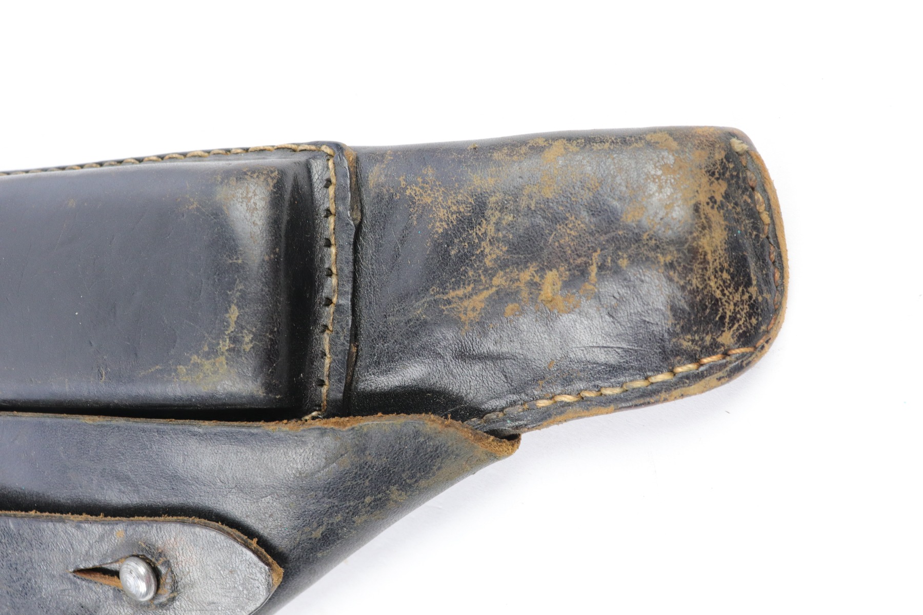 4/10/18 – This is an original late WW2 production soft-shell P.38 holster. The holster is desirable due to the 1-piece-leather construction, as opposed to having a seam at the top leather like most softshell holsters have. The holster is in good condition overall but does have a few minor flaws. There’s a small cut in the leather on the left edge (when looking at the first photo) – we added a close-up of this flaw. There is also minor scuffing on the toe of the holster. The interior leather is in good condition though and the stitching is all original. Guaranteed original and authentic.