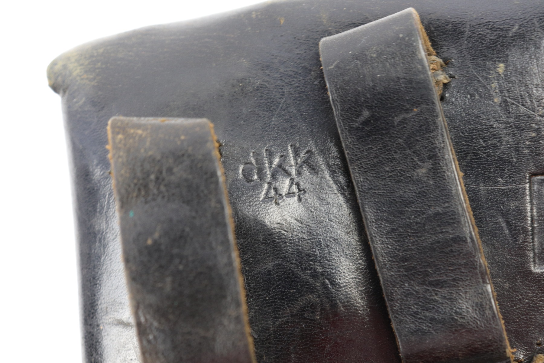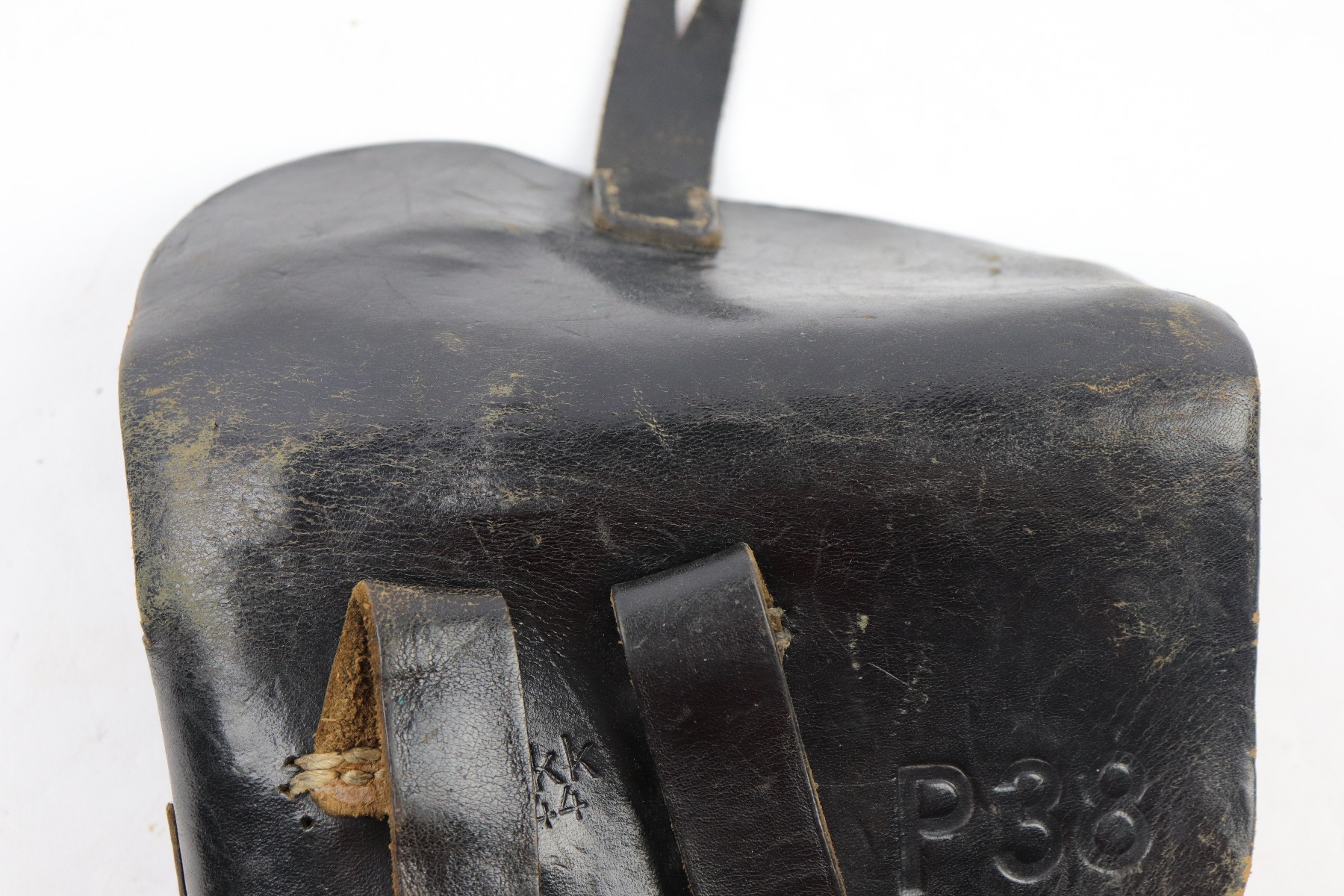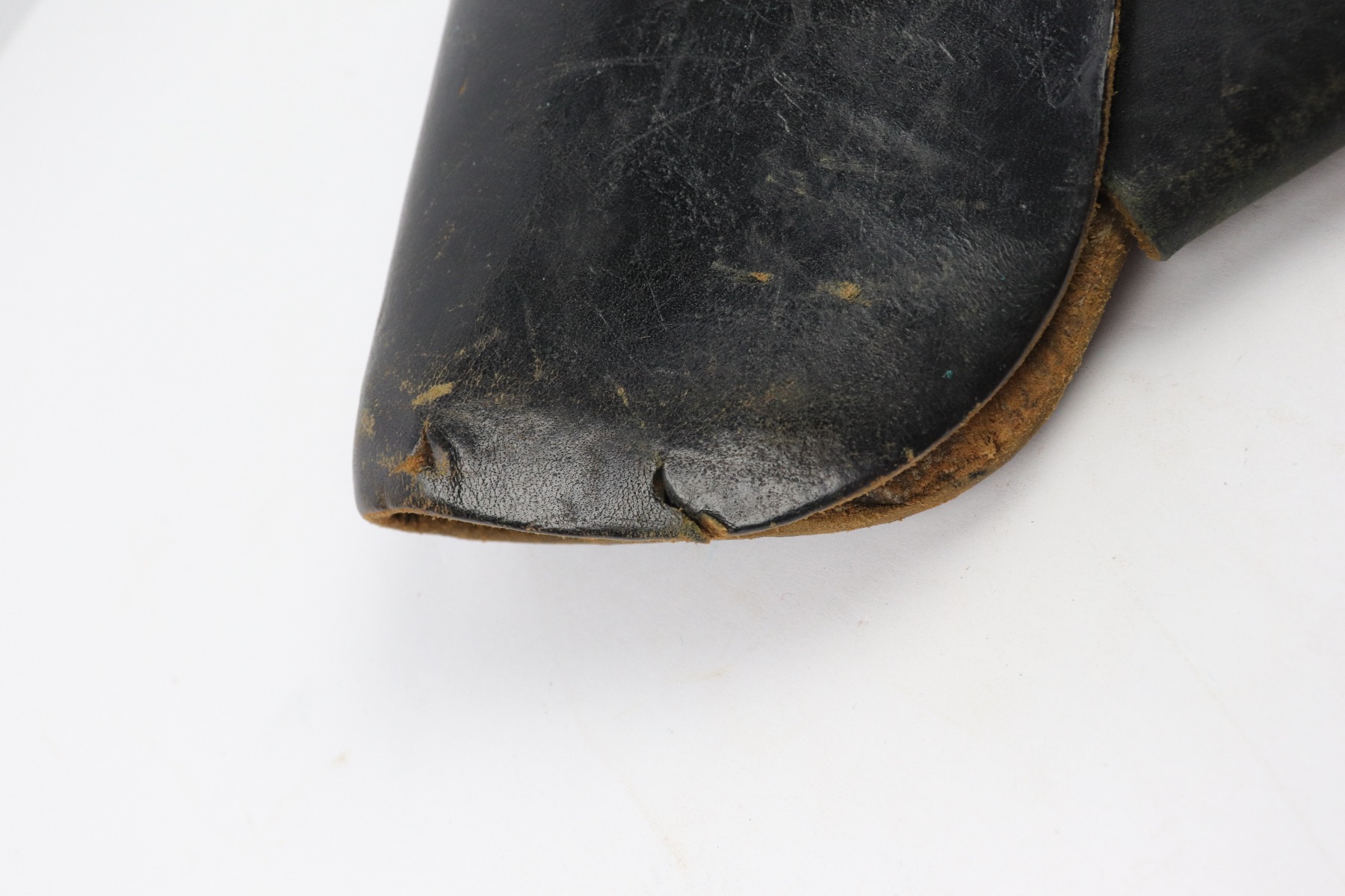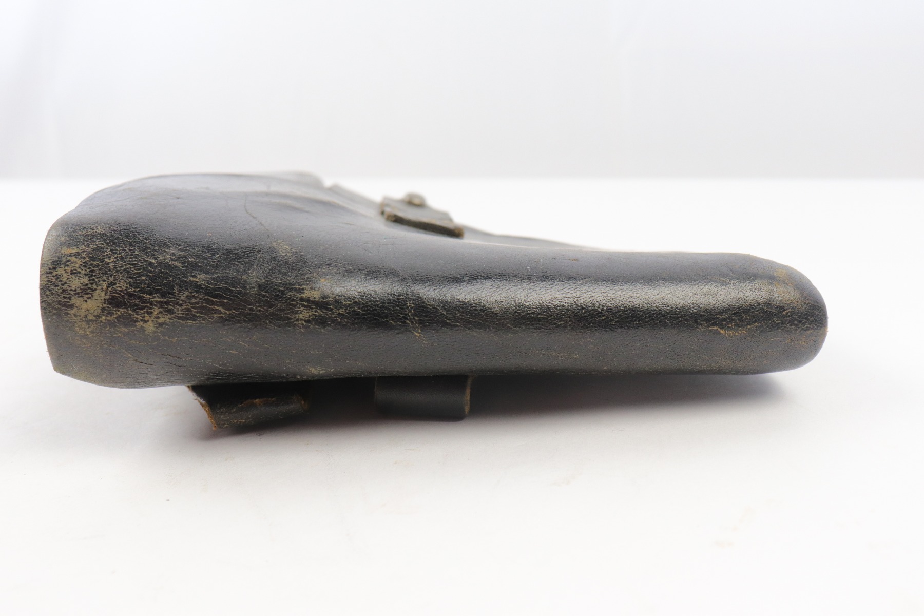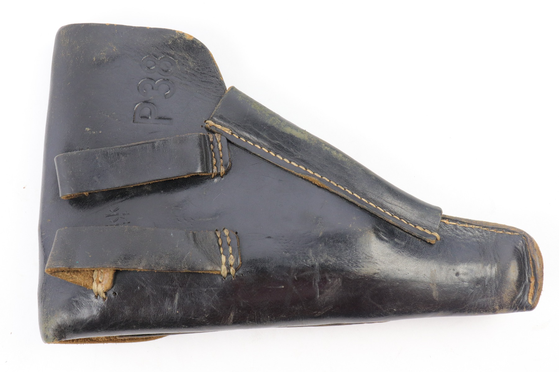 4/10/18 – This is an original late WW2 production soft-shell P.38 holster. The holster is desirable due to the 1-piece-leather construction, as opposed to having a seam at the top leather like most softshell holsters have. The holster is in good condition overall but does have a few minor flaws. There’s a small cut in the leather on the left edge (when looking at the first photo) – we added a close-up of this flaw. There is also minor scuffing on the toe of the holster. The interior leather is in good condition though and the stitching is all original. Guaranteed original and authentic.