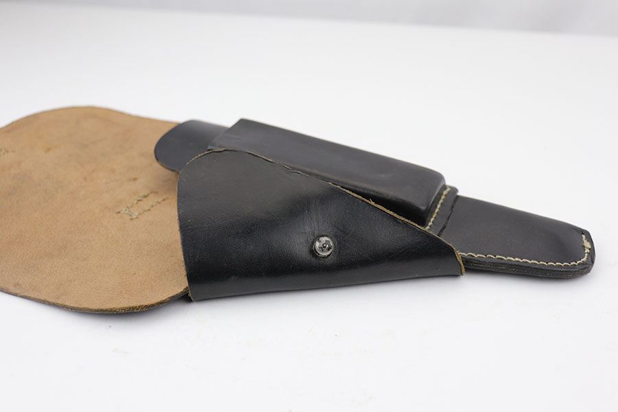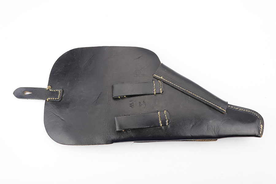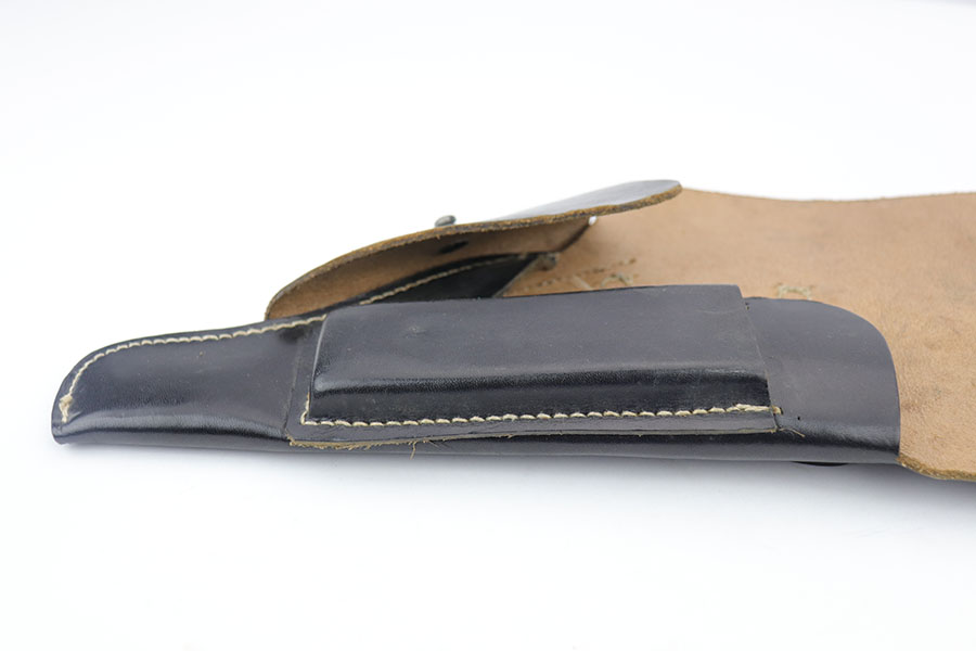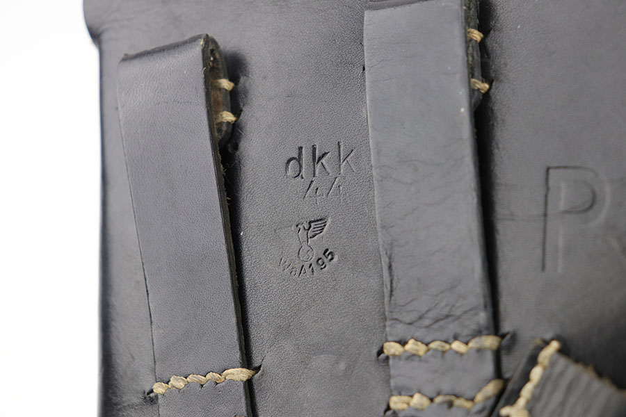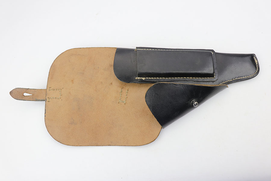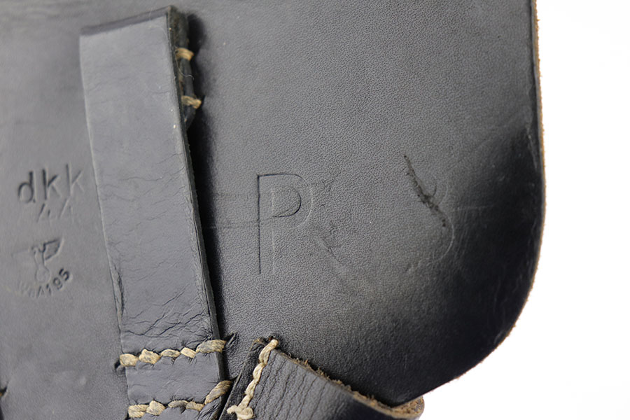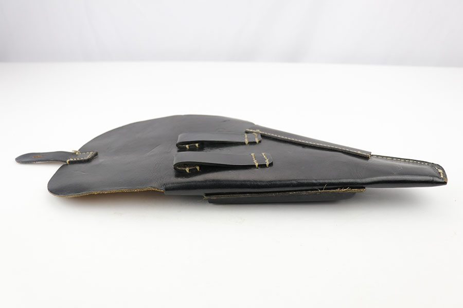 12/17/19 – This is a minty, unissued condition P.38 holster made at the end of WW2. The holster is the scarce one-piece variation, meaning the holster doesn’t have the two extra lines of stitching that attach the “lid” to the “body” of leather. There are far fewer one-piece variation softshell holsters than those that are two-piece. Well stamped on the back leather, and appears to never have held a pistol before (or if it did, not for long).