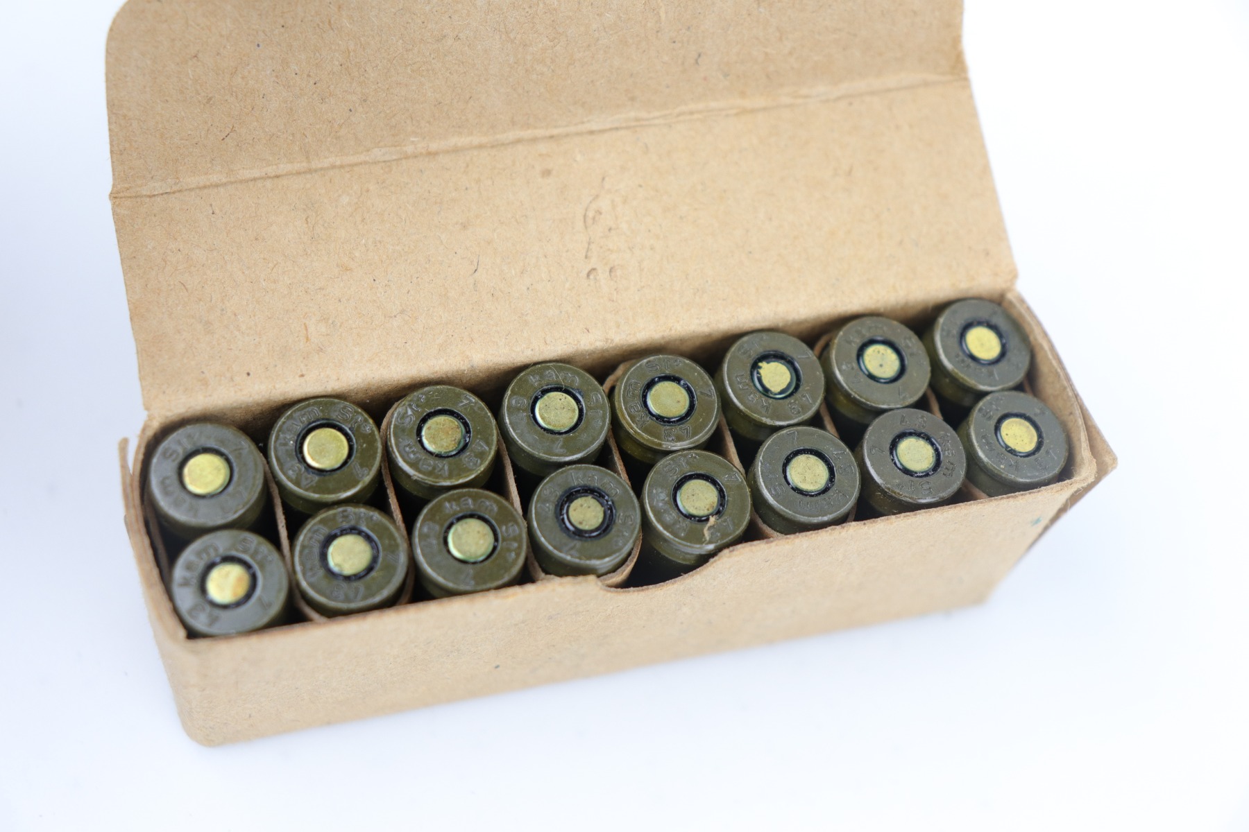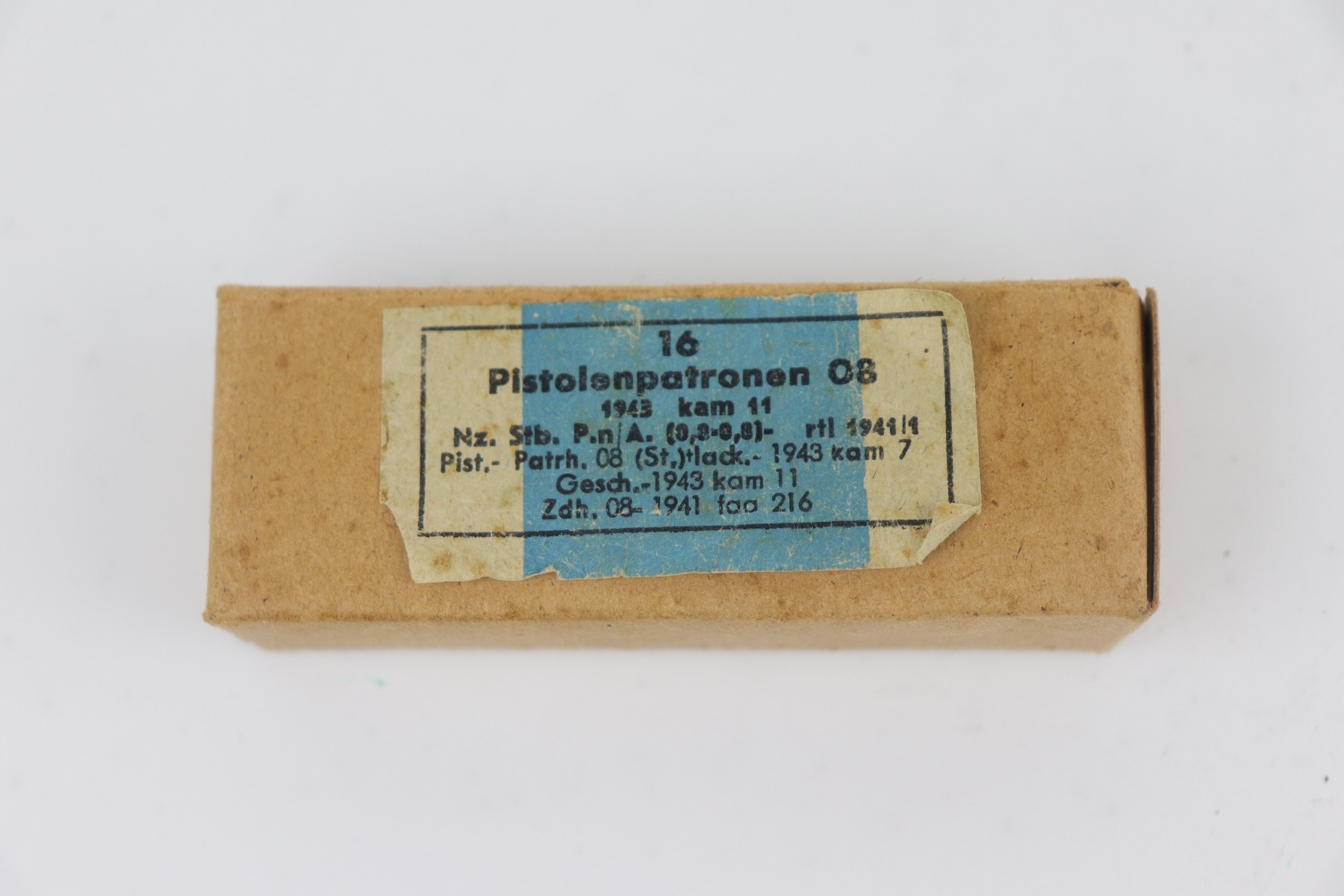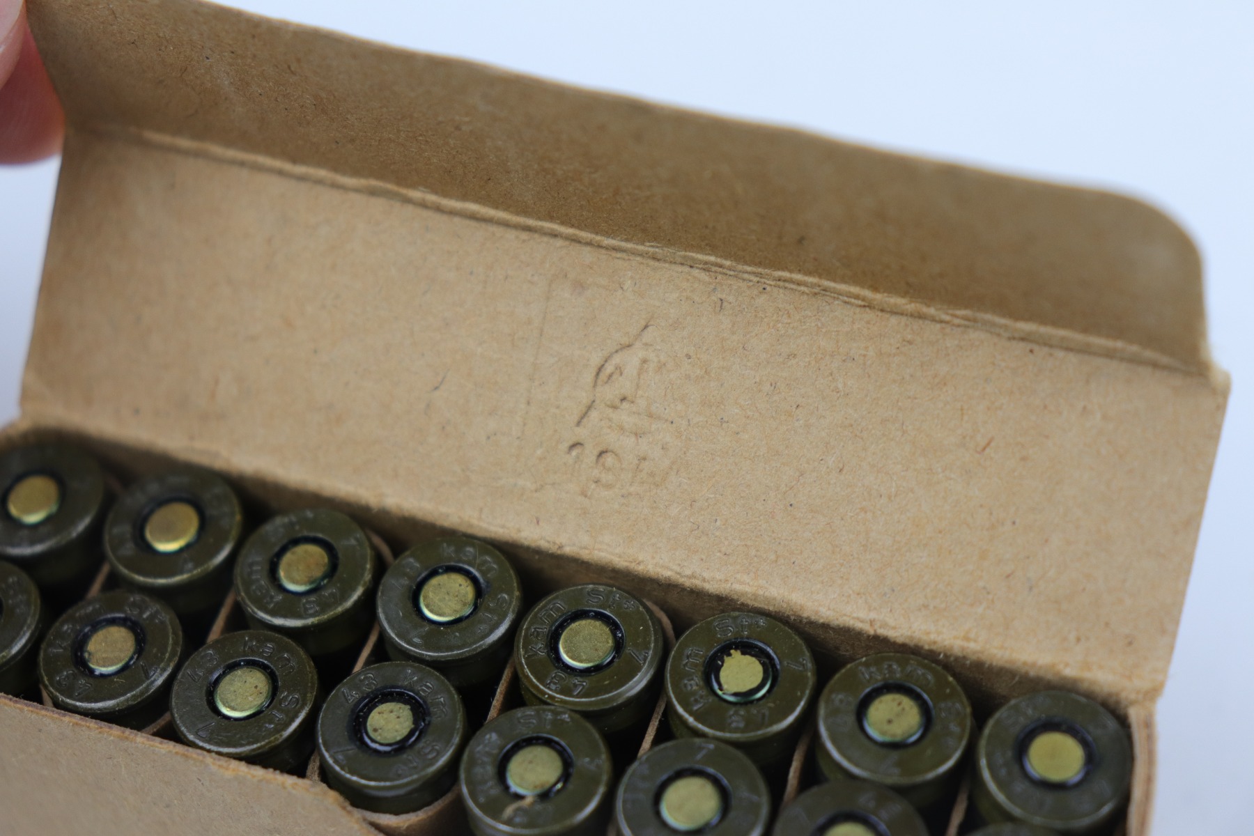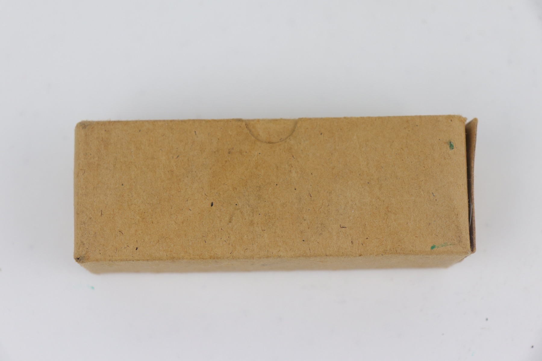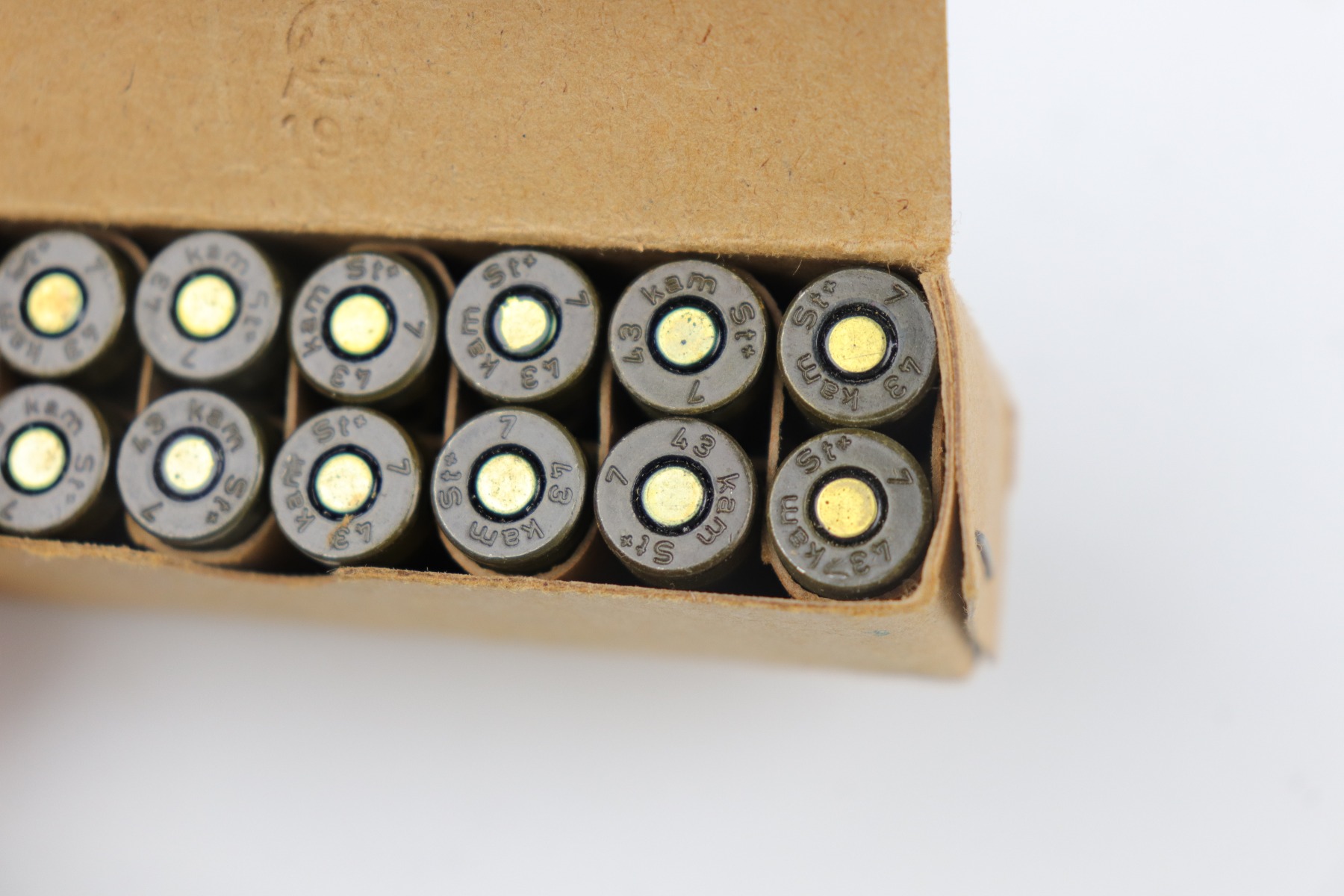 7/28/20 – This is an original box of 1943 German 9mm Luger ammo. It is in excellent condition. The original is still in tact but is peeling up around the edges. It is dated 1943. The box has 16 cartridges. The head stamps read “43 kam St+ 7”.